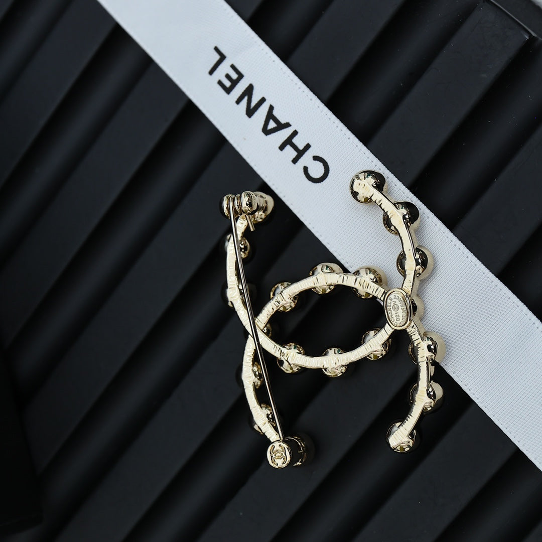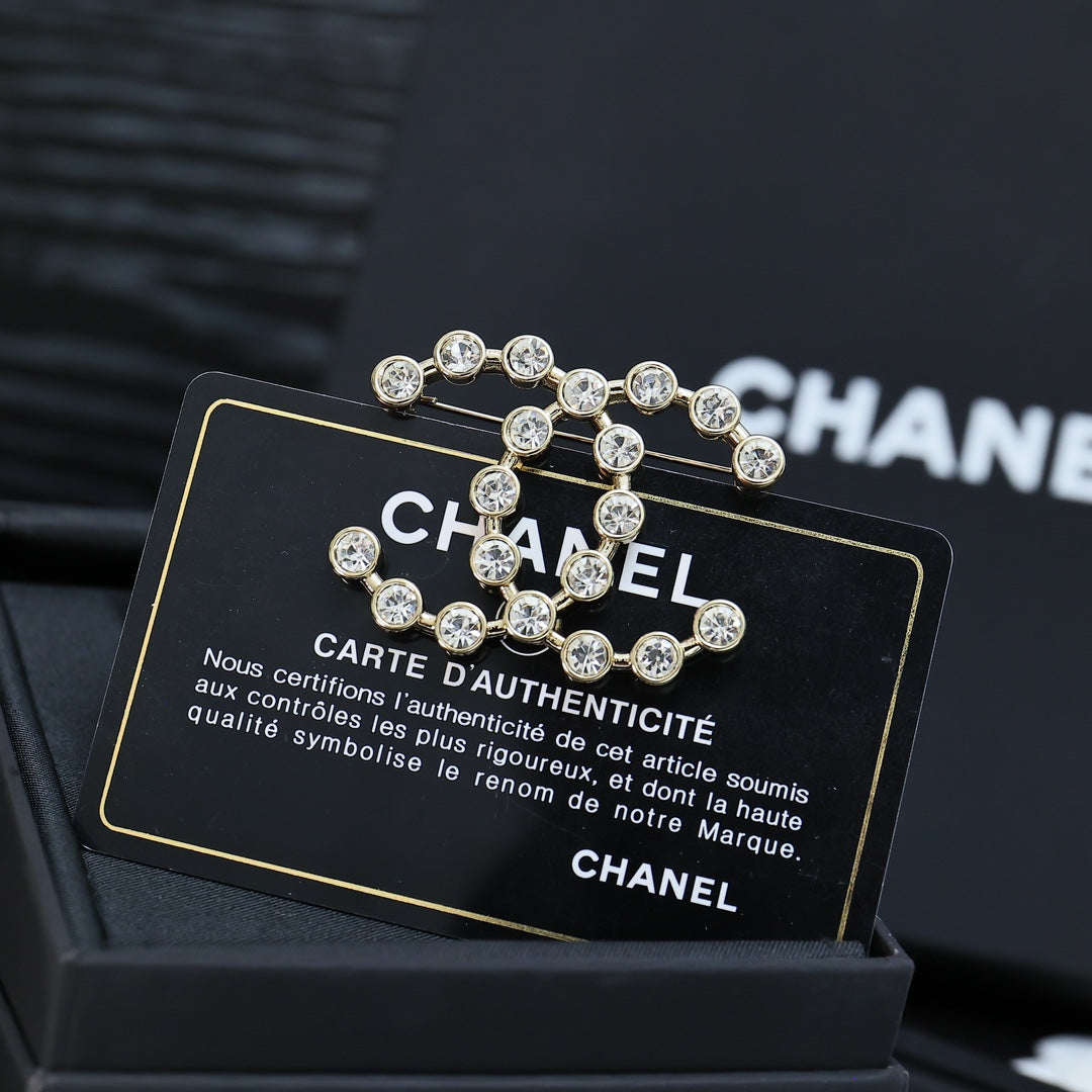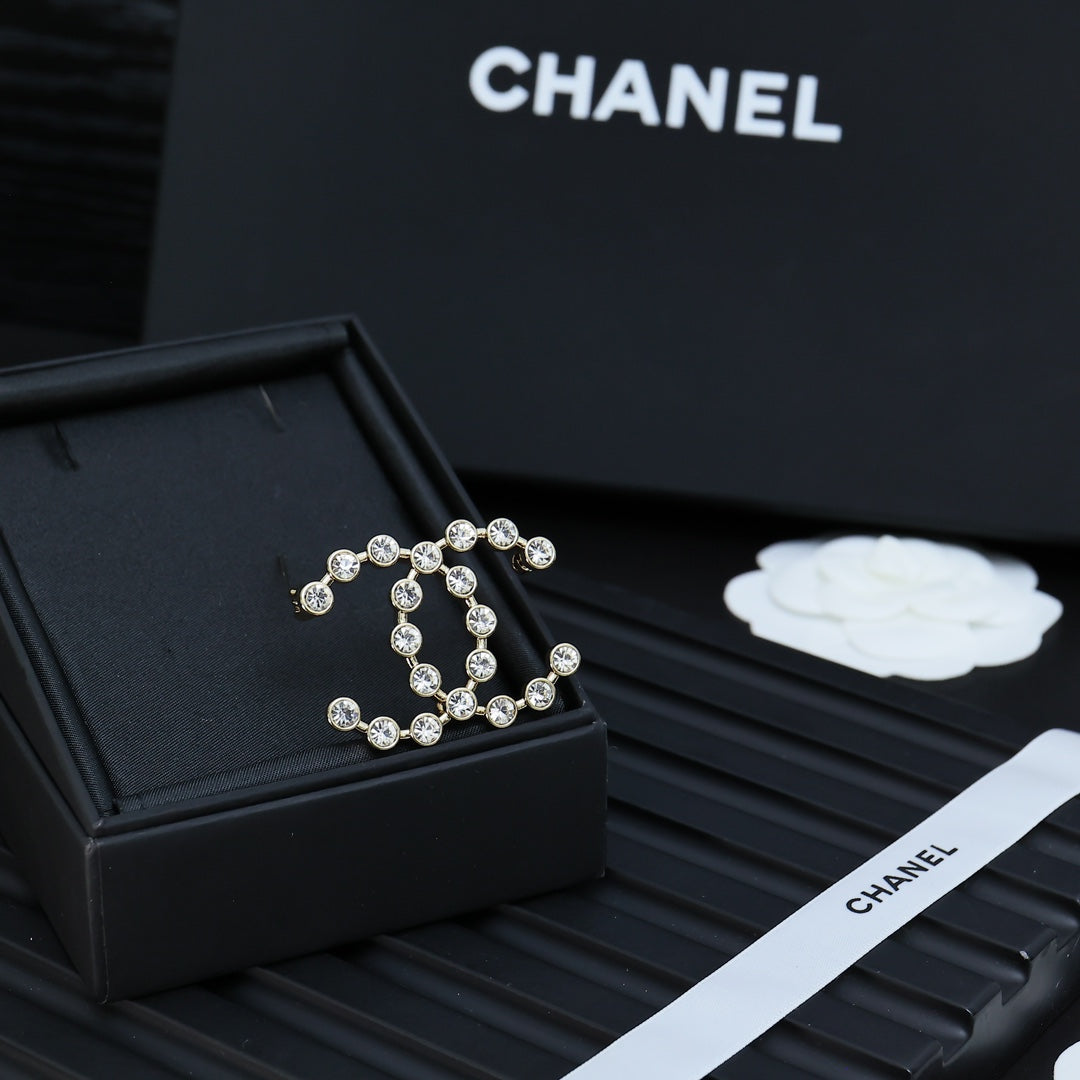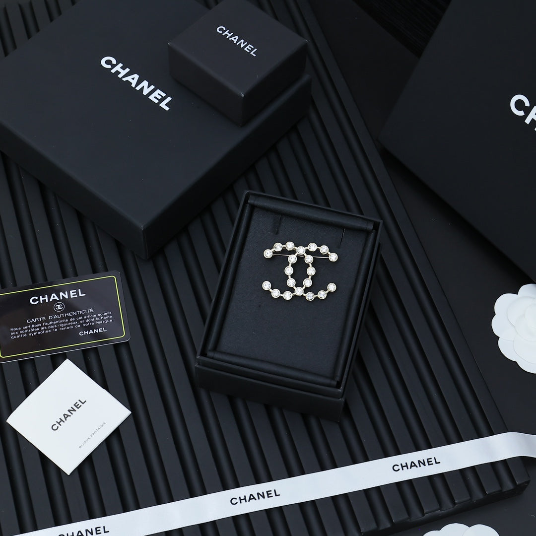 DOUBLE C LETTER BROOCH IN GOLD METAL WITH CRYSTALS AROUND LOGO