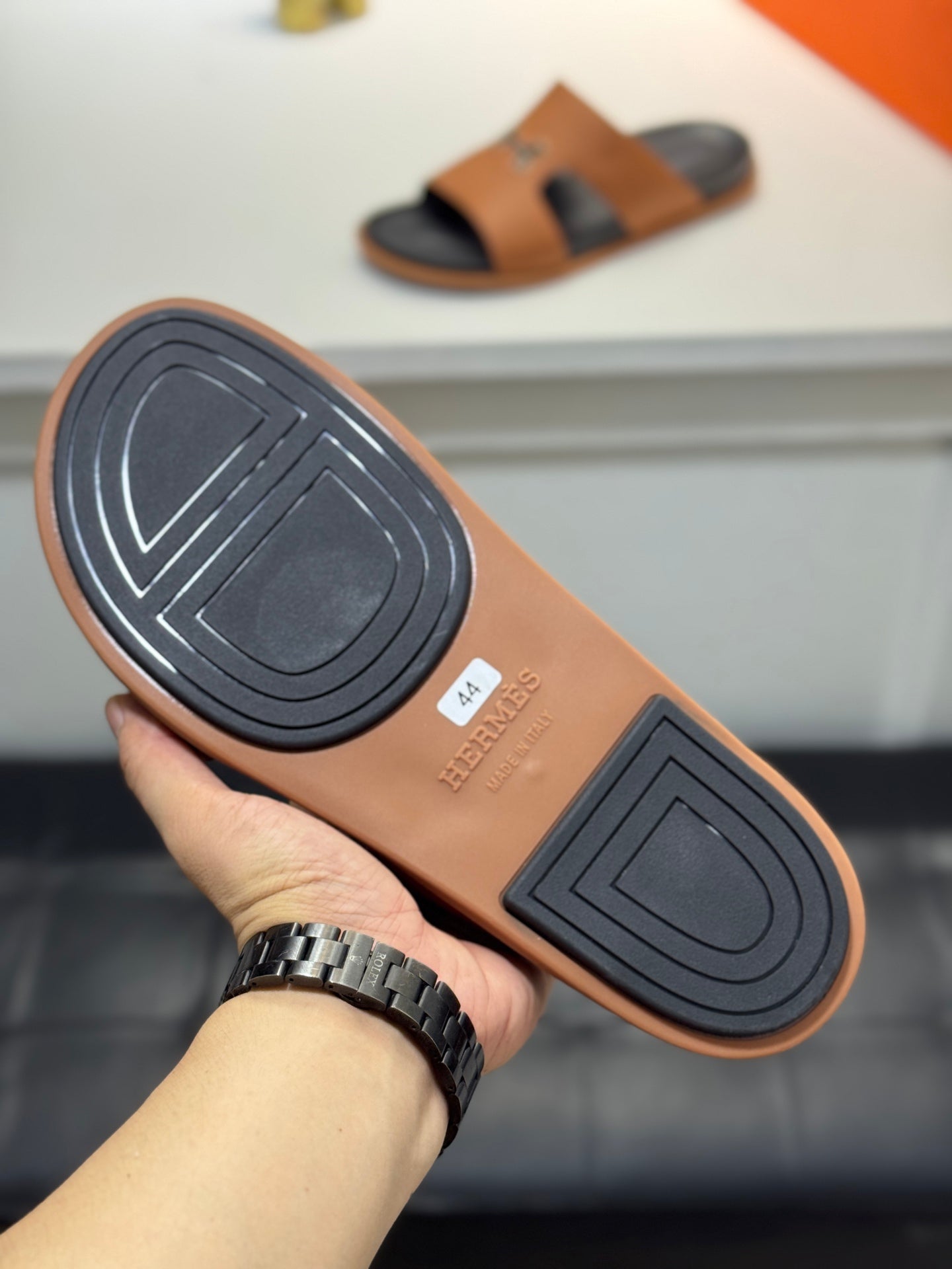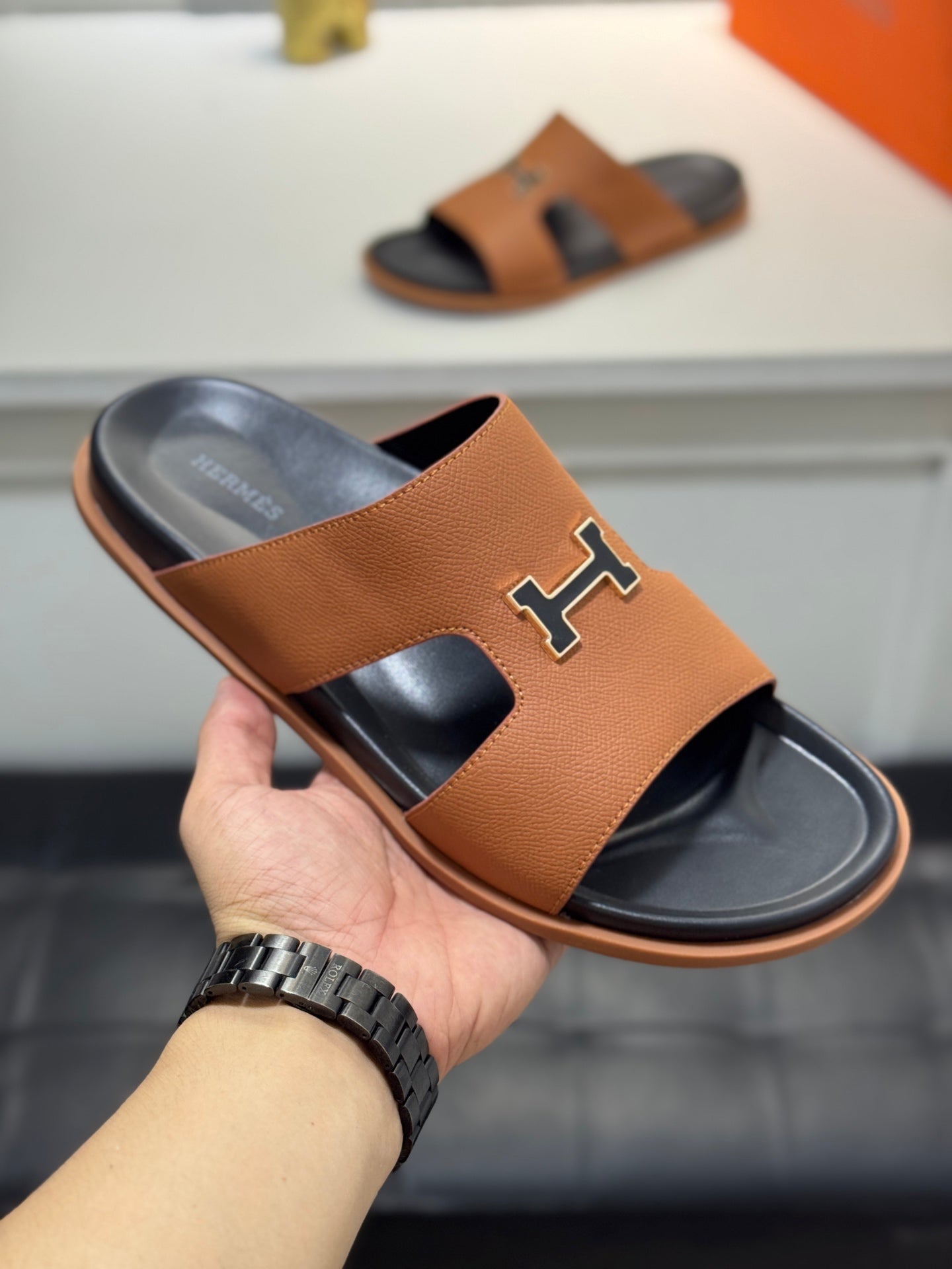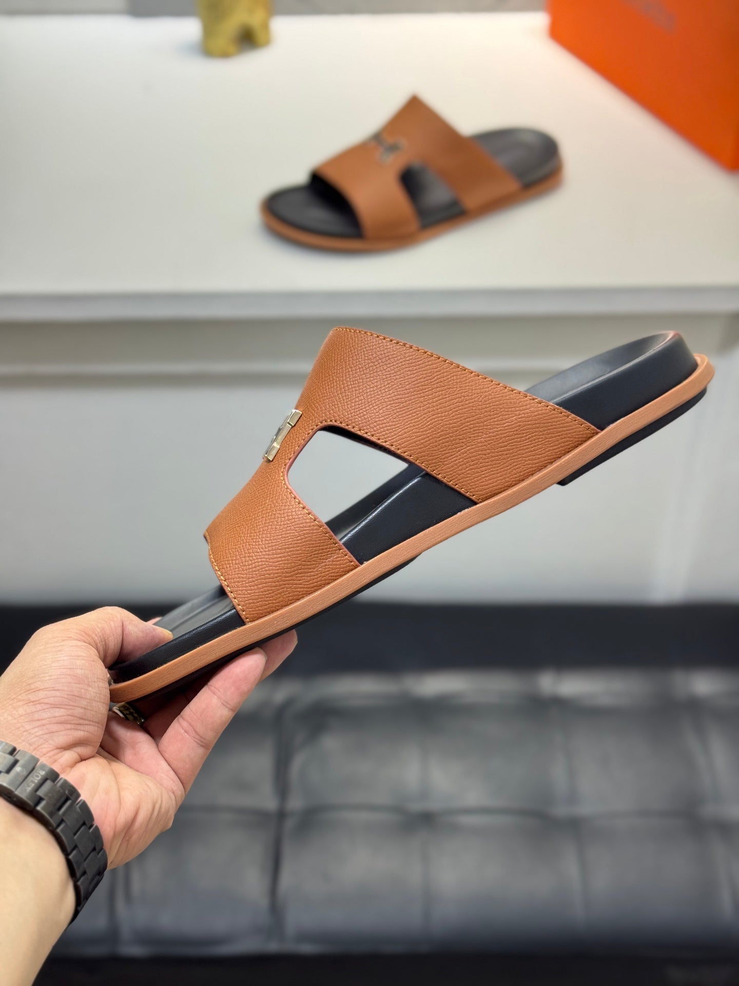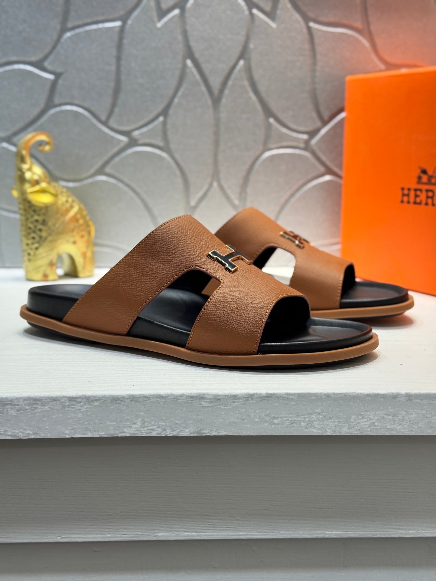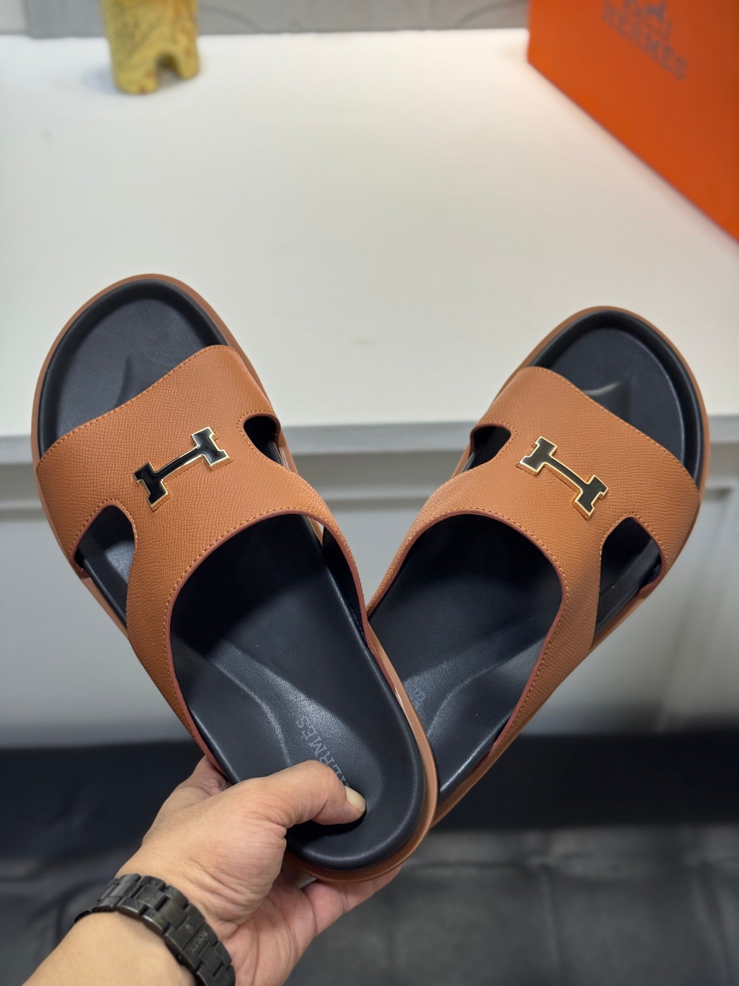 HM Oran H Black Gold Buckle Slippers in Brown Cowhide 735252