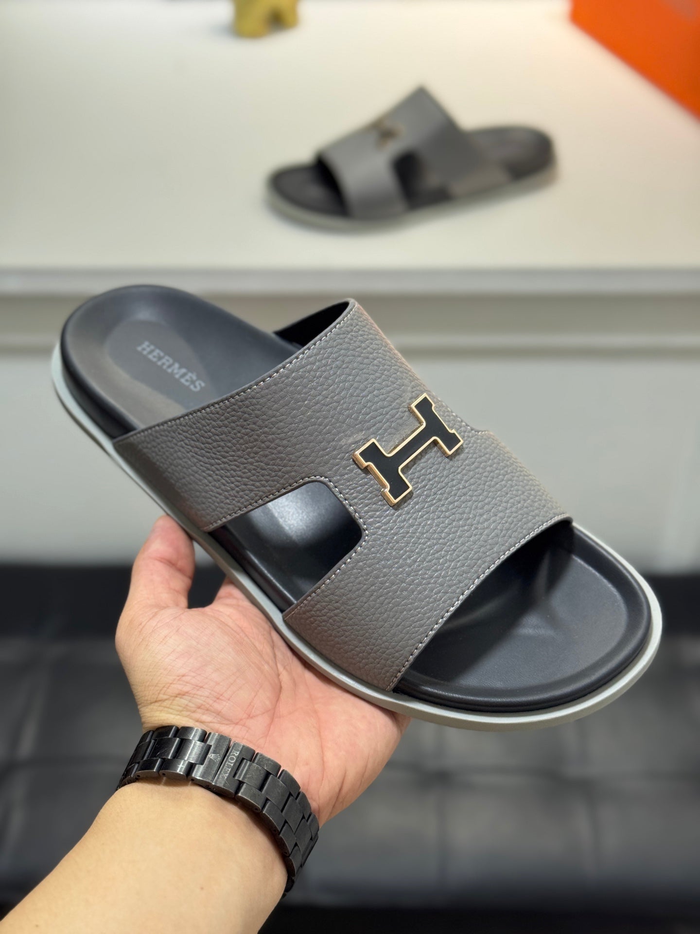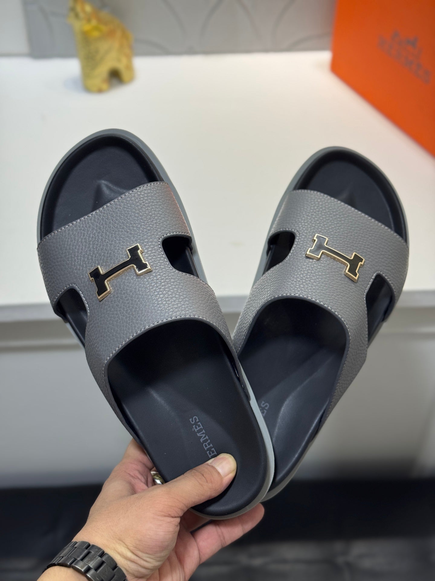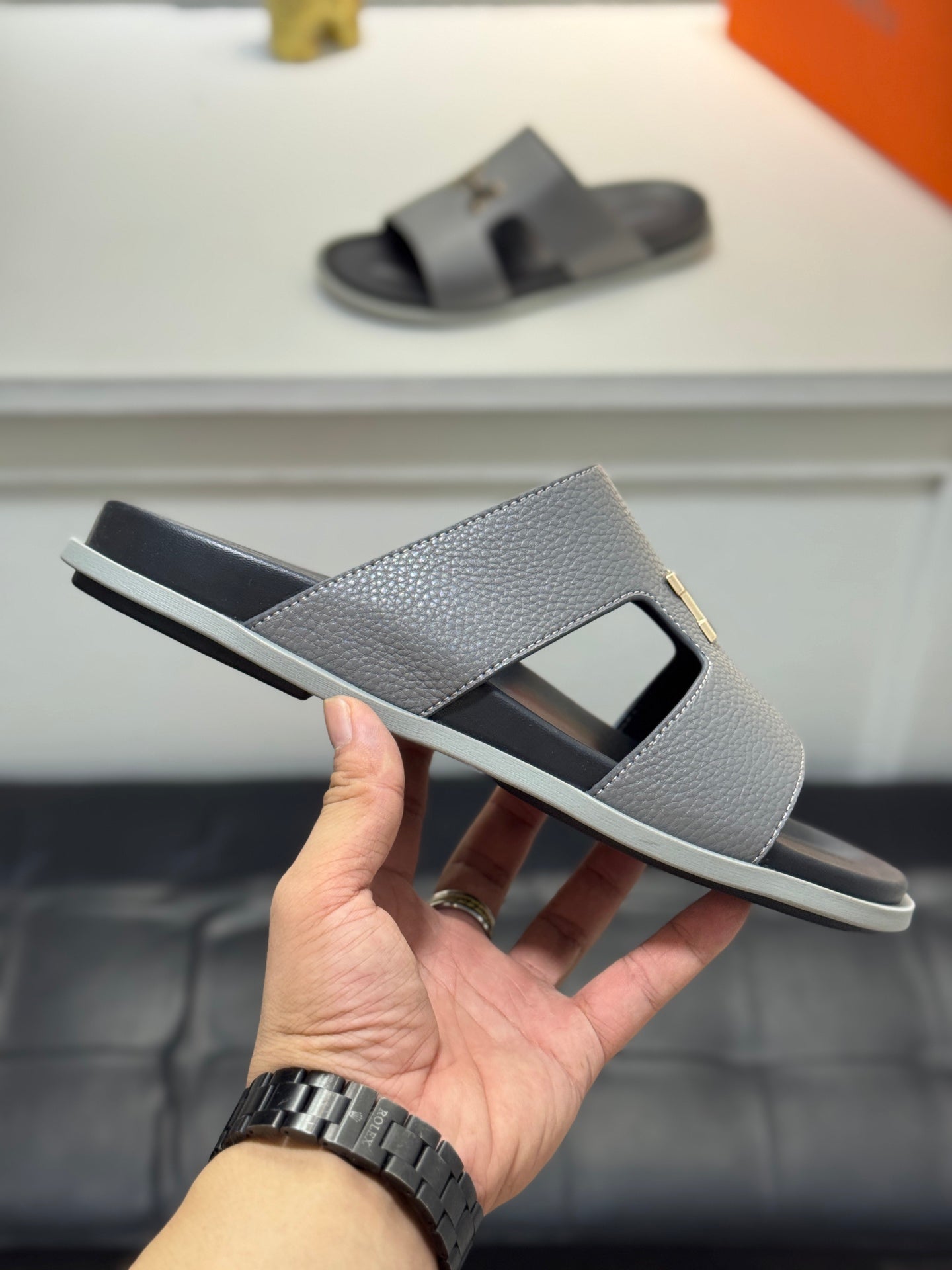 HM Oran H Black Gold Buckle Slippers in Gray Cowhide 735245