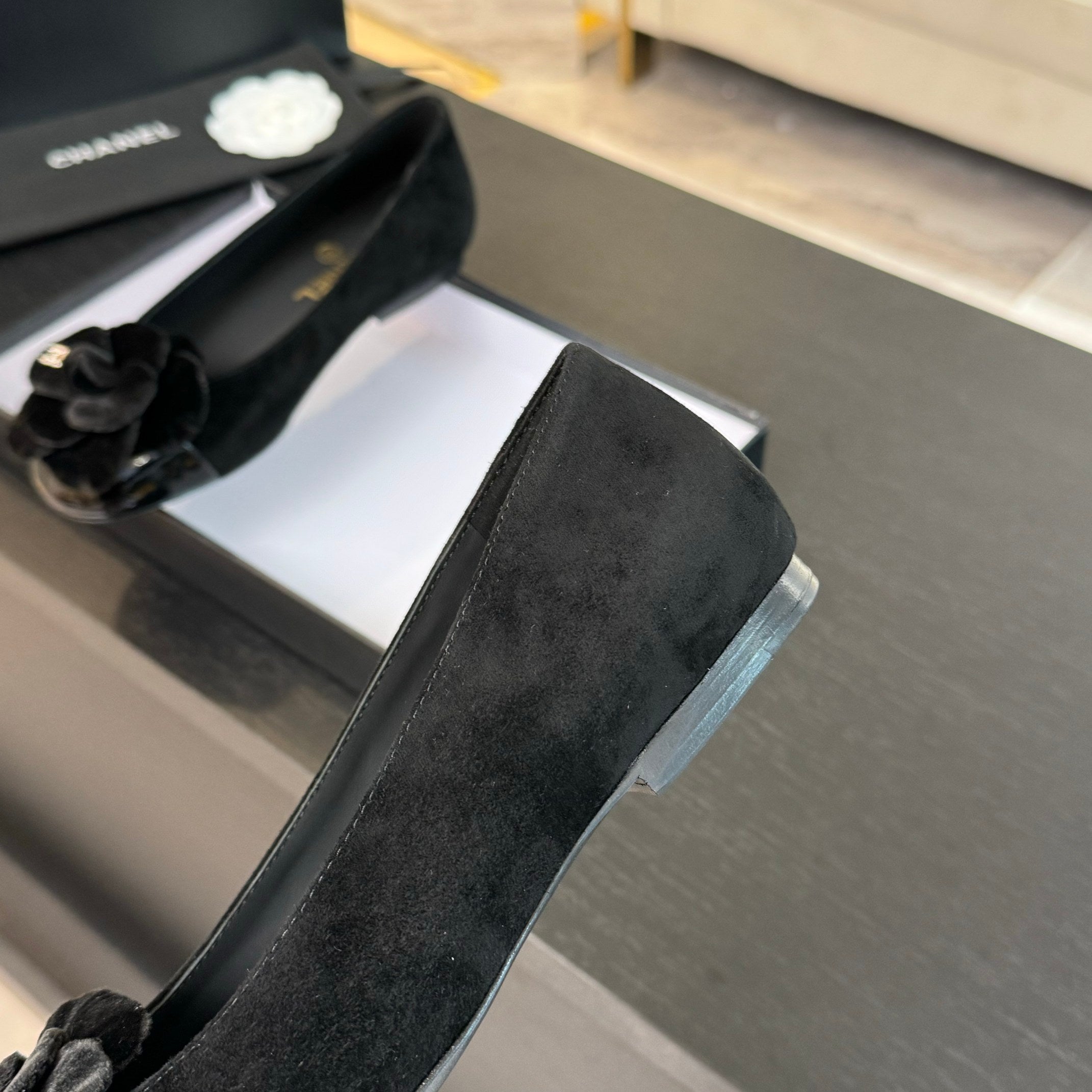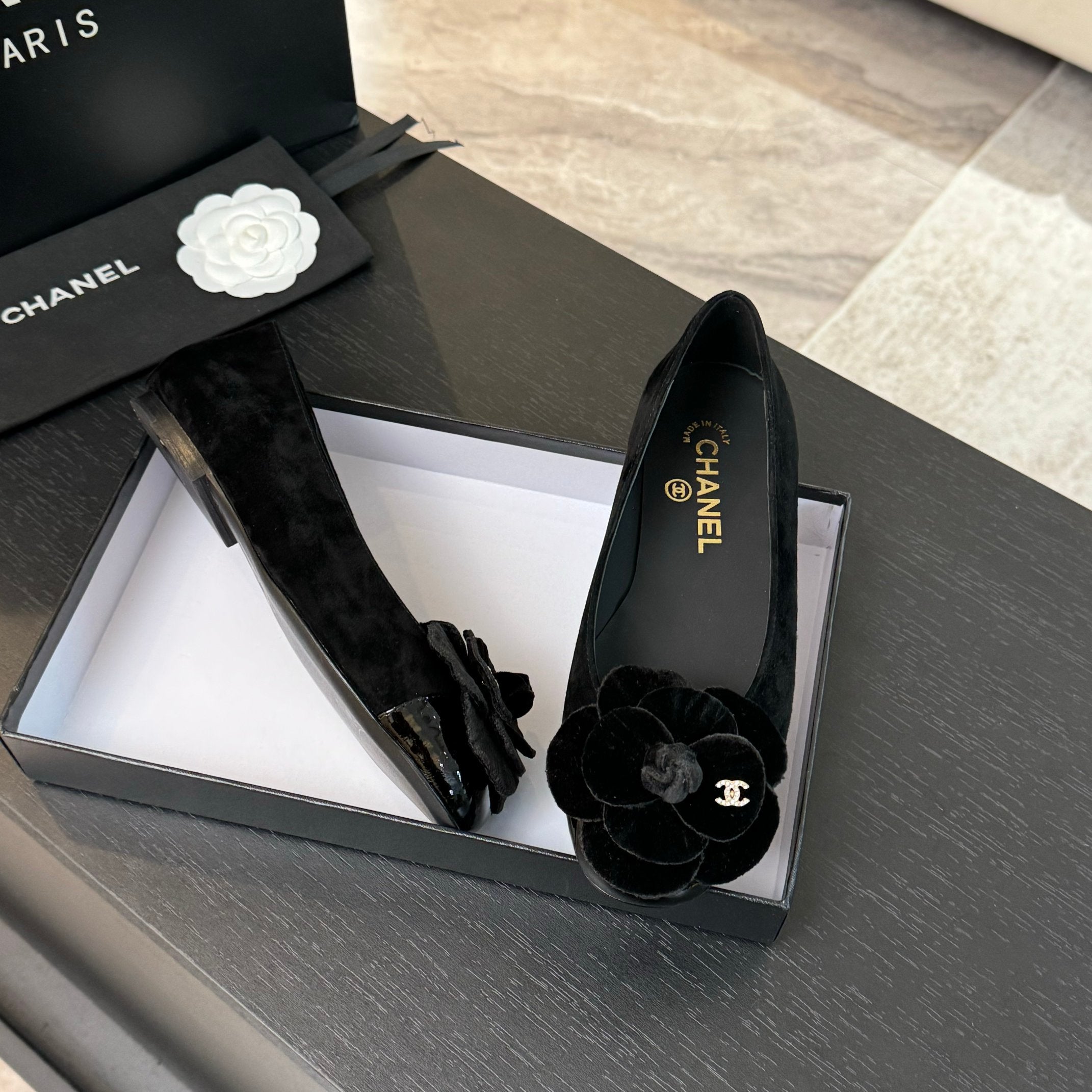 BALLET FLATS IN BLACK SUEDE WITH CAMELLIA