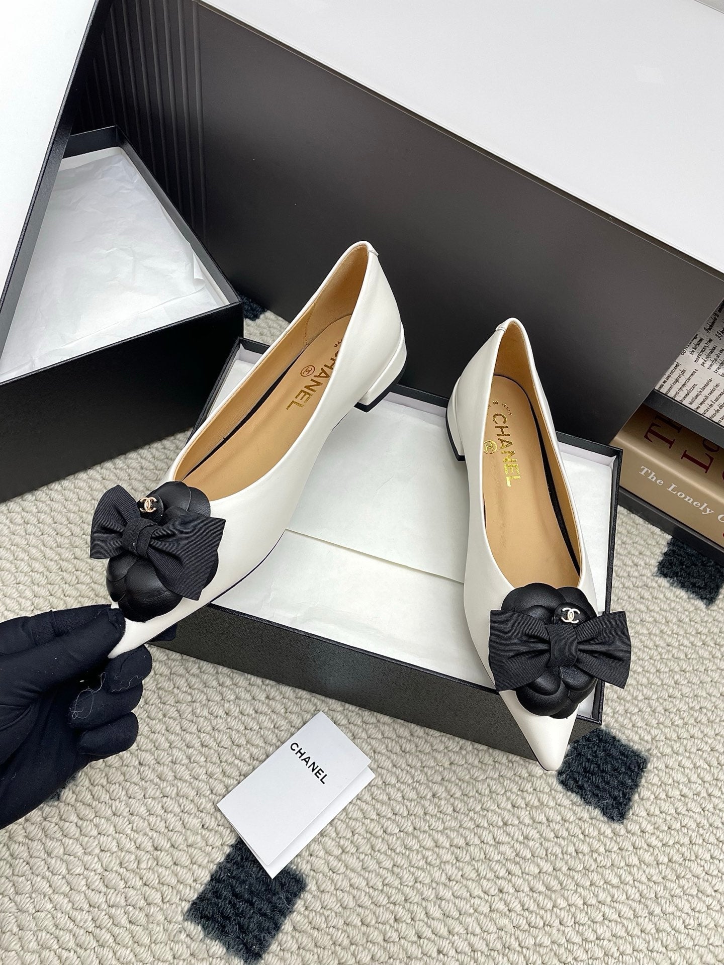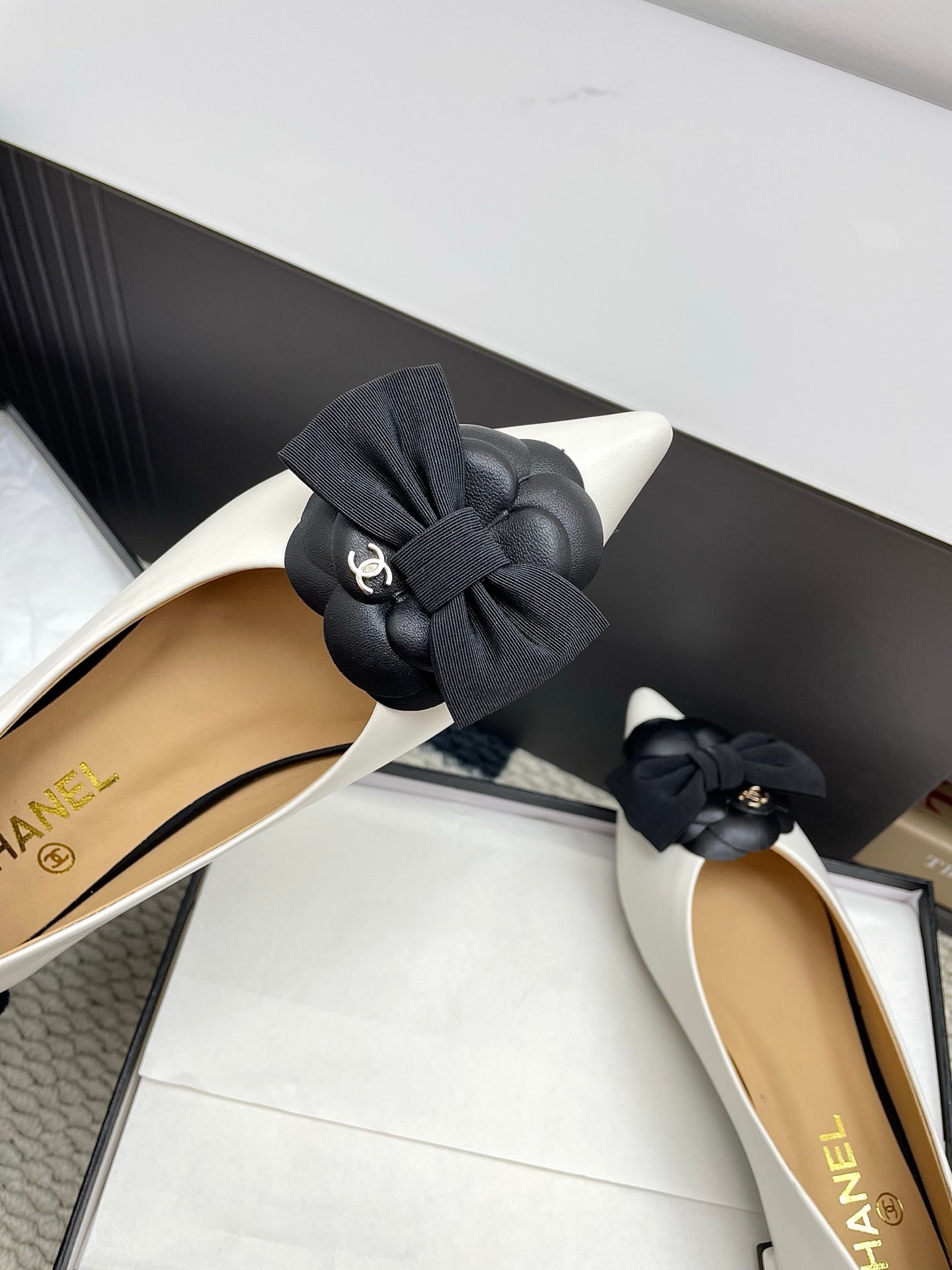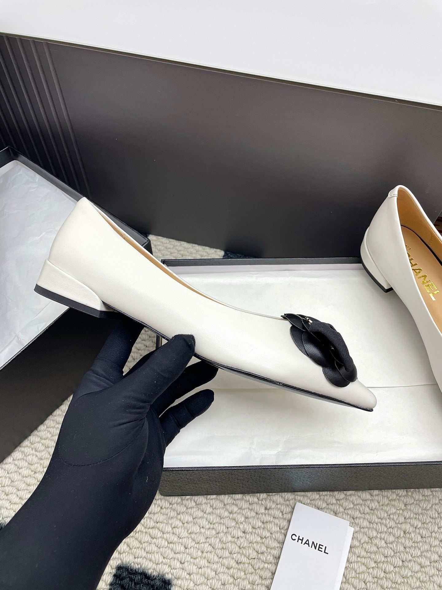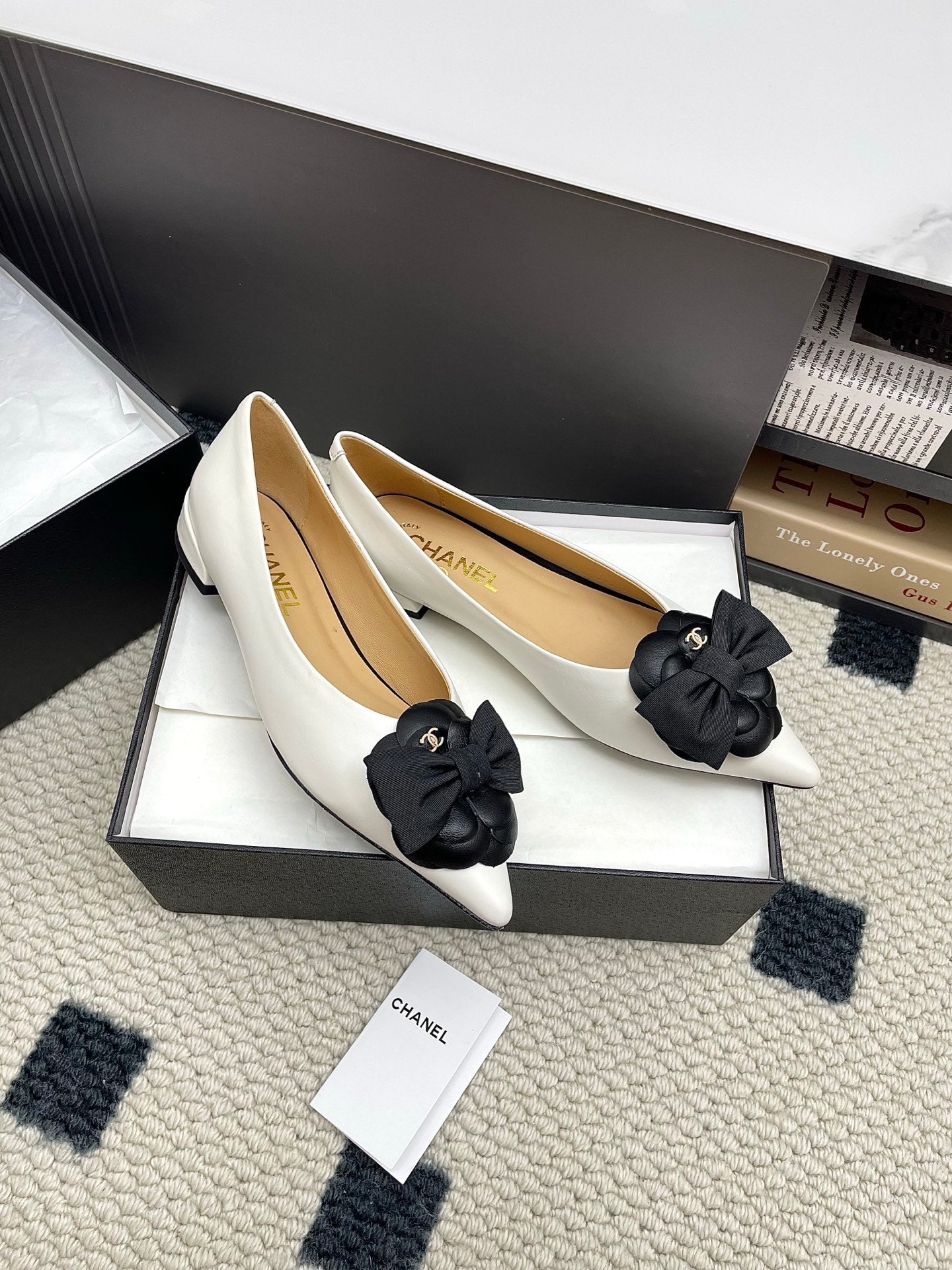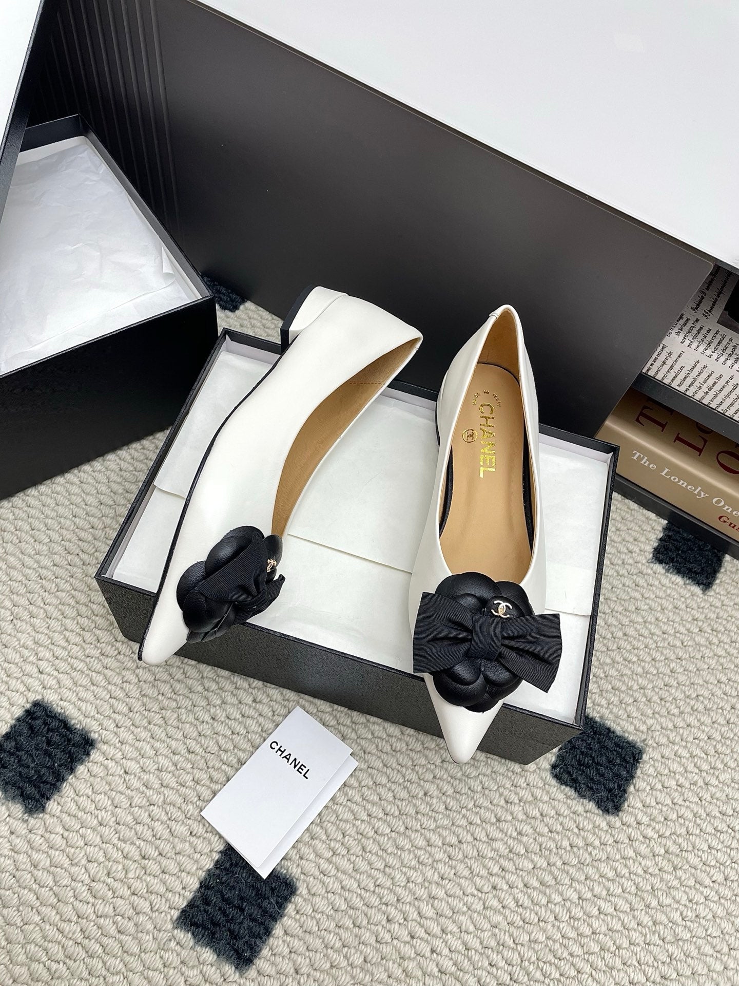 CC Logo Bow with Camellia Ballerina Flats Black White Cowhide Sheepskin 427021