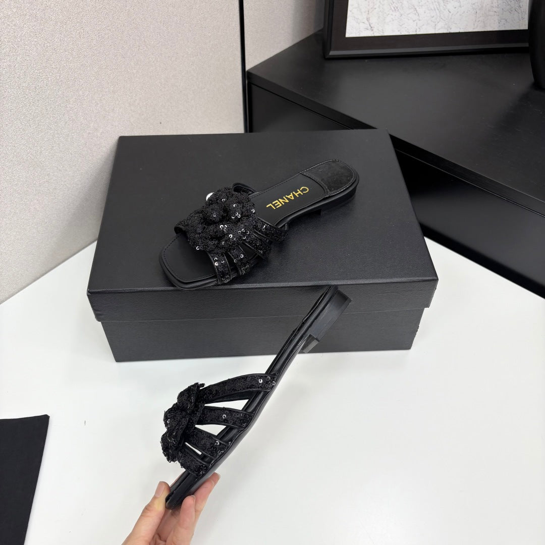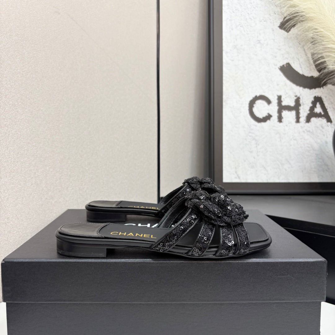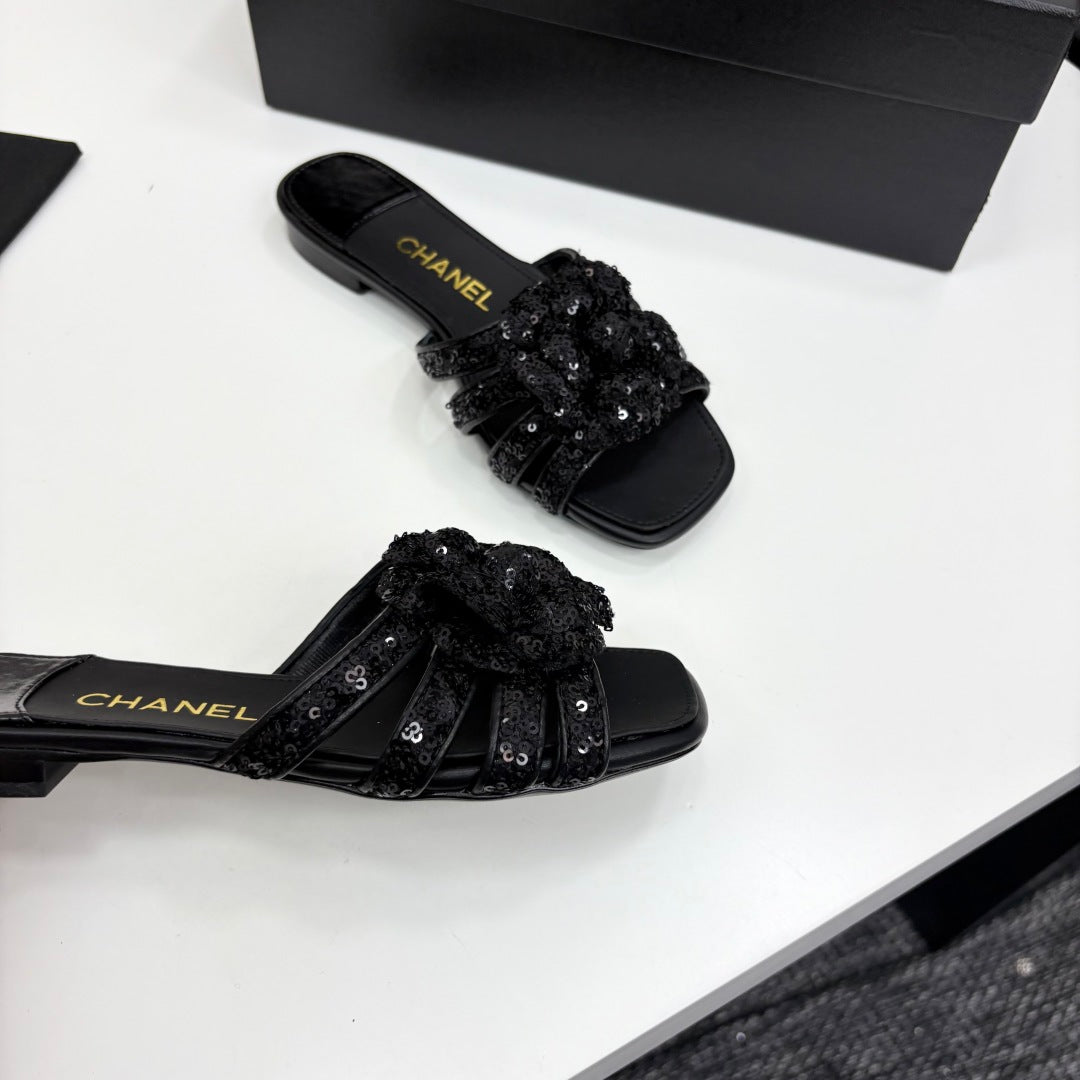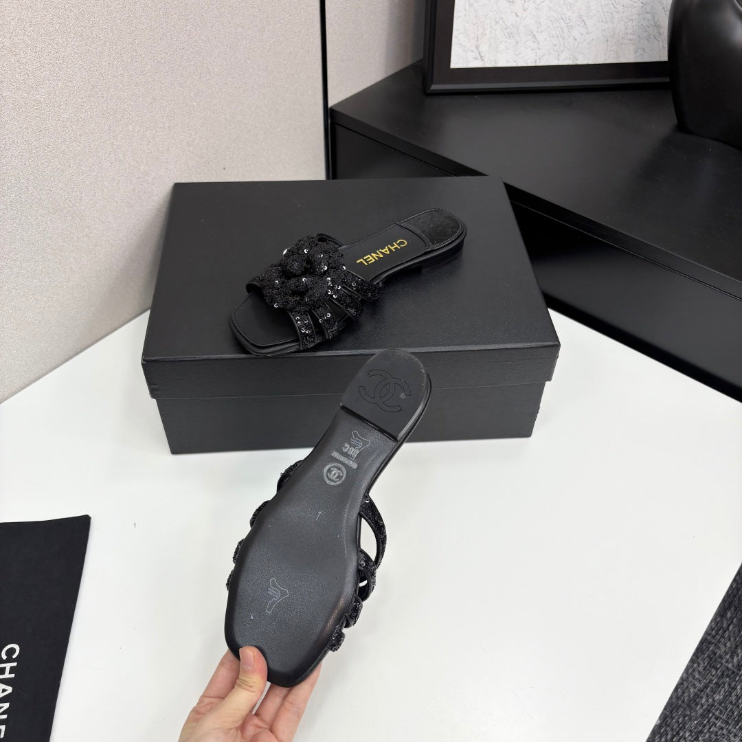 CC 25 Camellia Open Flat Mule Black Coarse Glitter Fabric And Sheepskin 368853