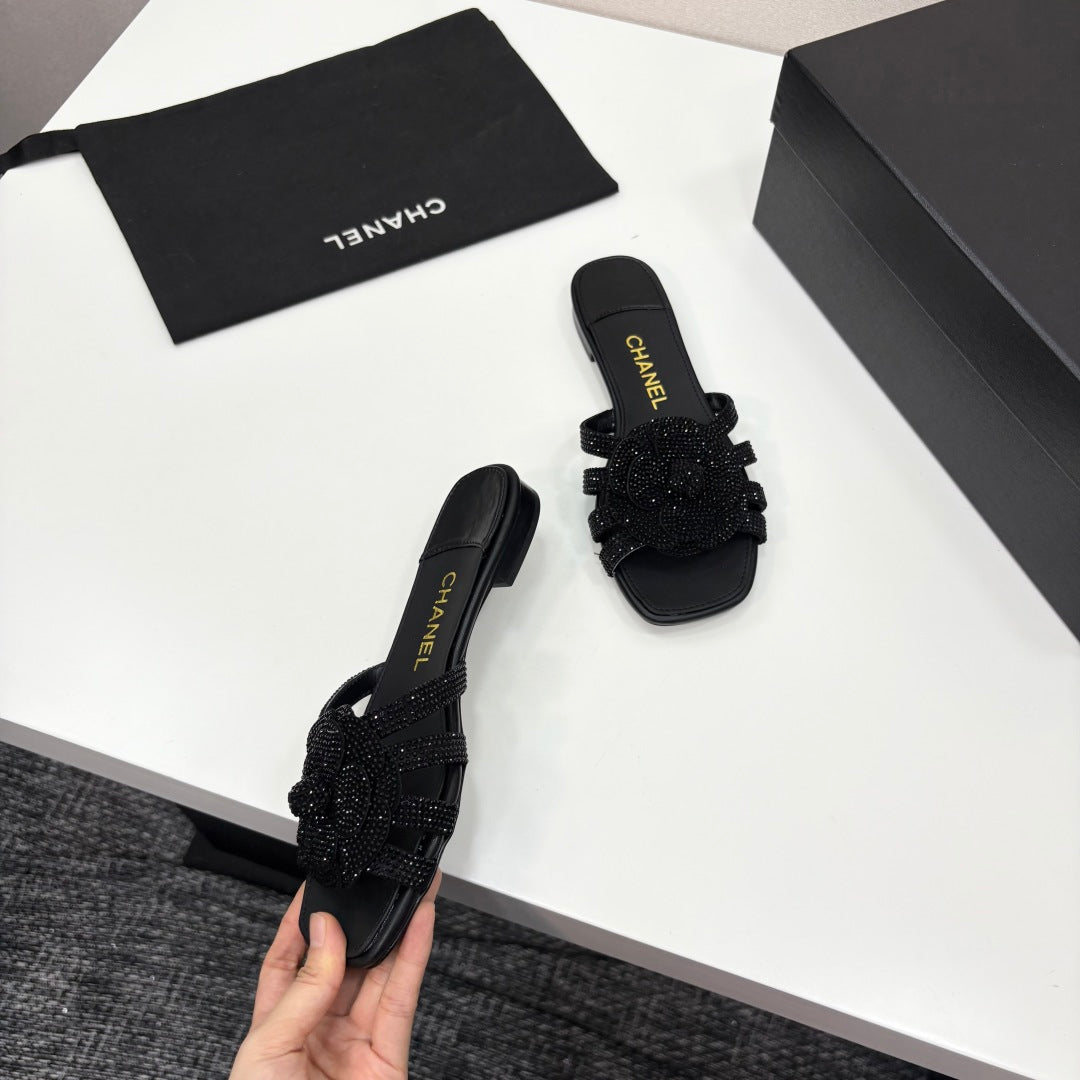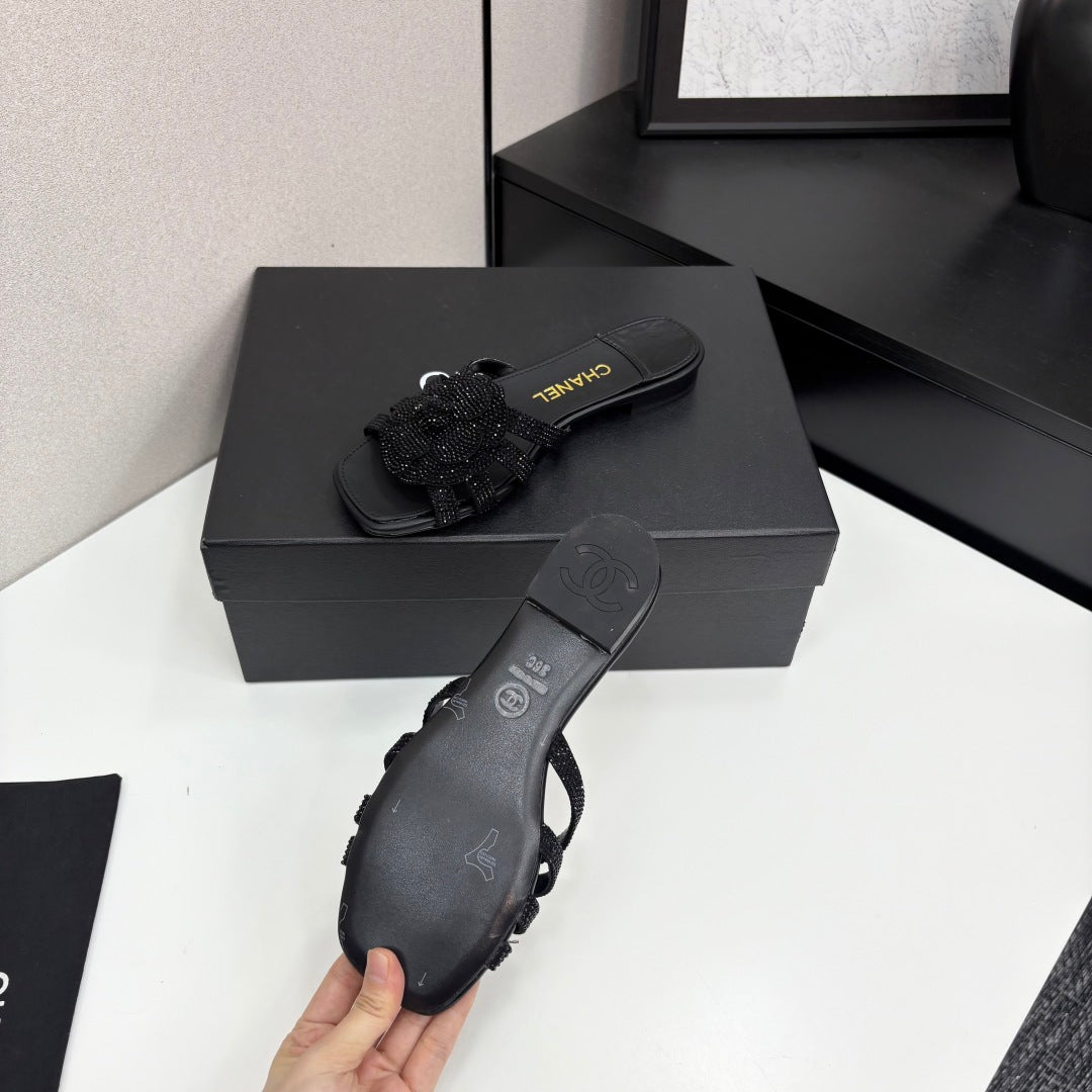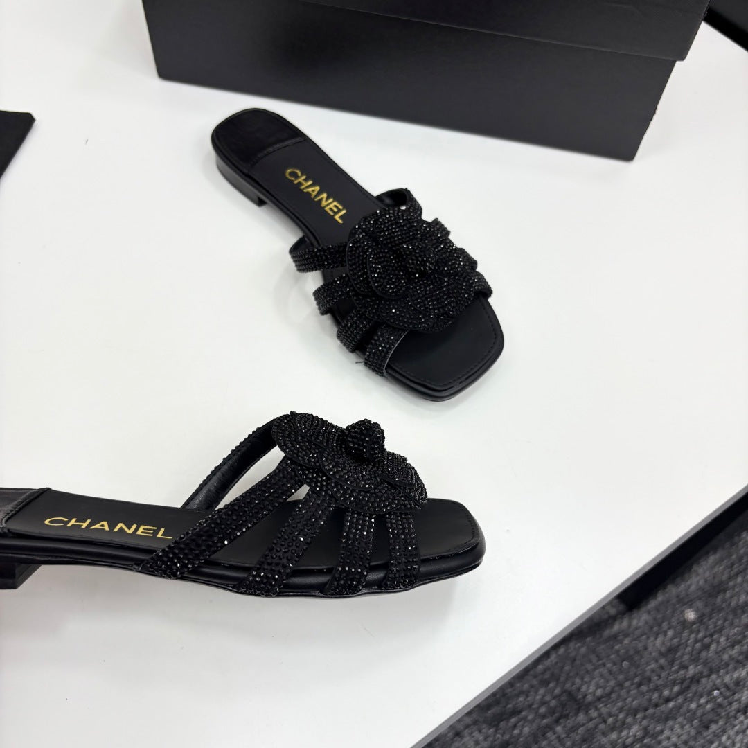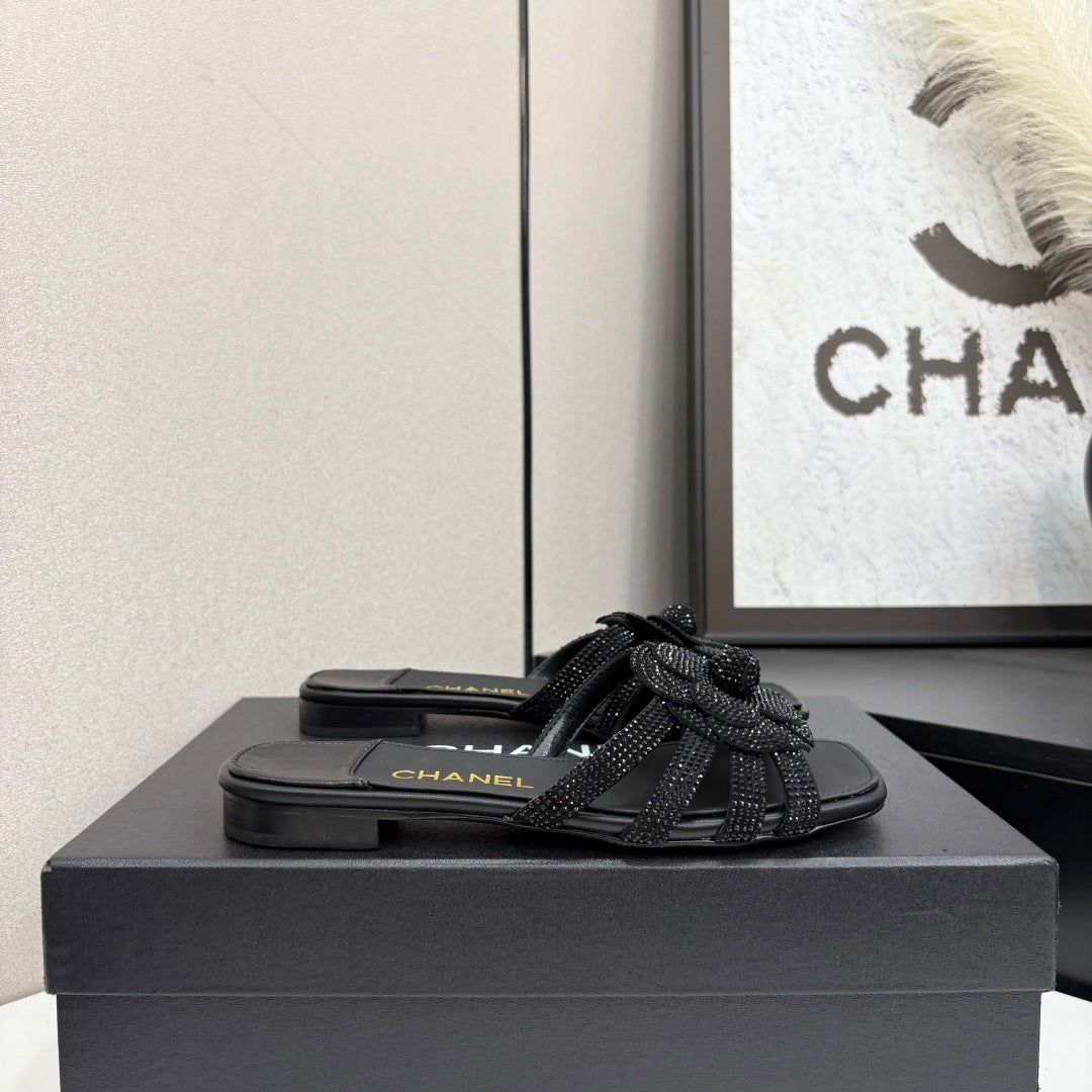 CC 25 Camellia Open Flat Mule Black Stone Grain And Sheepskin 368851