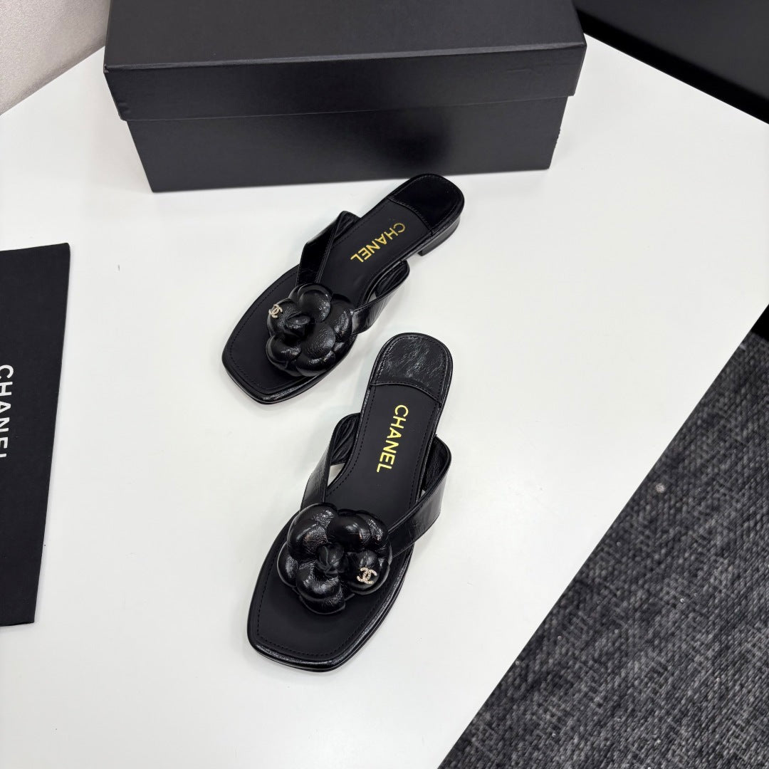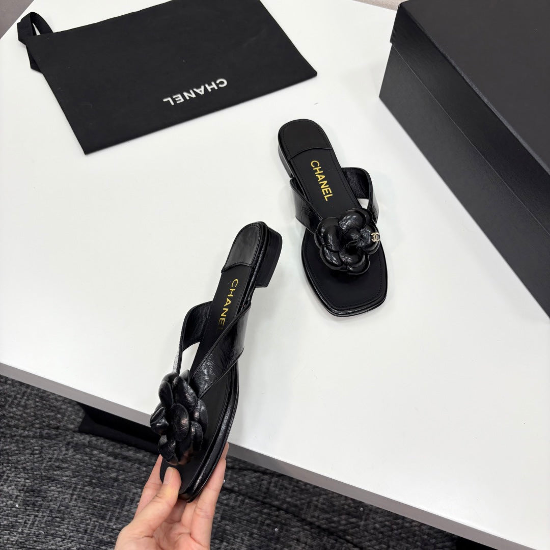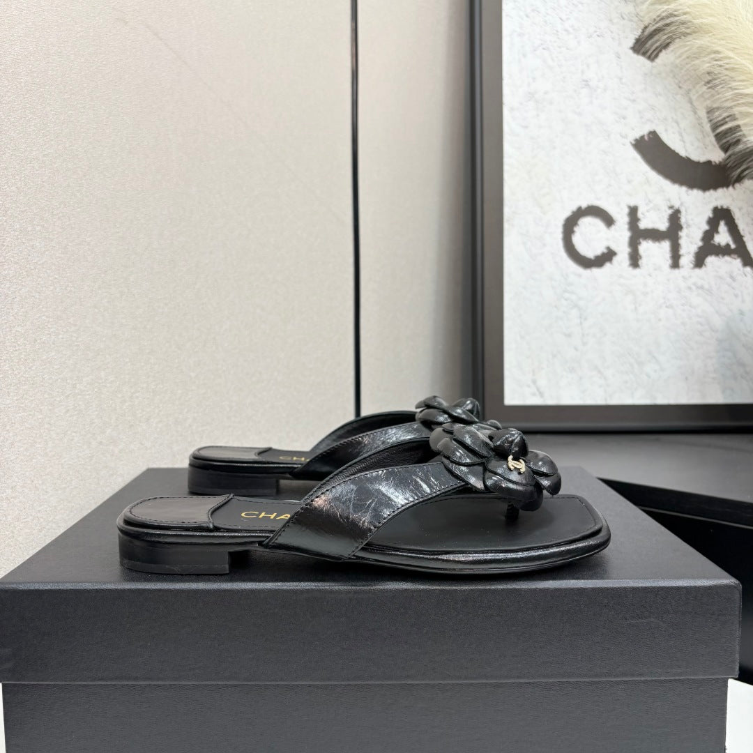 CC 25 Camellia Thong Sandals Black Sheepskin 368839
