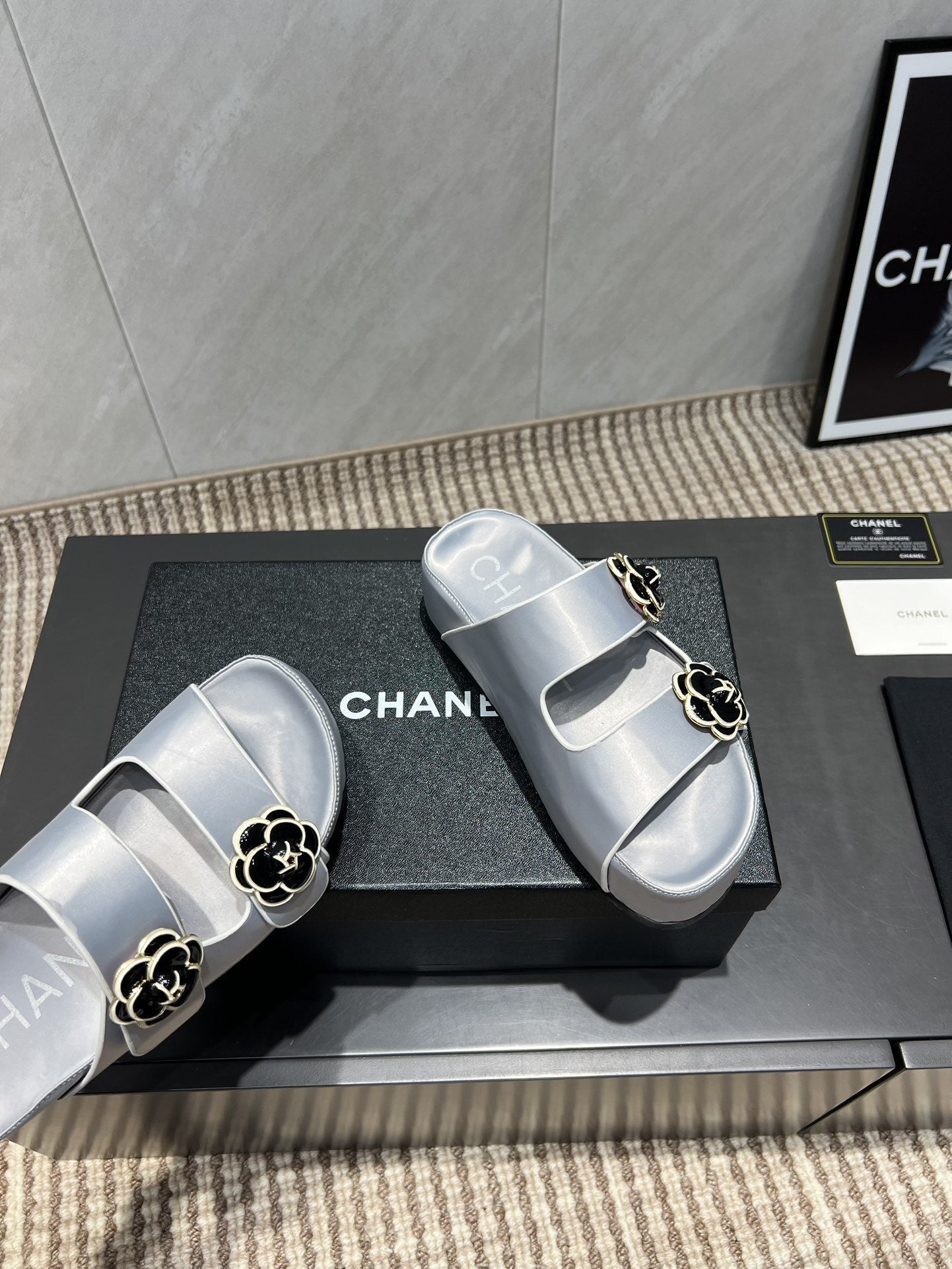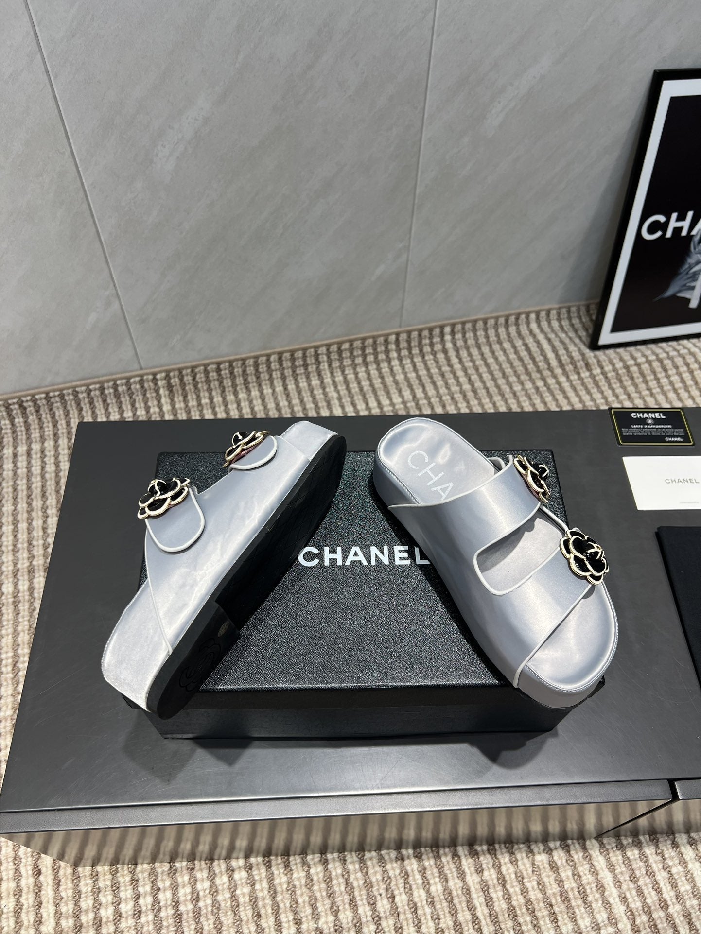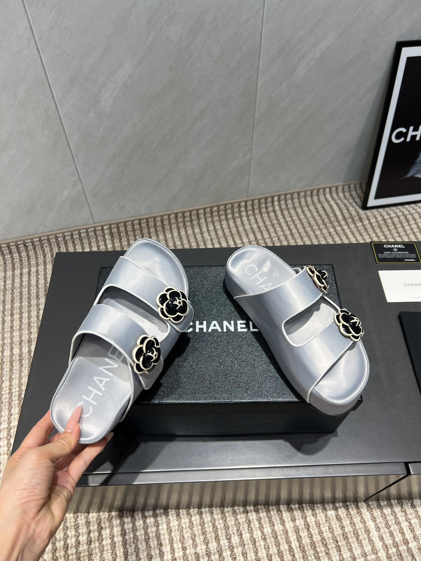 CC 25SS Flower Buckle Platform Beach Slides in Silver High-Mercerized Sardine