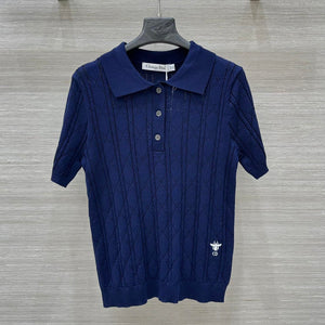 CD 25 Hollow Polo Knitted Short-sleeved Top Blue Silk Wool