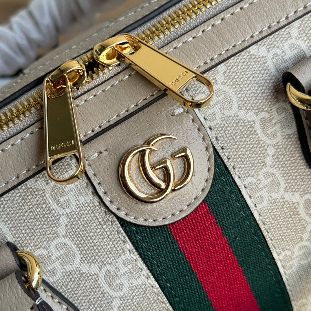 OPHIDIA SMALL TOP HANDLE BAG 26 IN BEIGE WHITE CANVAS AND OAT CALFSKIN TRIM GOLD HARDWARE