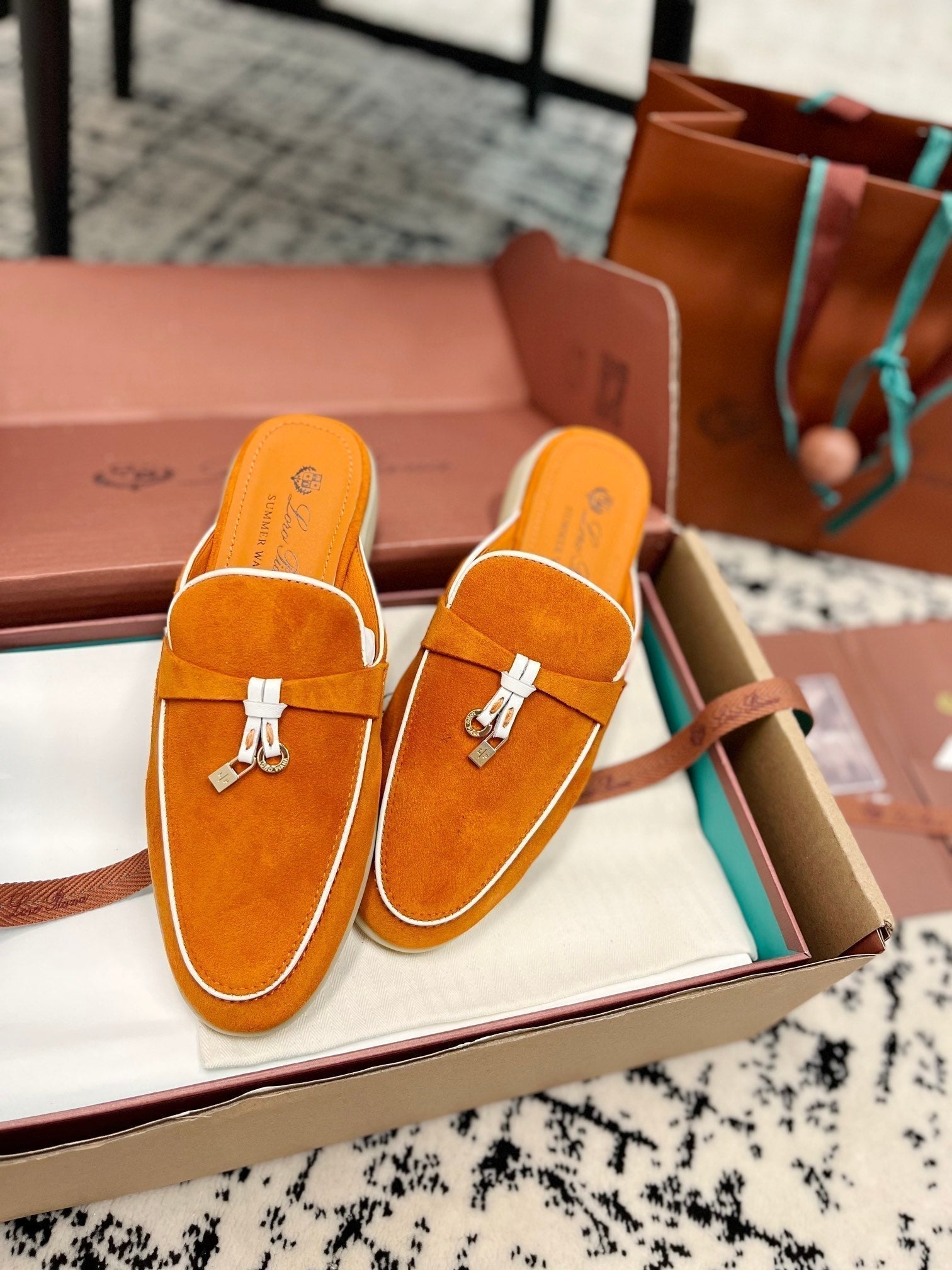 Loro Piana Carrot White Suede Charms Walk Flat Mules