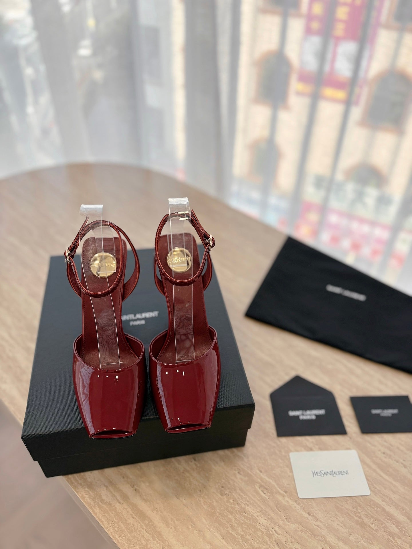 LA SCANDALE HIGH 10 CM WEDGE SANDALS IN CRIMSON RED PATENT LEATHER