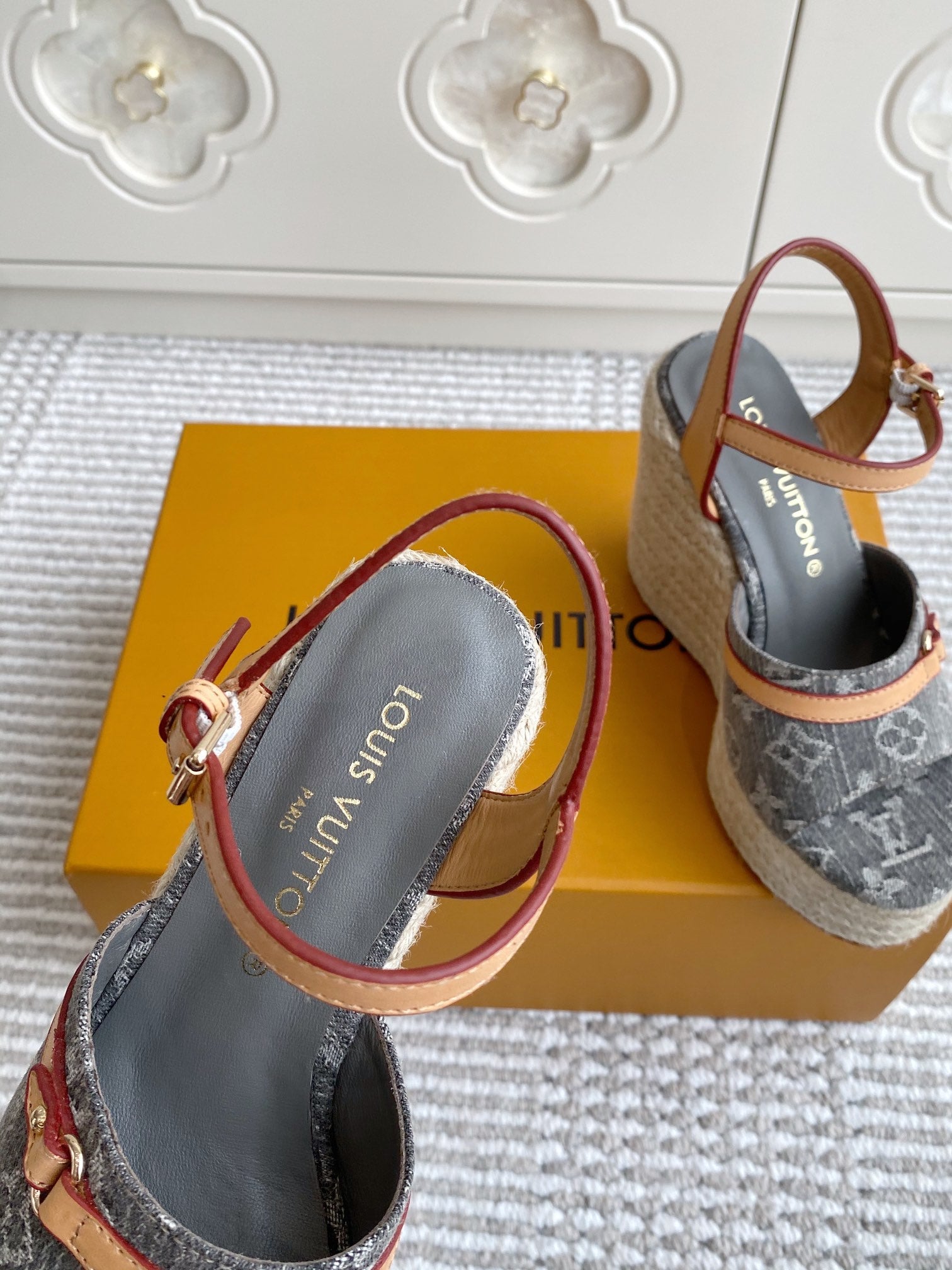 LV Grey Denim Monogram Wedge Sandals 11.5cm Grey Sheepskin Lining 291578
