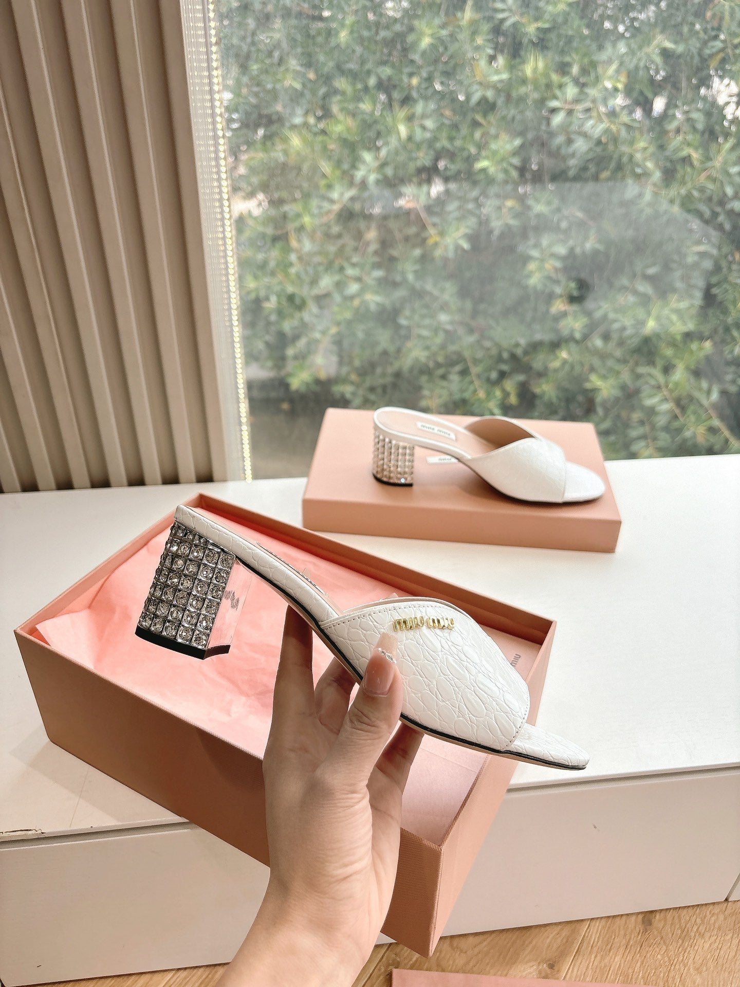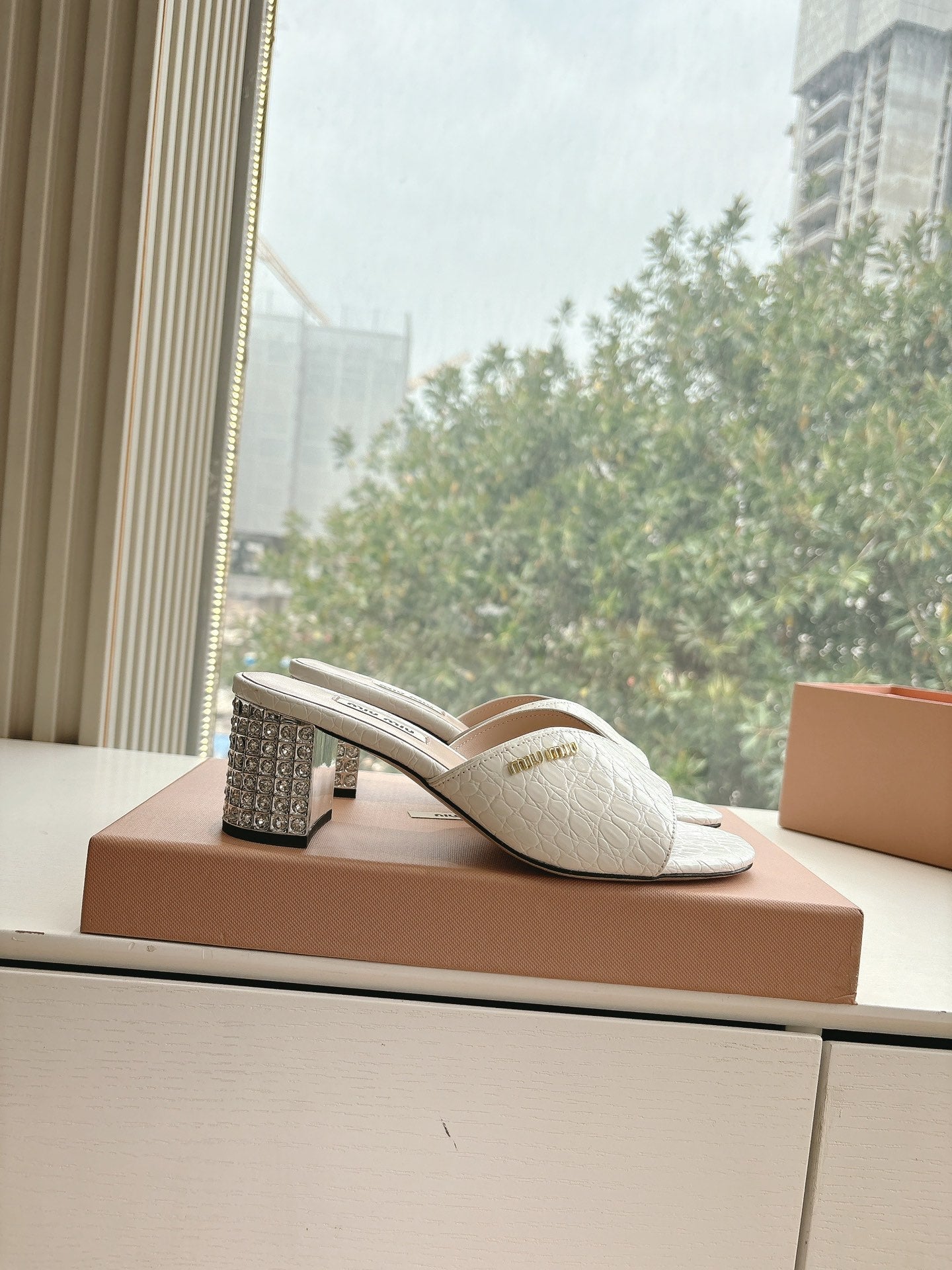 Miu White Croc Embossed Slide Sandals with Embellished Heel 223916