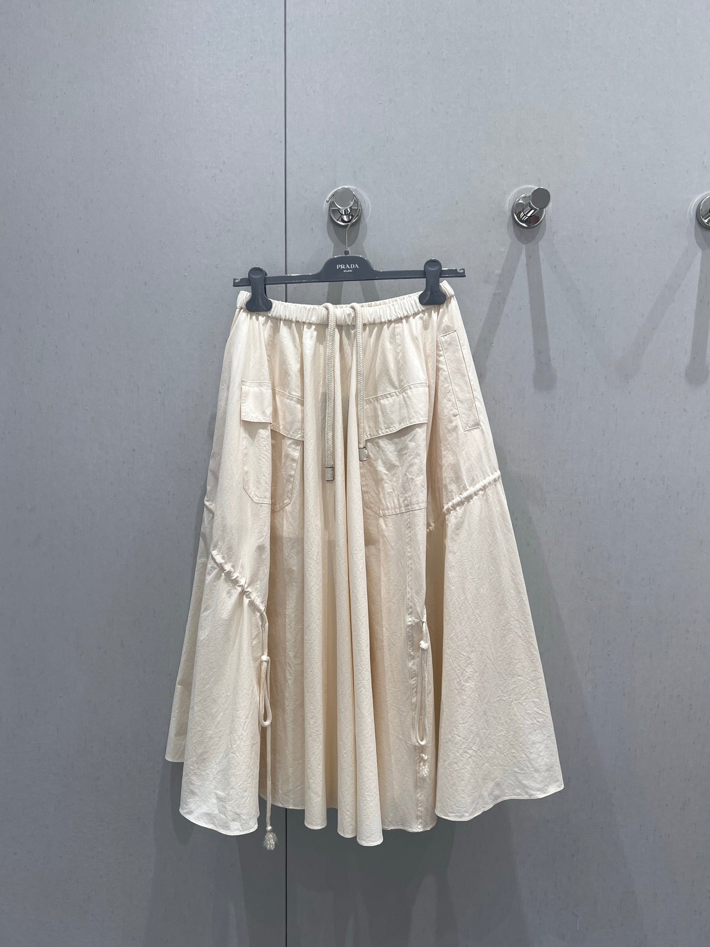 Prada 25 Drawstring Elastic Waist Umbrella Skirt Beige Cotton 215066