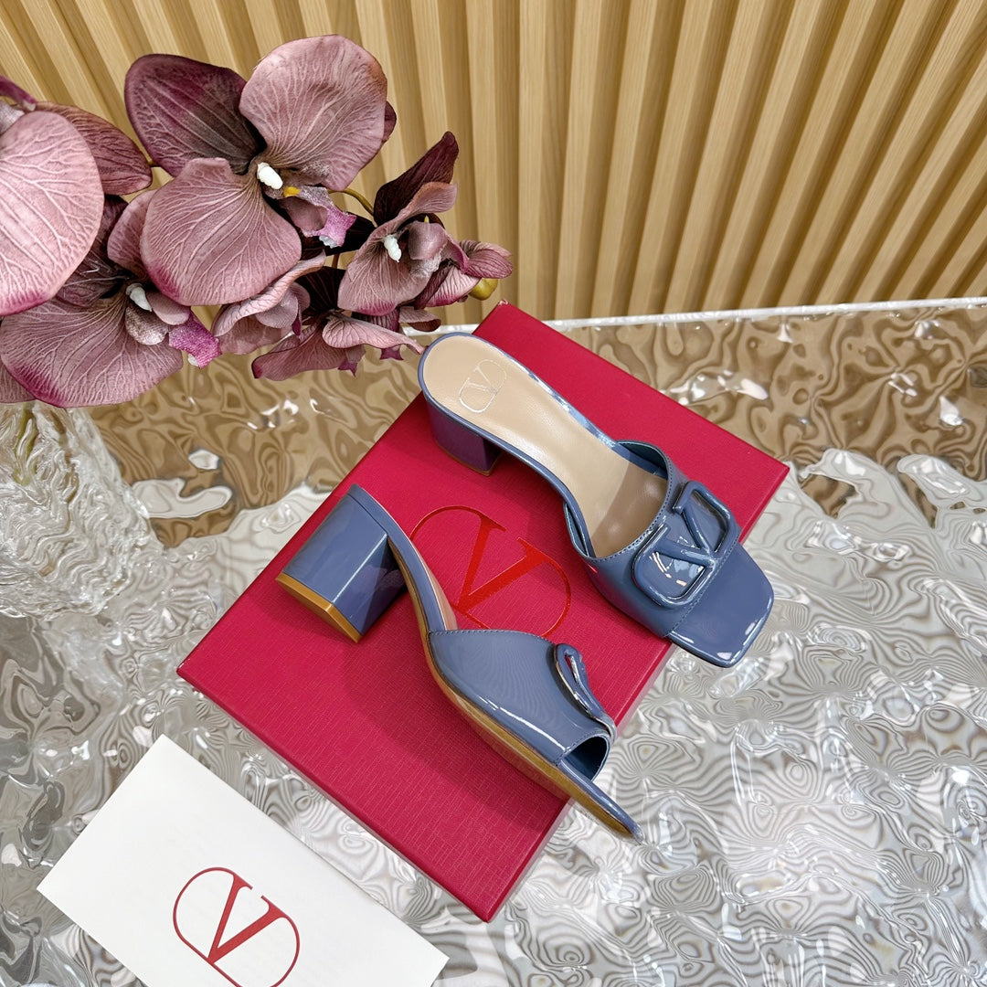 VLOGO SIGNATURE HIGH SHINE OPEN TOE SANDALS 60 MM IN PEGEON BLUE CALFSKIN