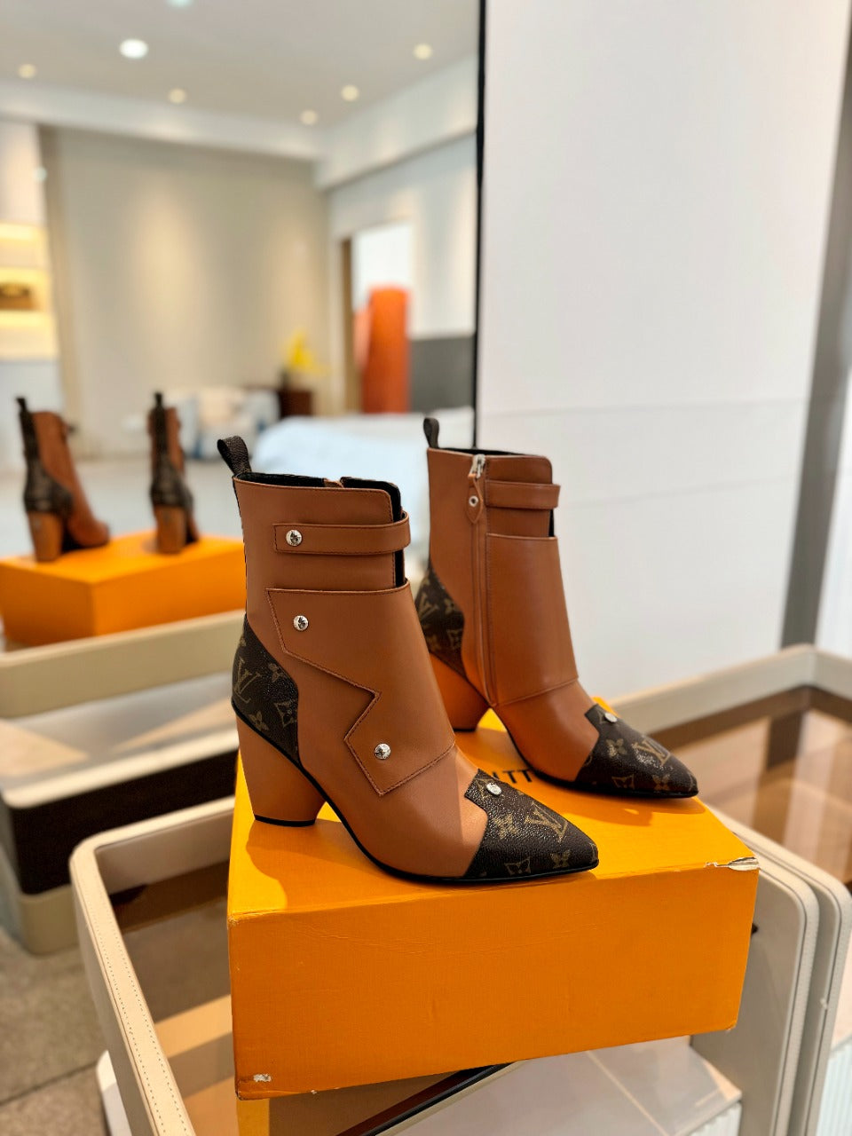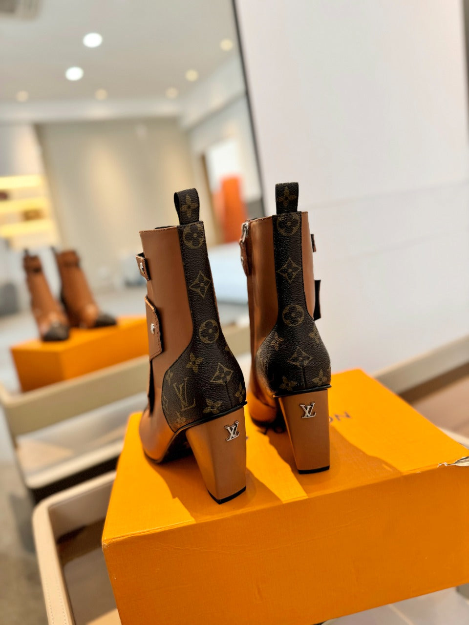 Stivaletto LV Trinity 75mm in pelle di vitello monogrammata arancione marrone