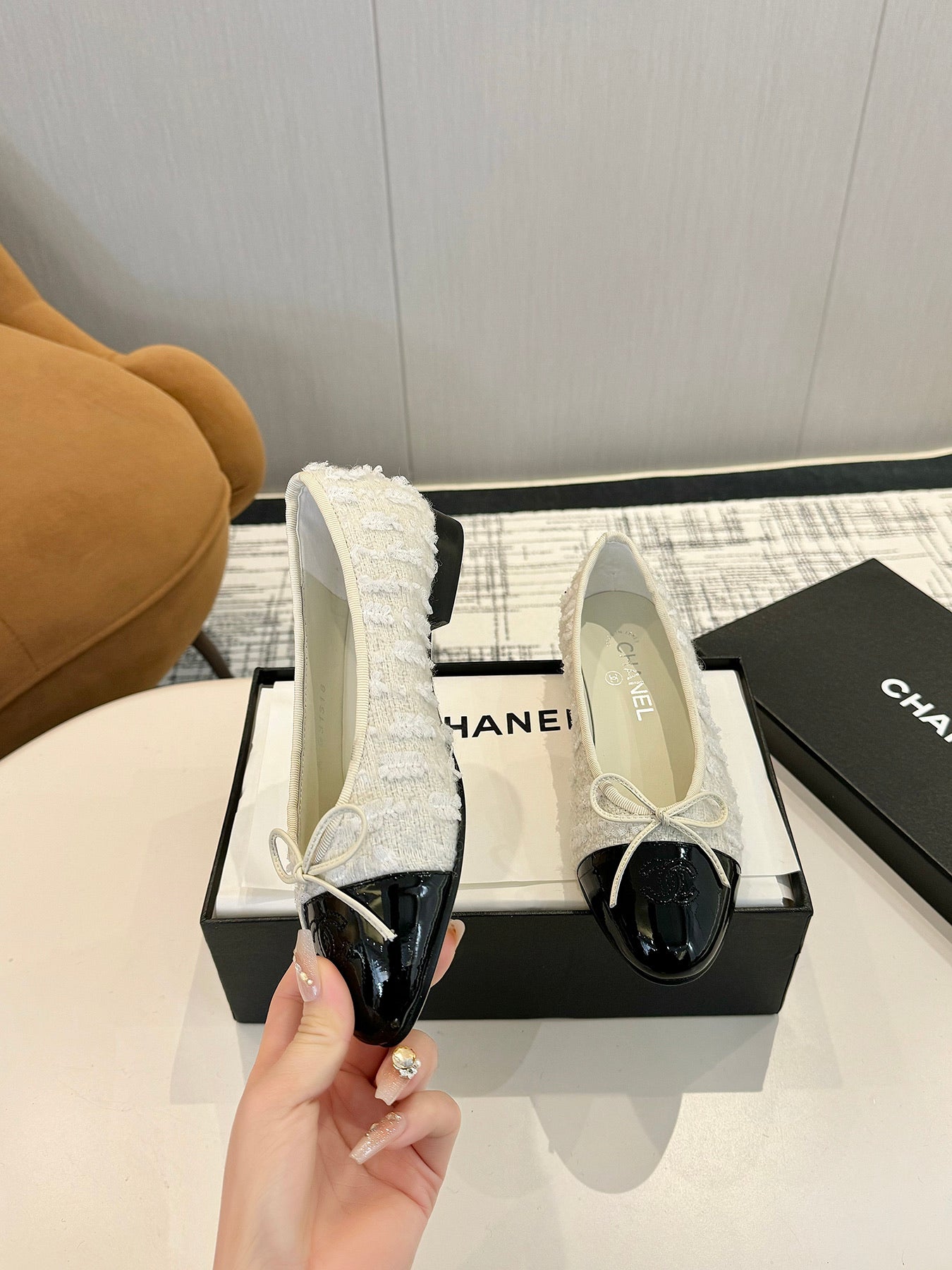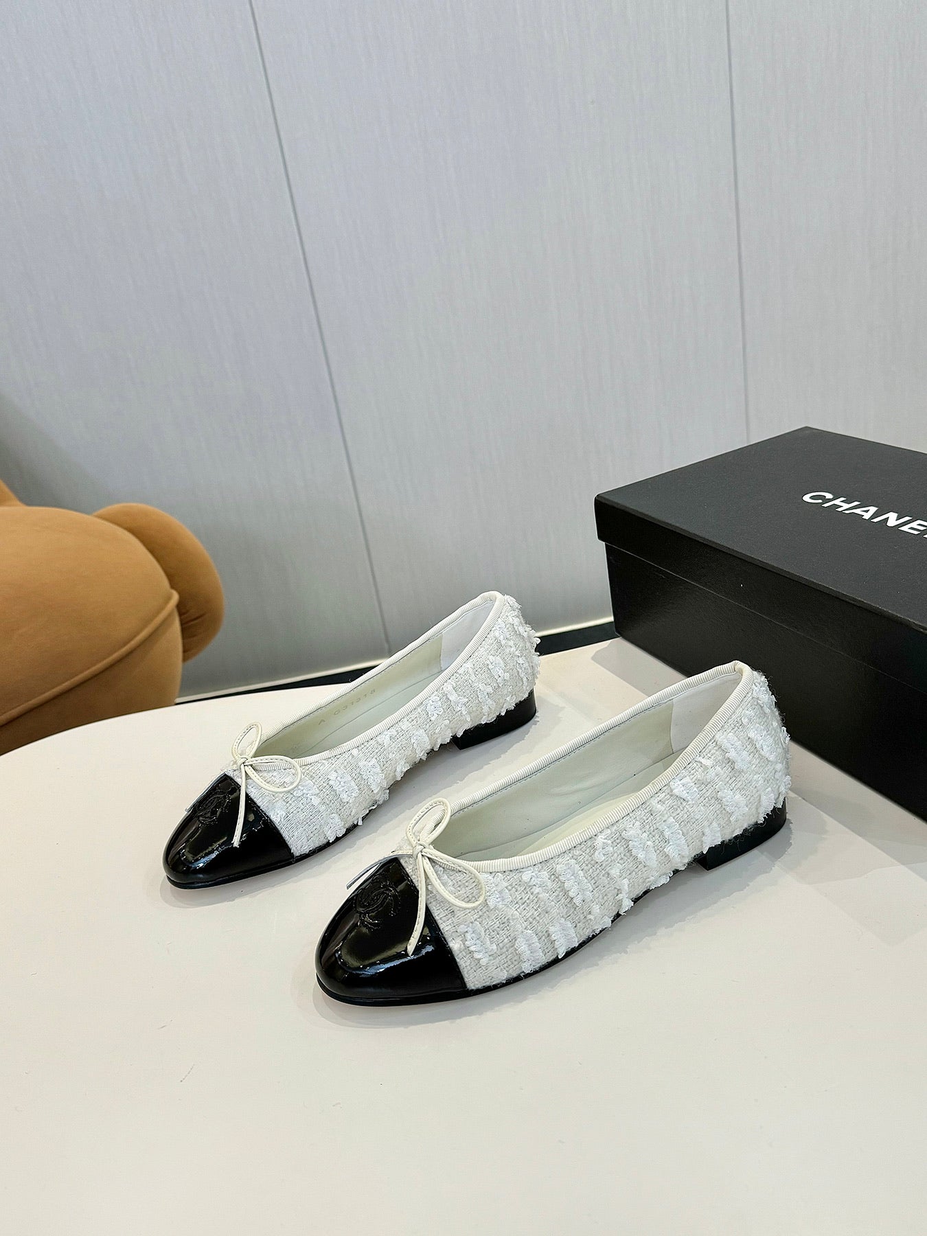 cc 25c ballerina piatta tweed bianco grosgrain nero 233625
