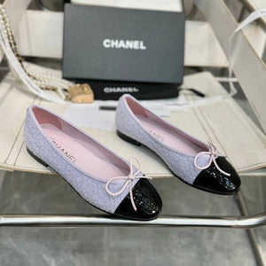ballerina in tweed viola chiaro in pelle di vitello verniciata nera