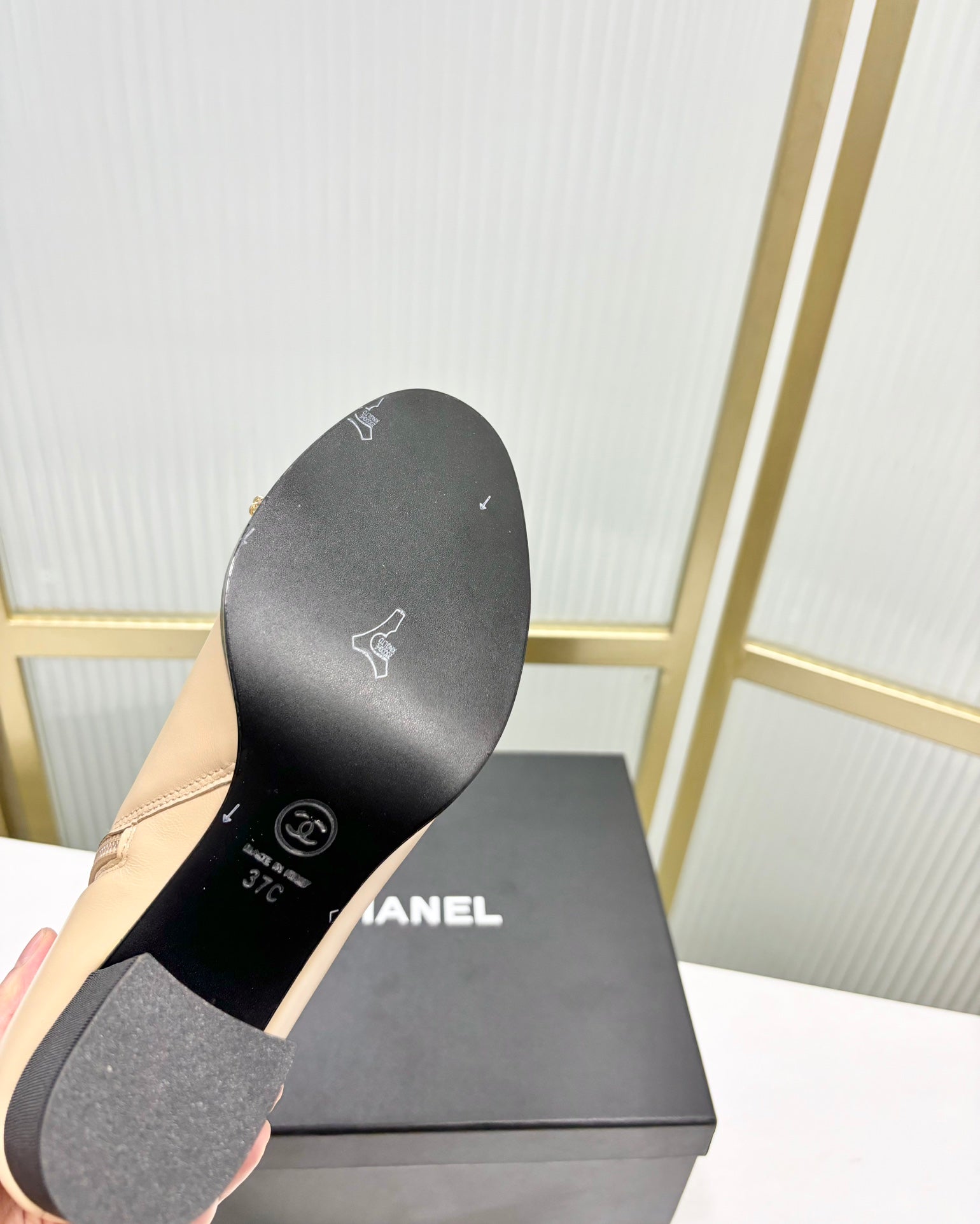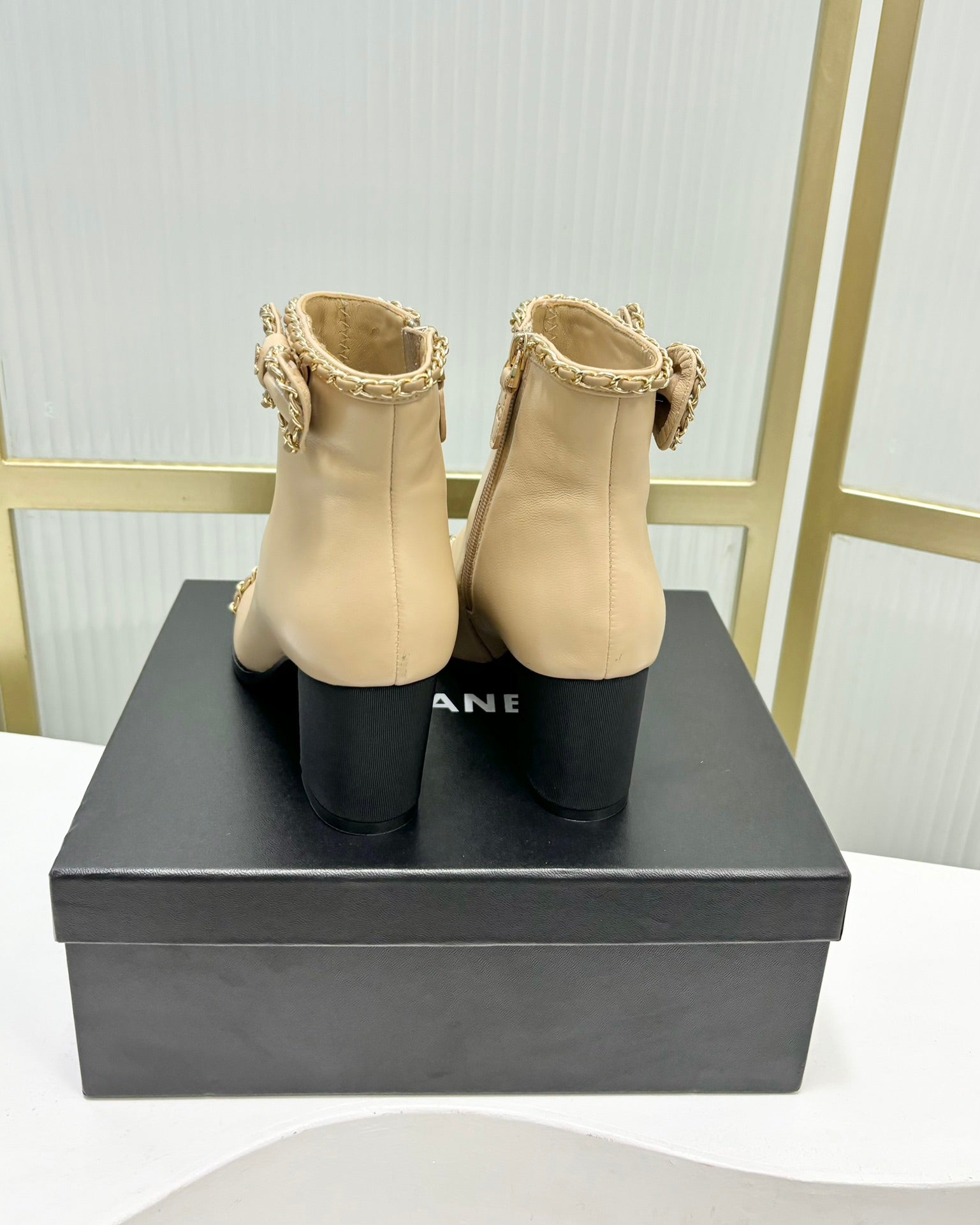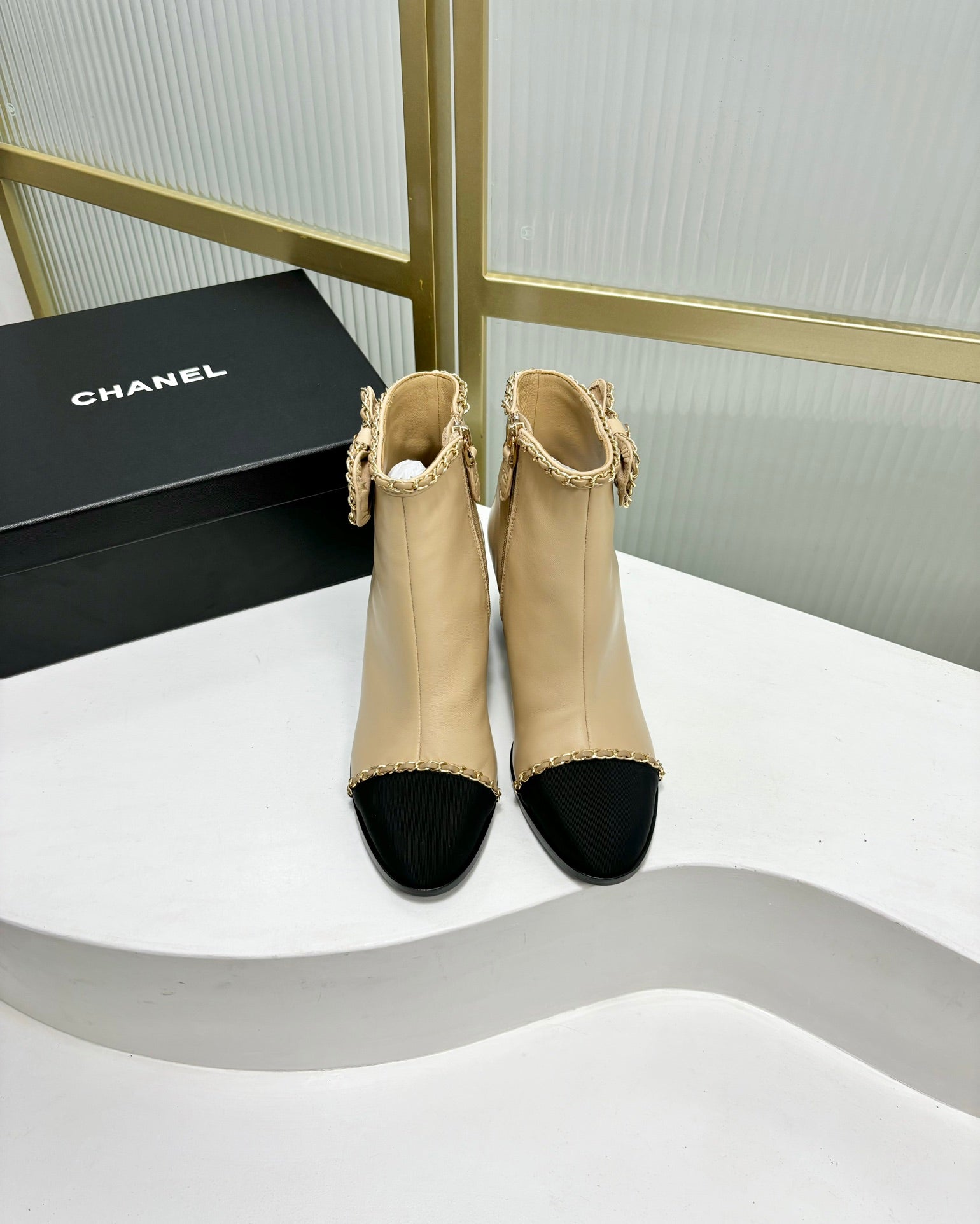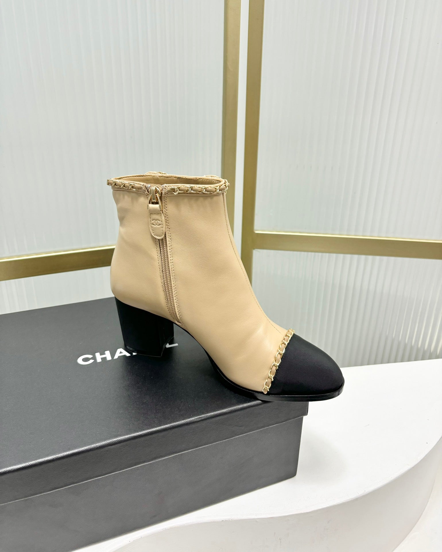 Stivaletto CC 65 in vitello beige con cinturino in pelle grosgrain nera