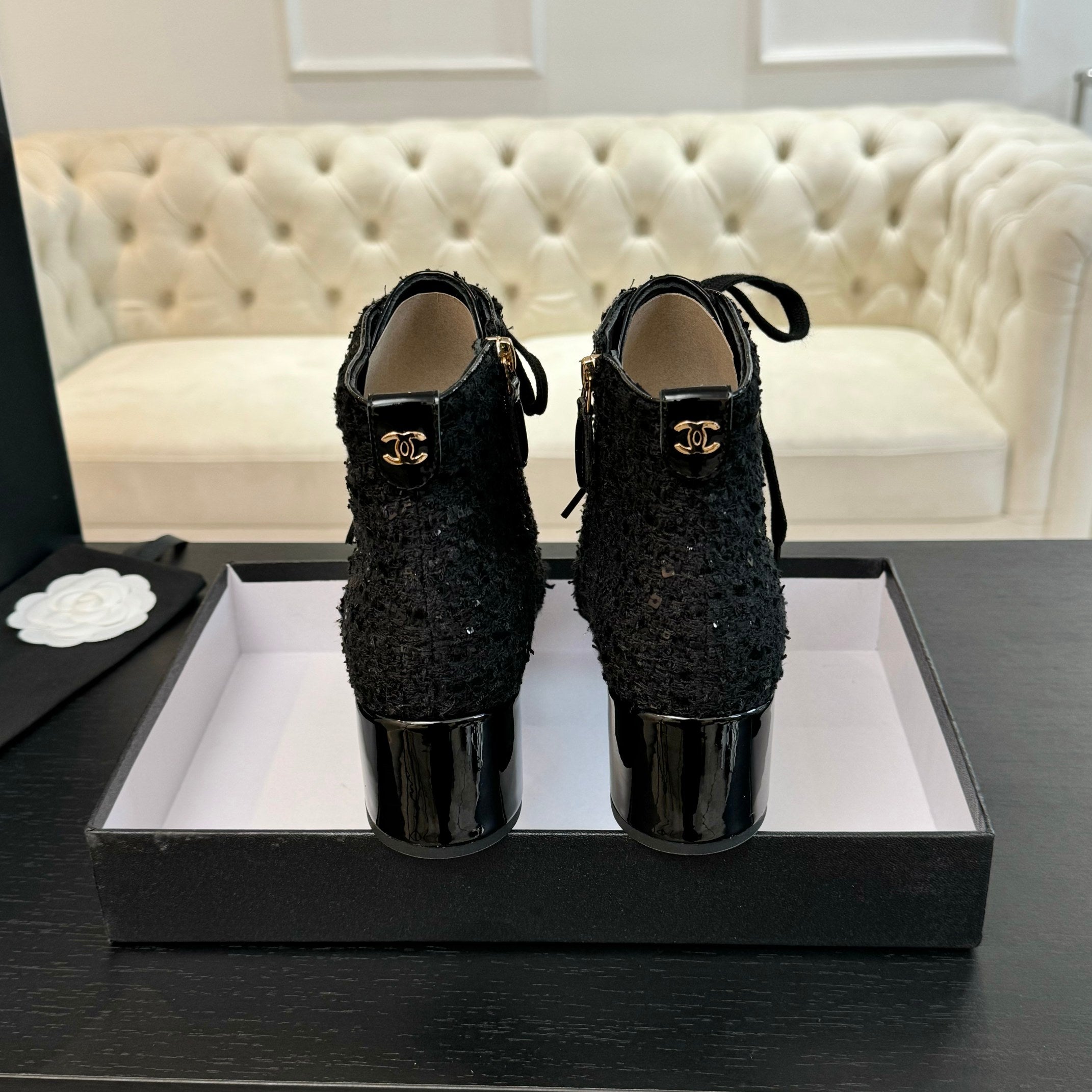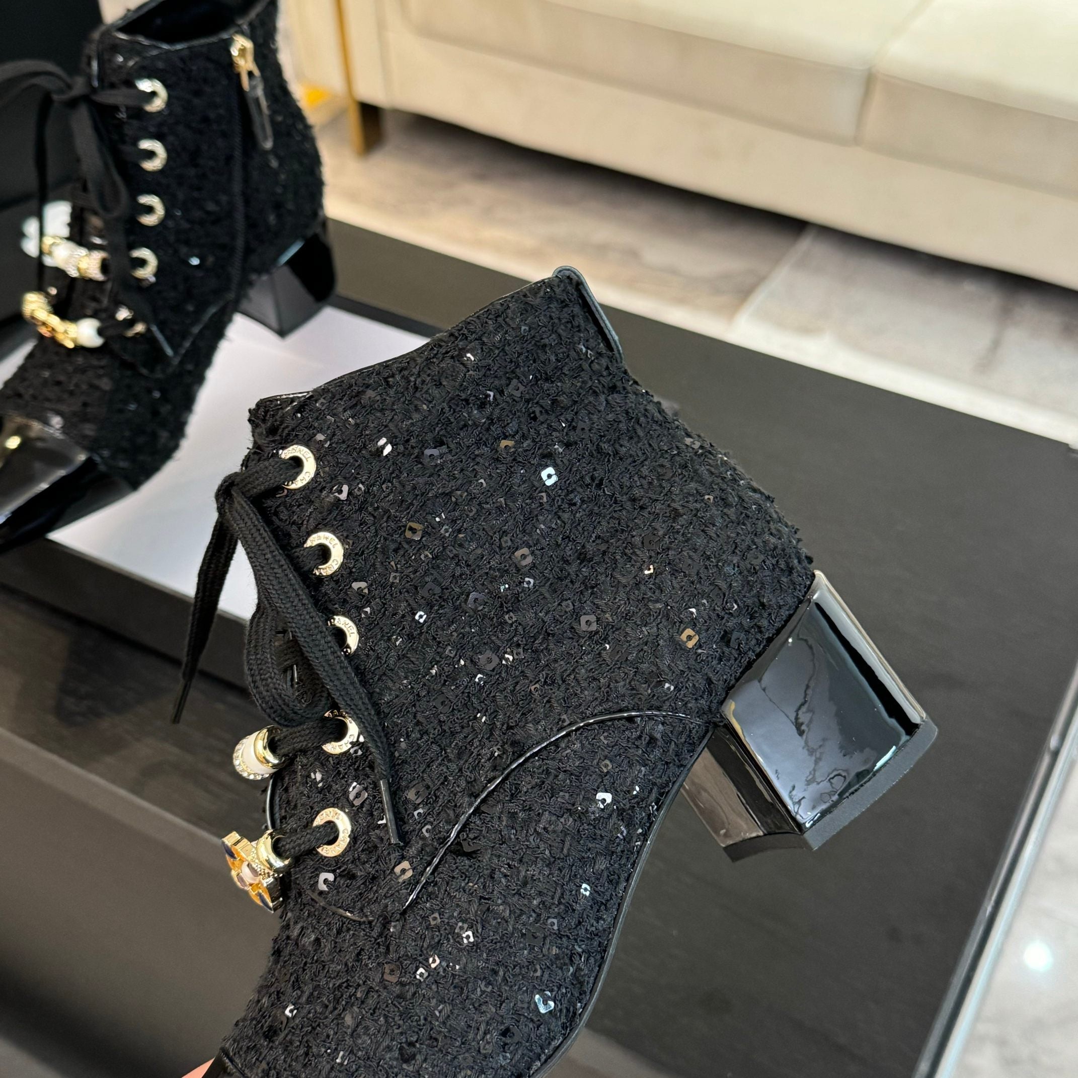 Stivaletti CC in tessuto tweed con perline nere e pelle di agnello