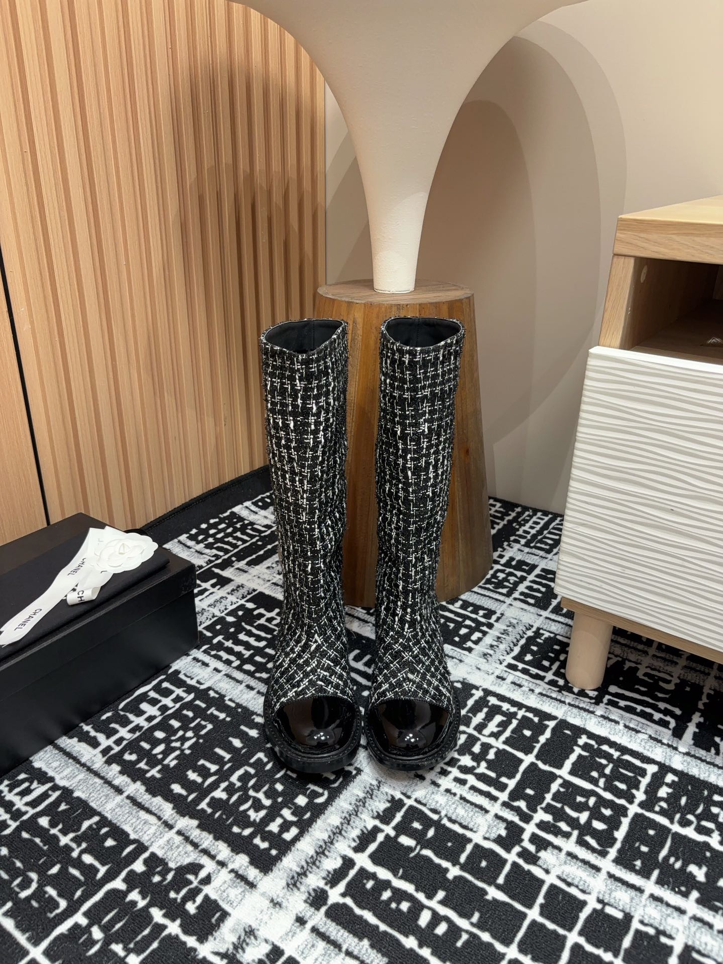 Stivali alti CC in misto lana bianca e tweed nero e pelle di agnello