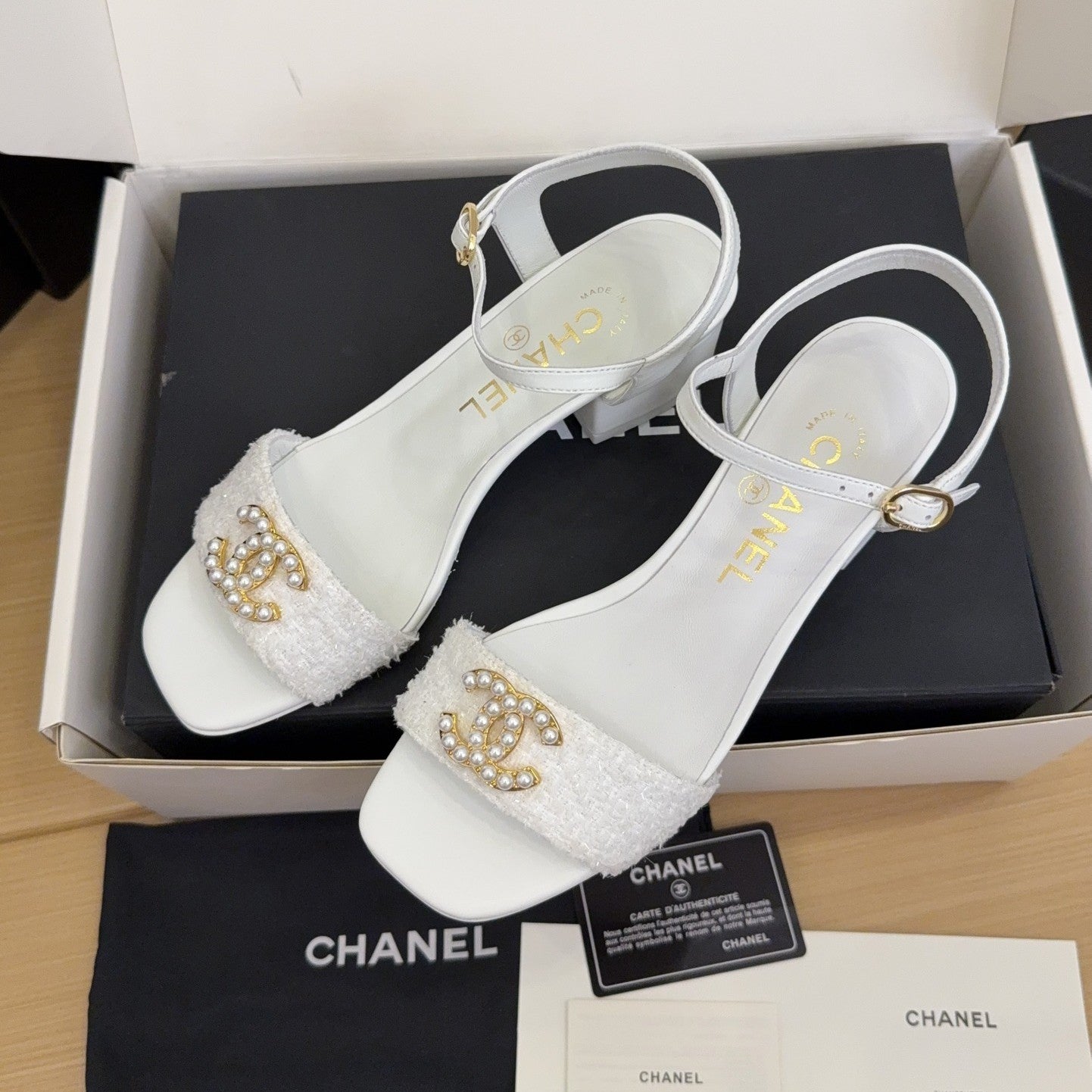 Sandali con tacco alto e perle con logo CC 25, 40, in tweed bianco e pelle di pecora, punta quadrata 277710