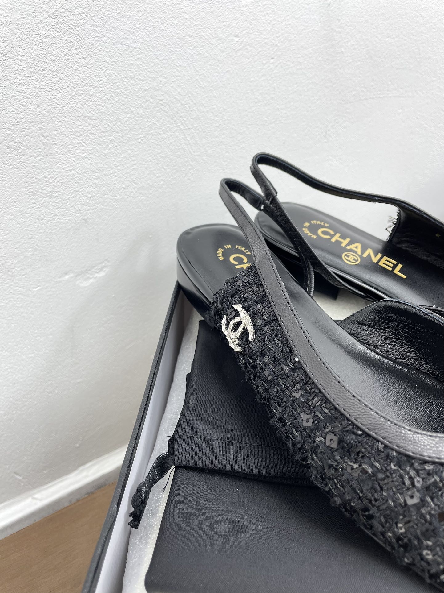CC Slingback in tessuto tweed nero e pelle di vitello
