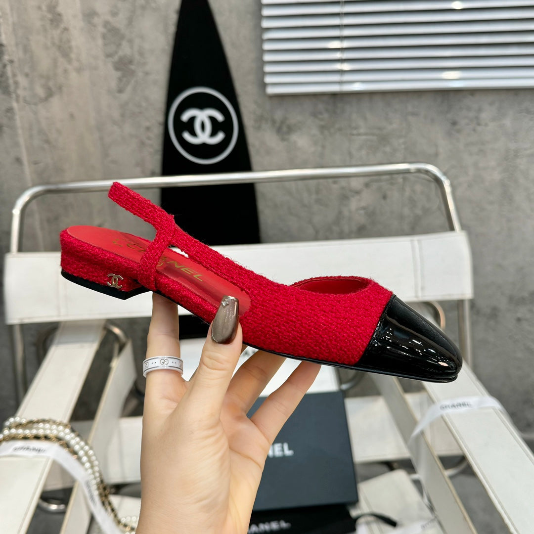 slingback piatte in tweed rosso e pelle di vitello verniciata nera