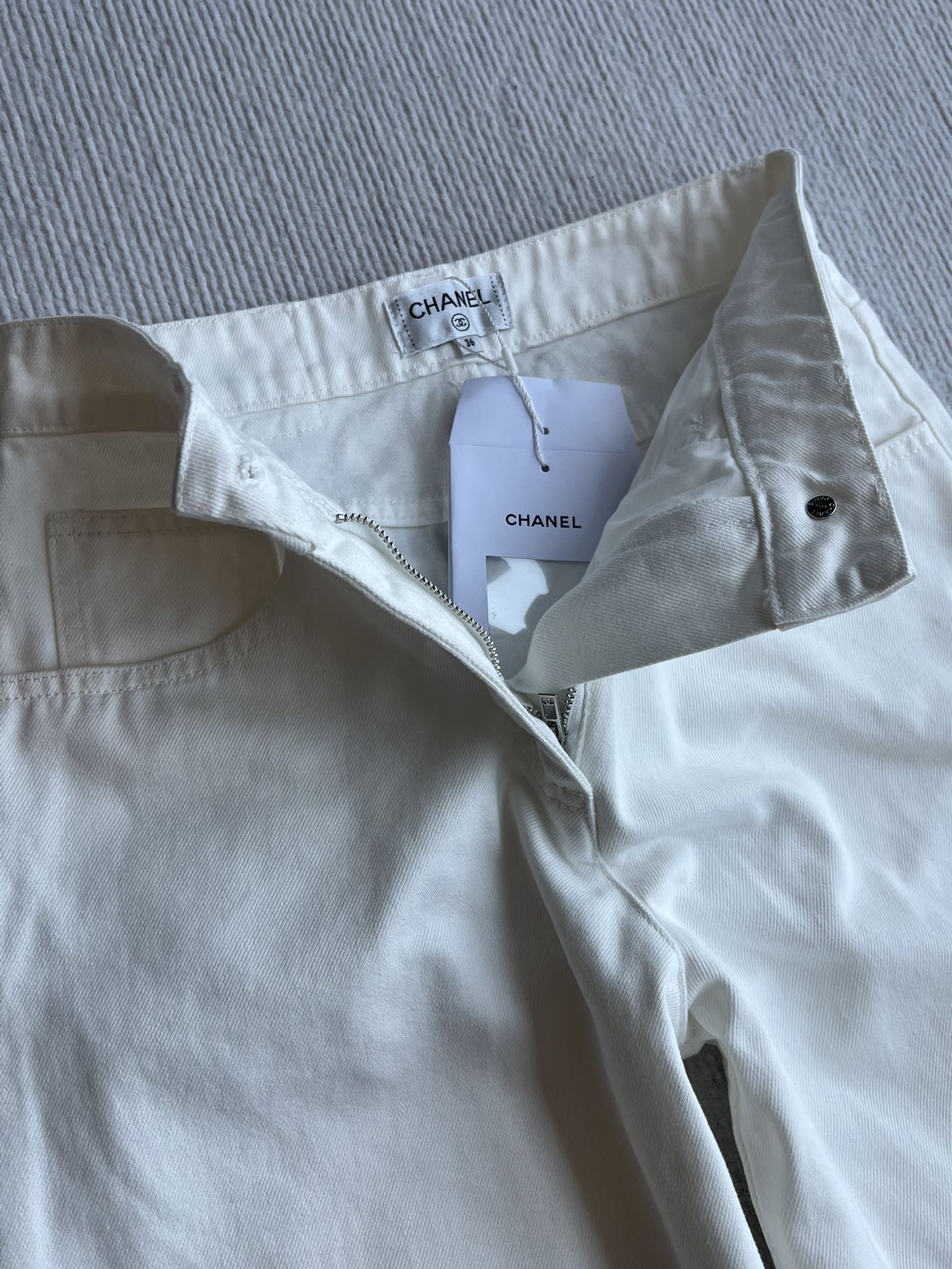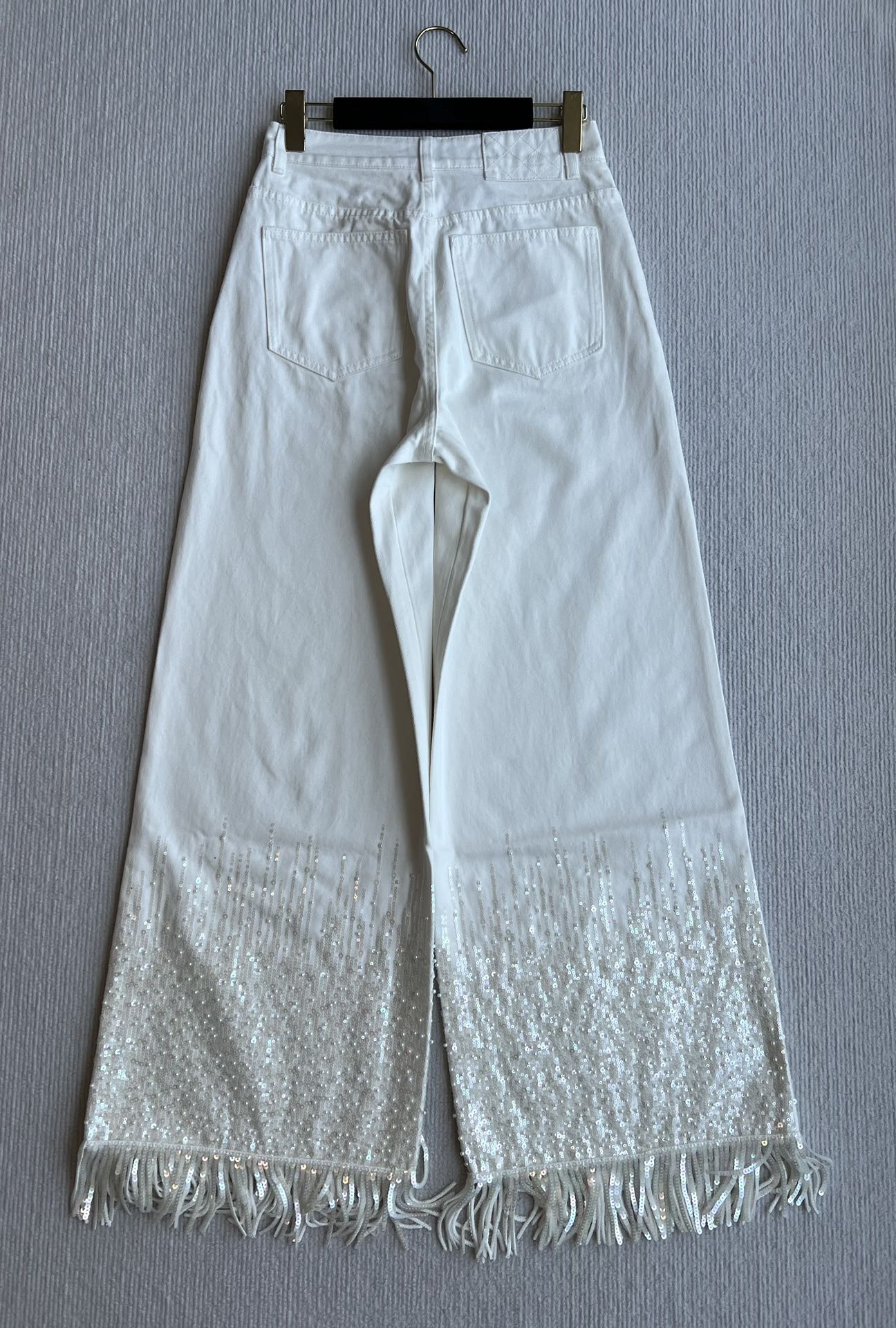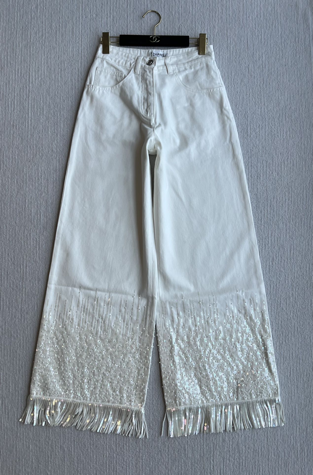 Pantaloni a gamba larga con perline e nappe in denim bianco CC 25SS 277238