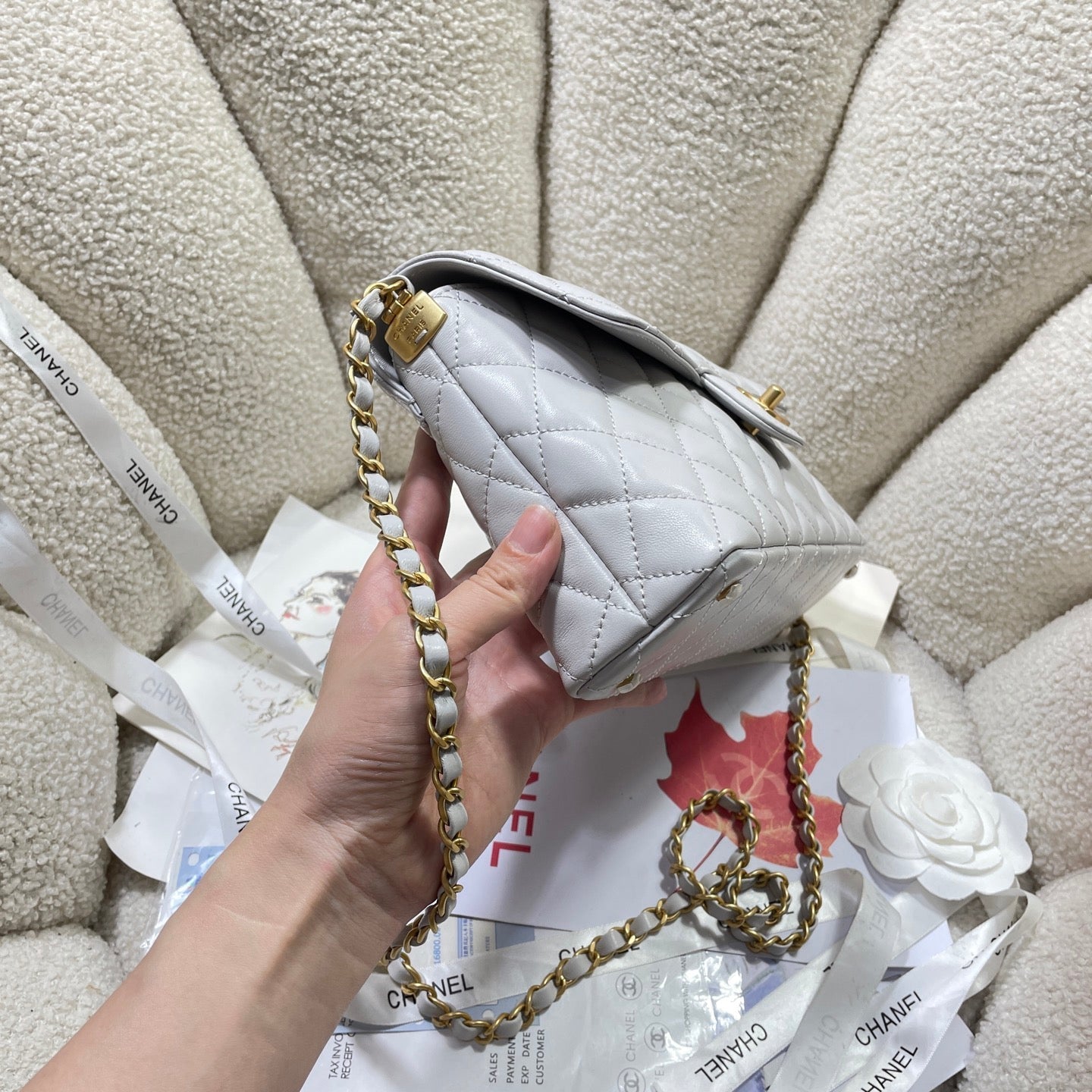 Borsa a tracolla media CC 25P con manico superiore da 25 cm, pelle di vitello grigia, finiture dorate