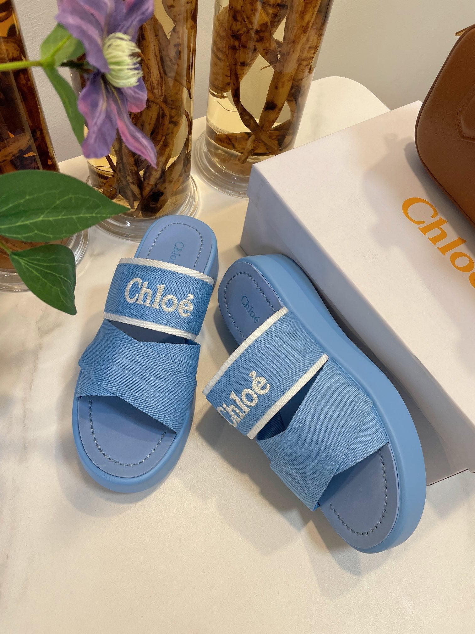SANDALI CON ZEPPA CHLOÉ WOODY IN TELA BLU CERULEO CON SUOLA IN GOMMA
