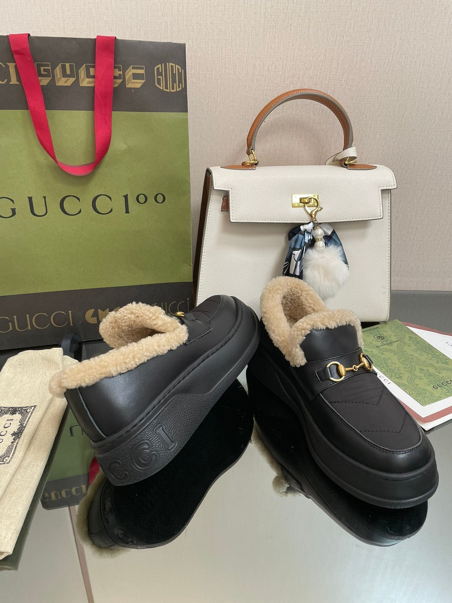 MOCASSINO GG IN PELLE DI VITELLO NERA CON FODERA IN LANA BEIGE