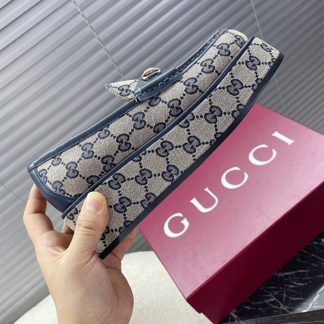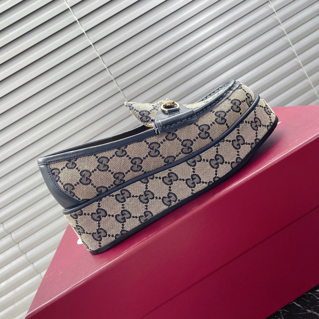 MOCASSINO CON PLATEAU HORSEBIT IN TESSUTO JACQUARD BEIGE E MONOGRAMMA E PELLE DI VITELLO BLU NAVY