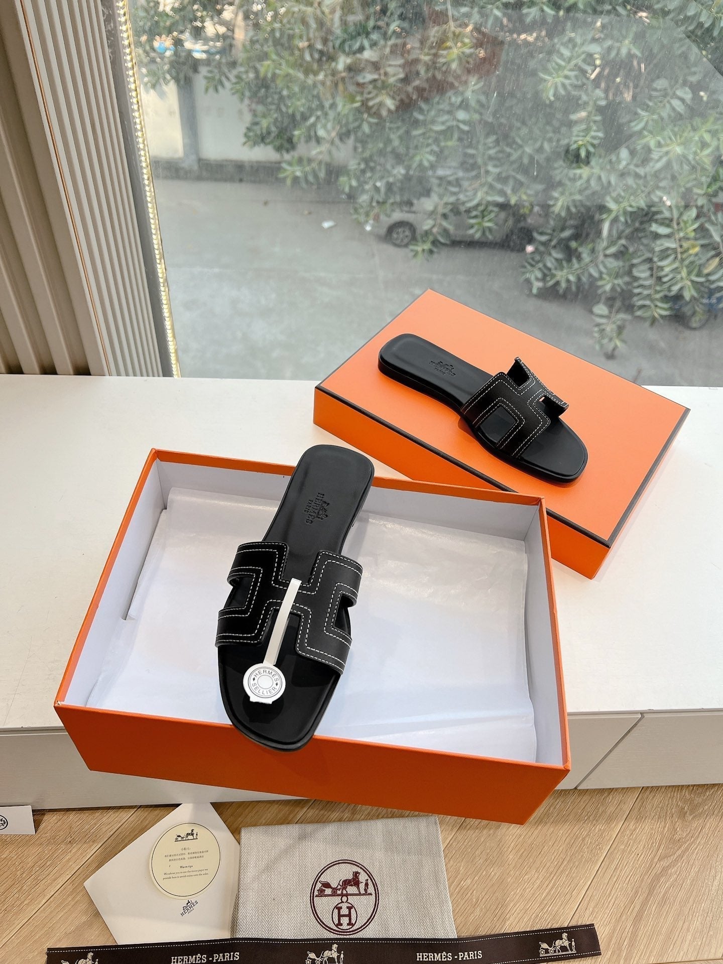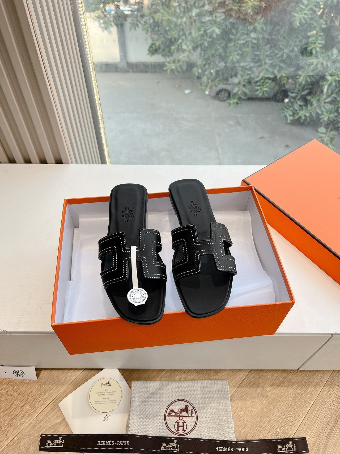 Sandalo HM 25 Oran in pelle di vitello nera con ricamo in filo bianco