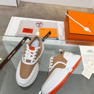 Sneaker HM Giga 50 in tela morbida color talpa, pelle di capra bianca e arancione