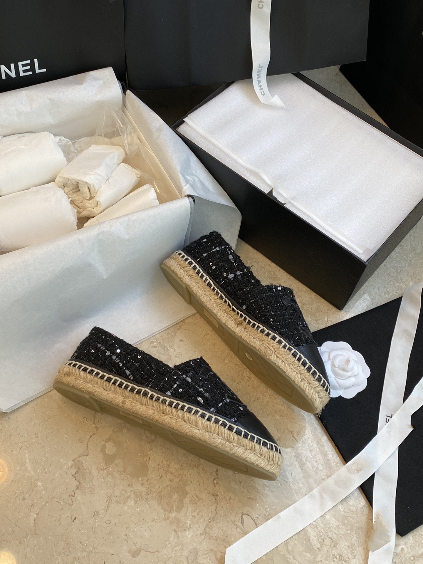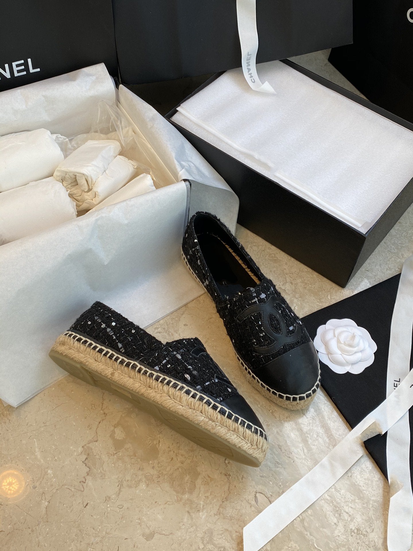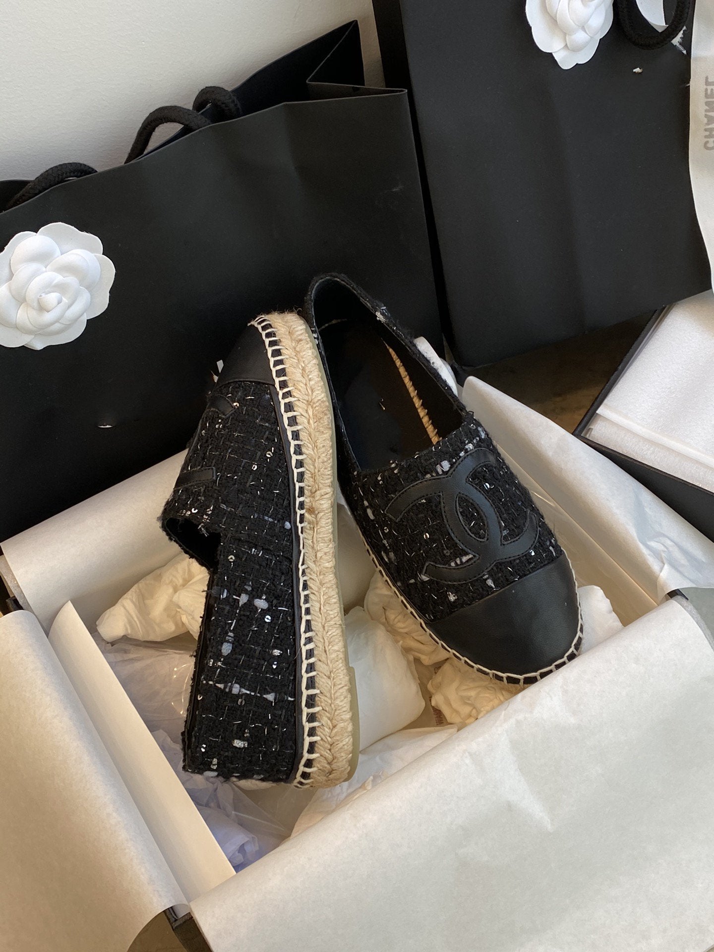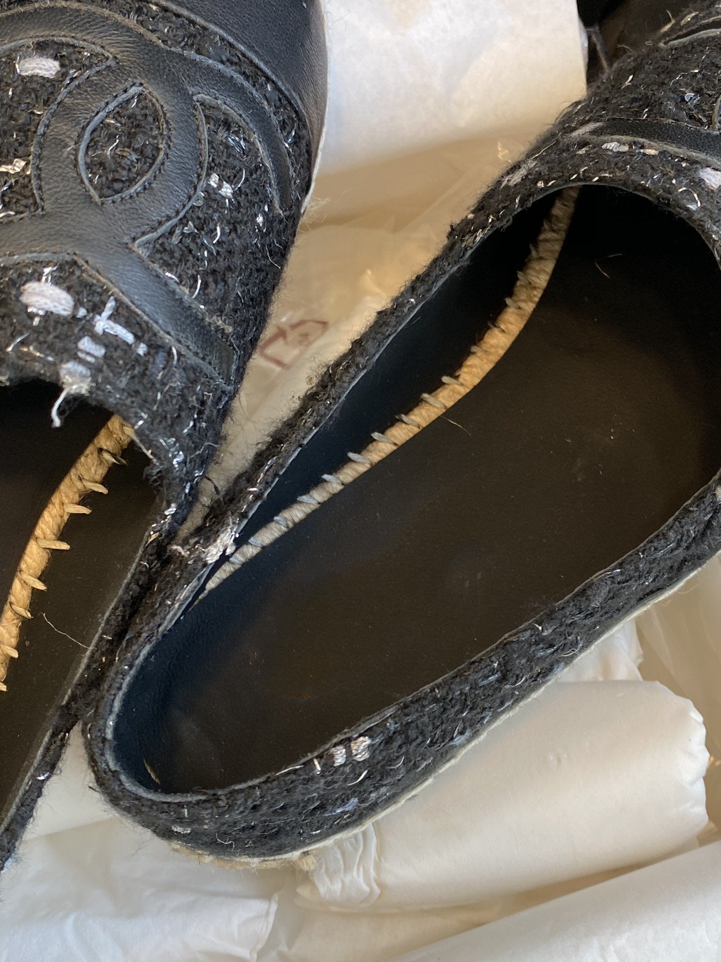 espadriles nere bianche tweed pelle di agnello nera