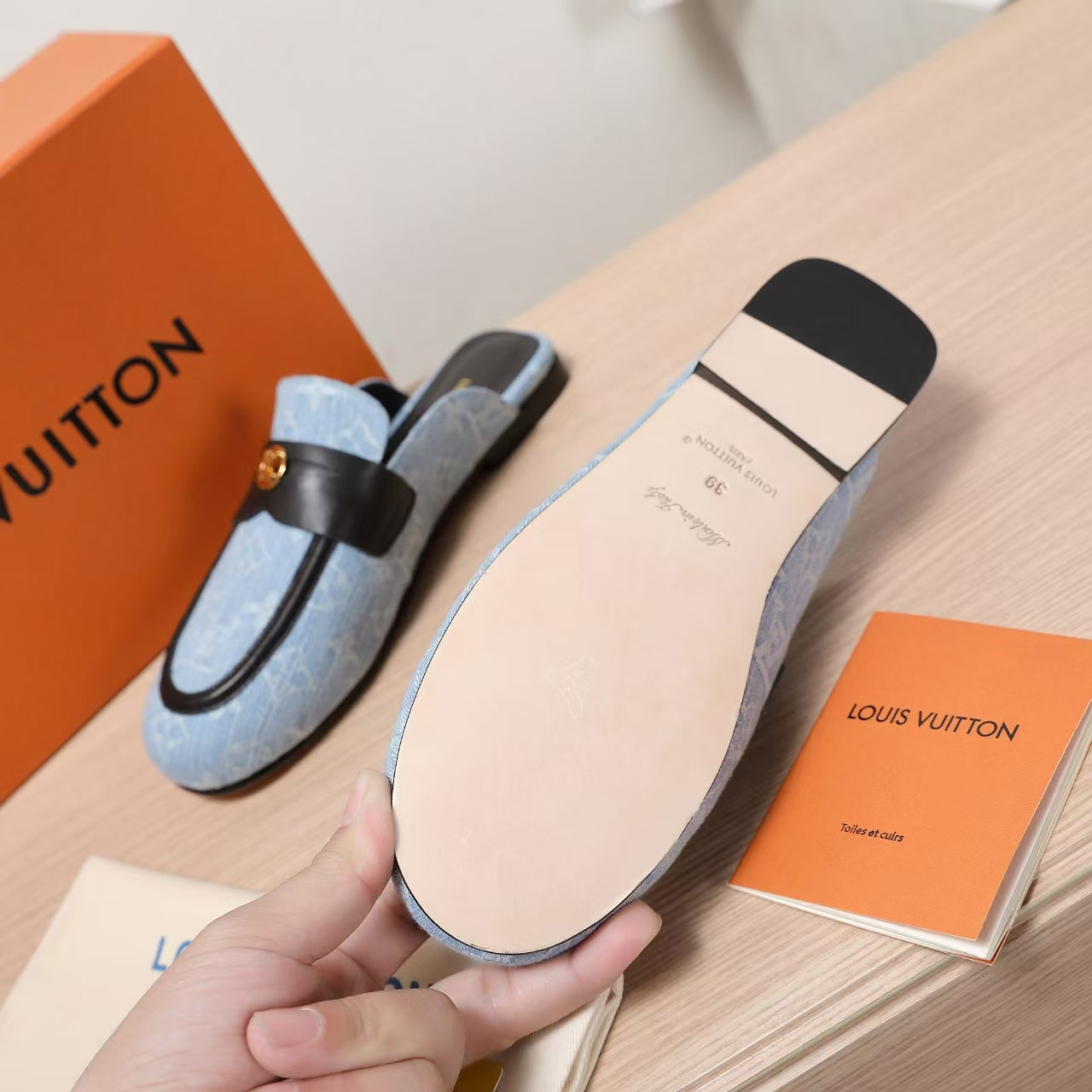 LV 25C Flat Mule Blu Pastello Monogram Pelle di Vacchetta 218316