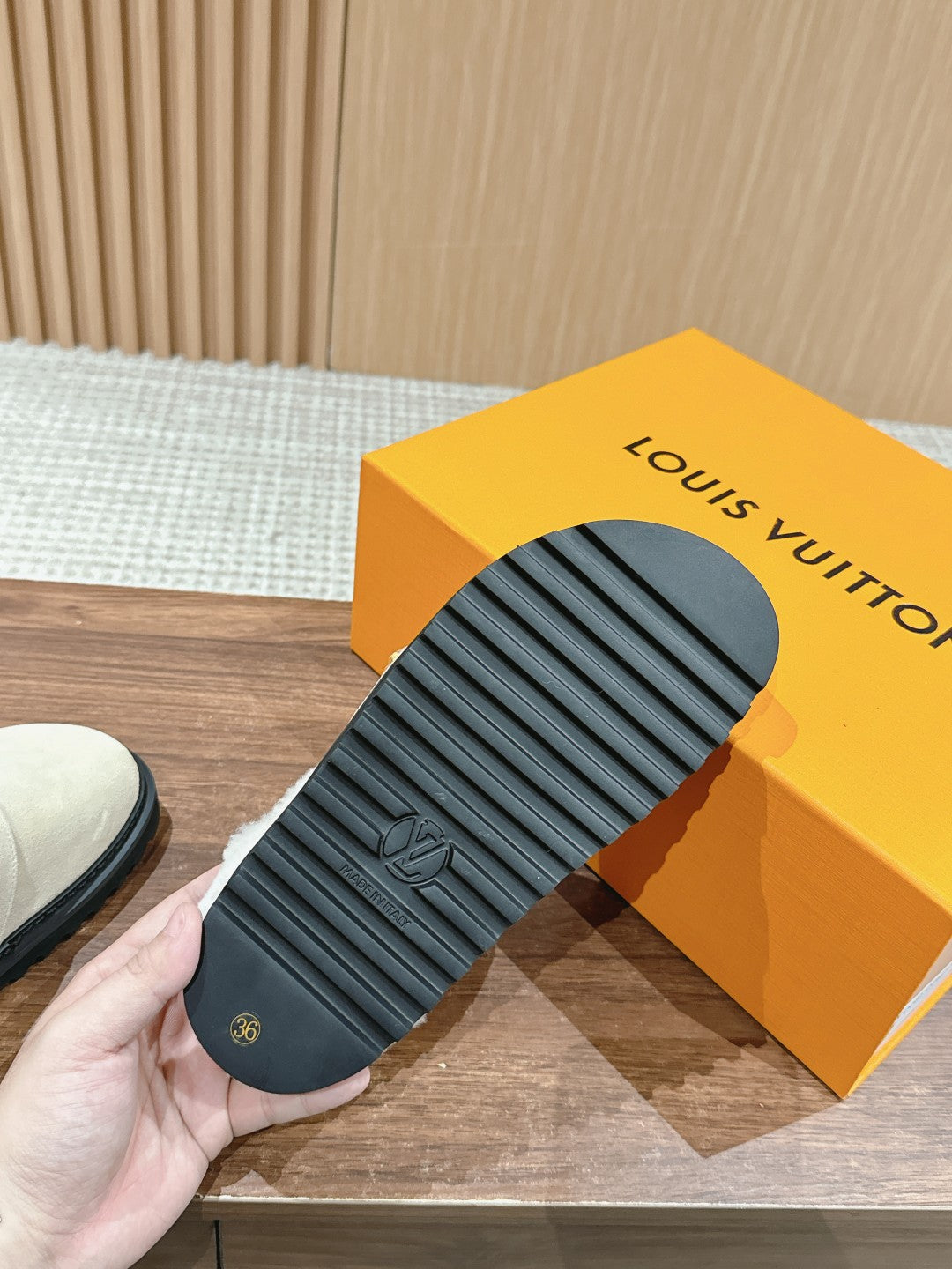 Zoccoli LV Cozy Flat Comfort in pelle scamosciata beige con fodera in pelliccia