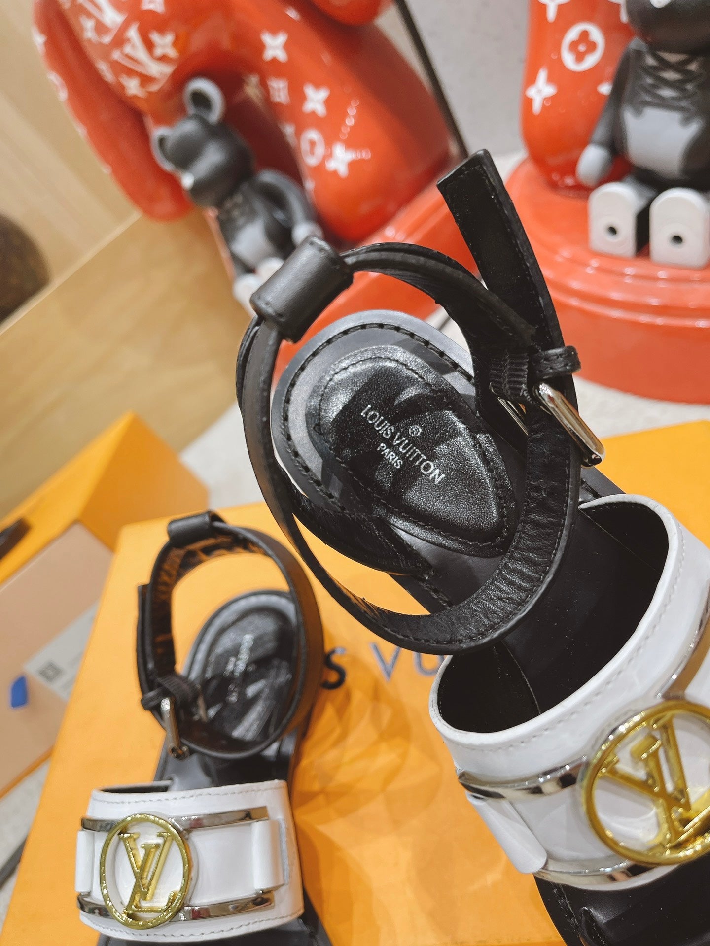 Sandalo piatto LV Academy in pelle di vacchetta nera e bianca