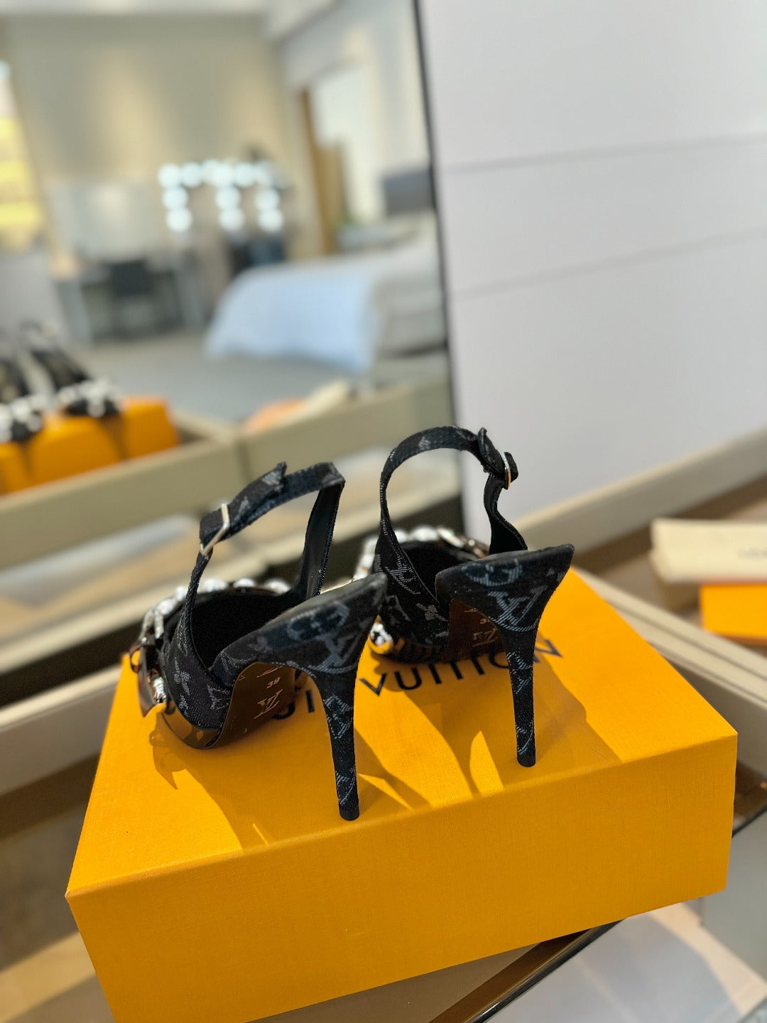 TACCO ALTO 95 MM IN DENIM NERO MONOGRAM CON CRISTALLI