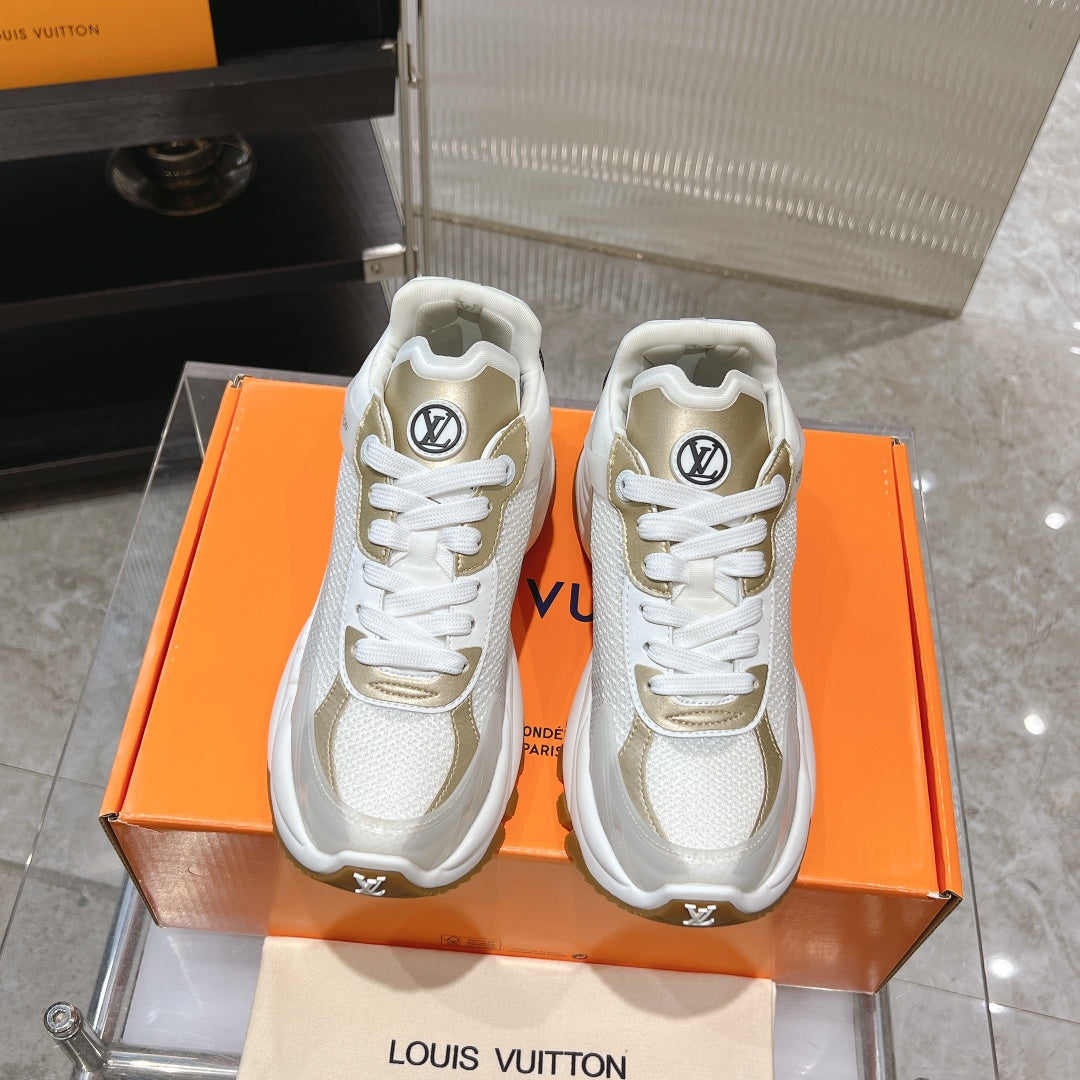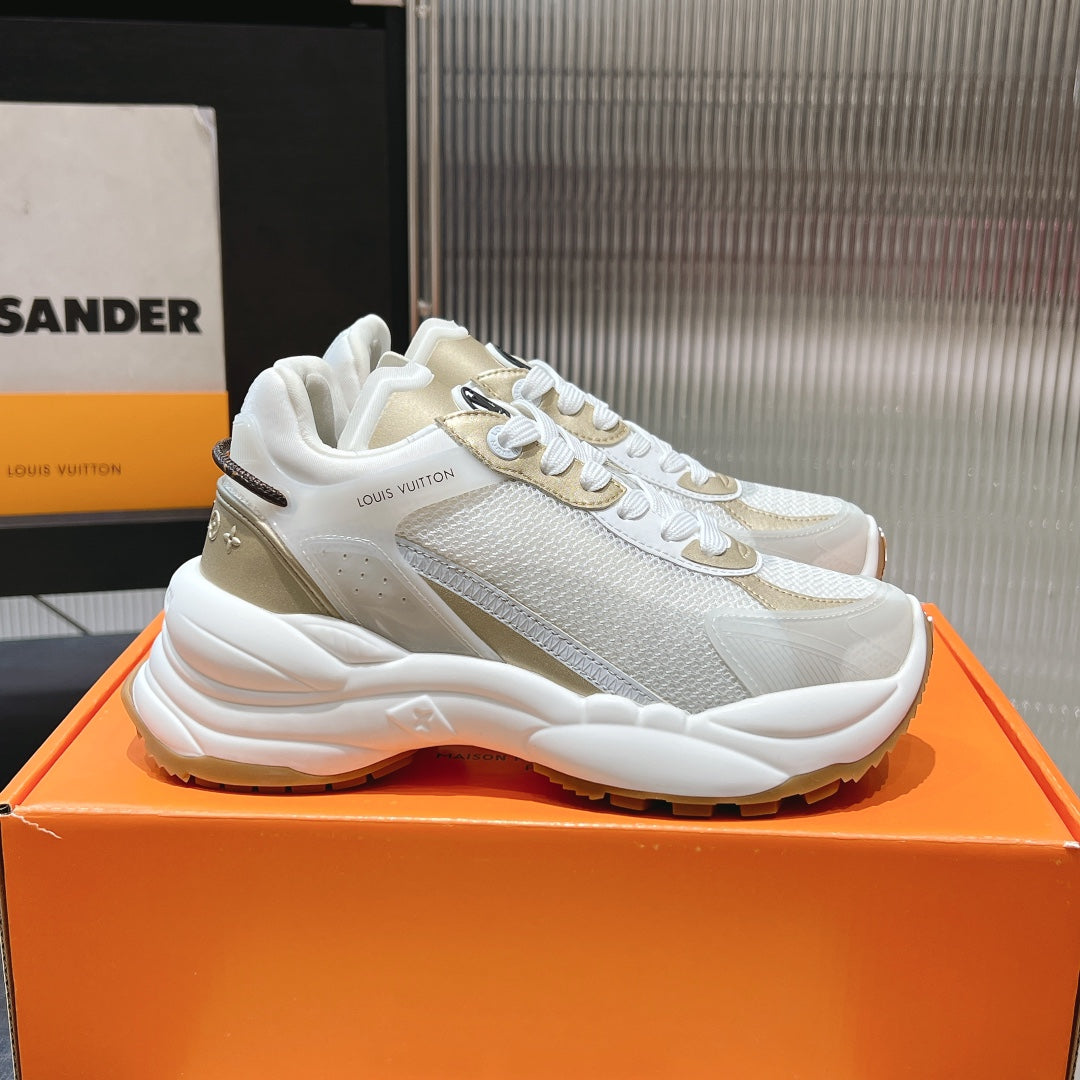 Sneaker LV Run 55 da 50 mm in tessuto a rete di poliestere bianco oro