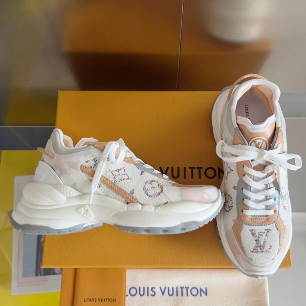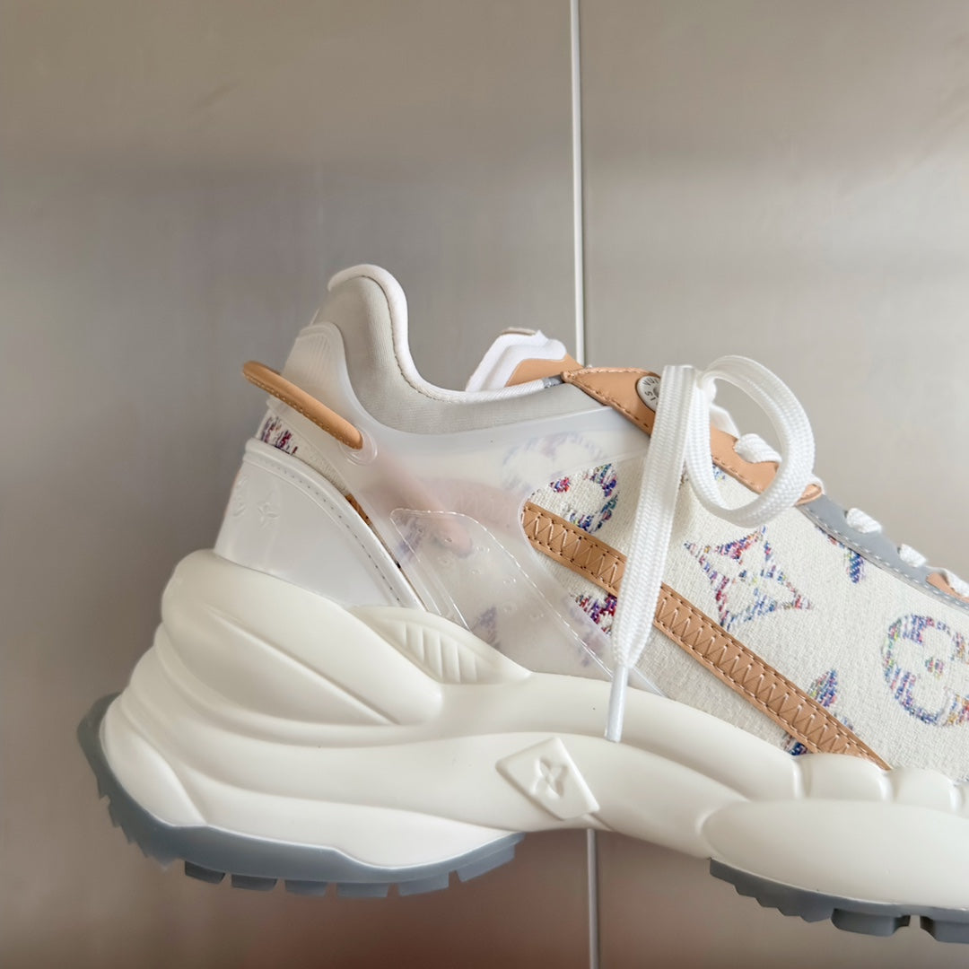 Sneaker LV Run 55 da 55 mm, tessuto jacquard monogrammato bianco misto marrone beige