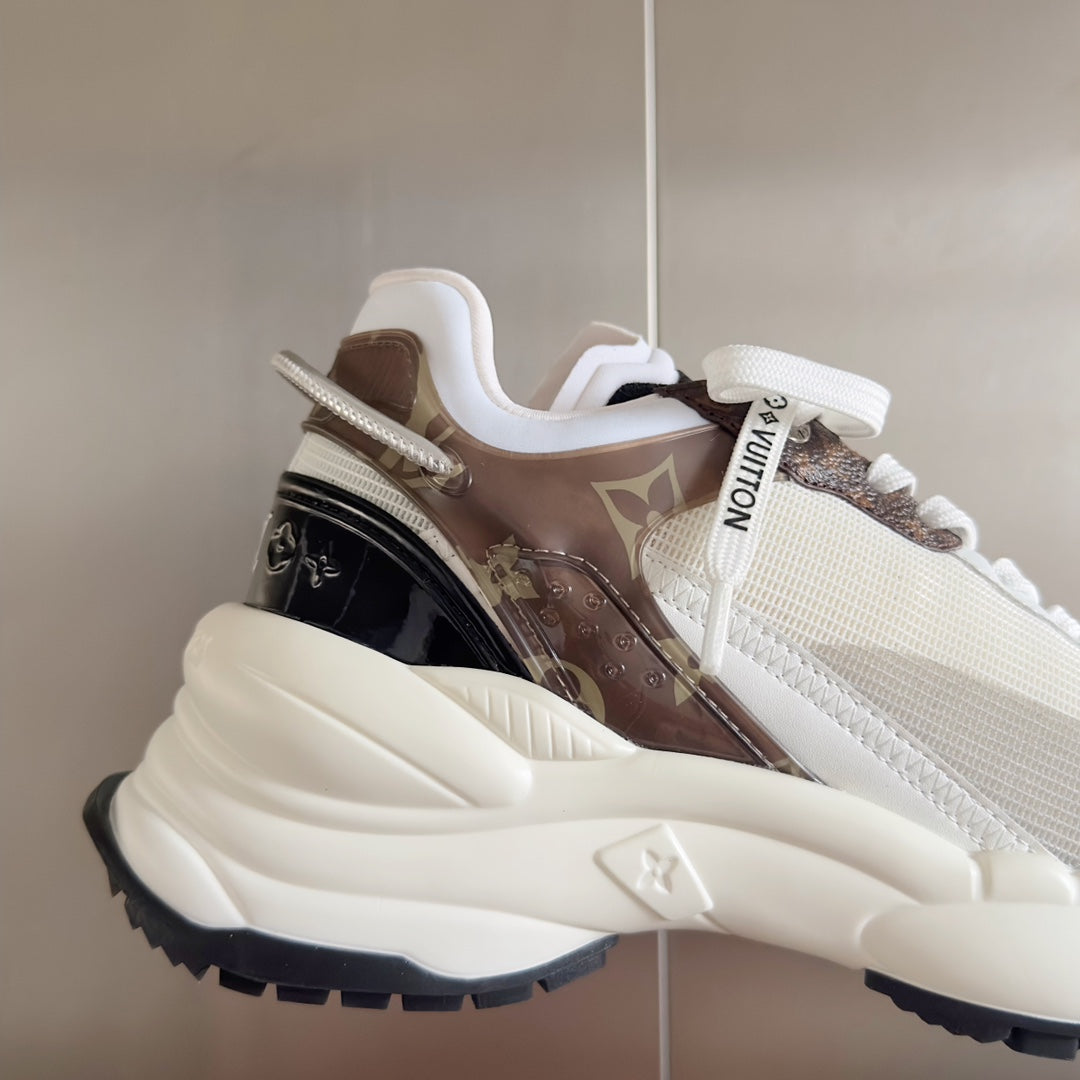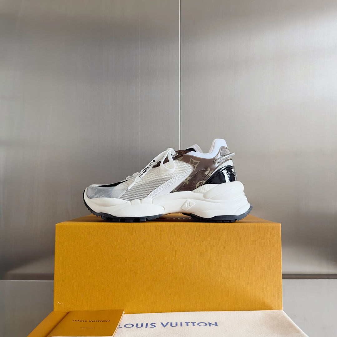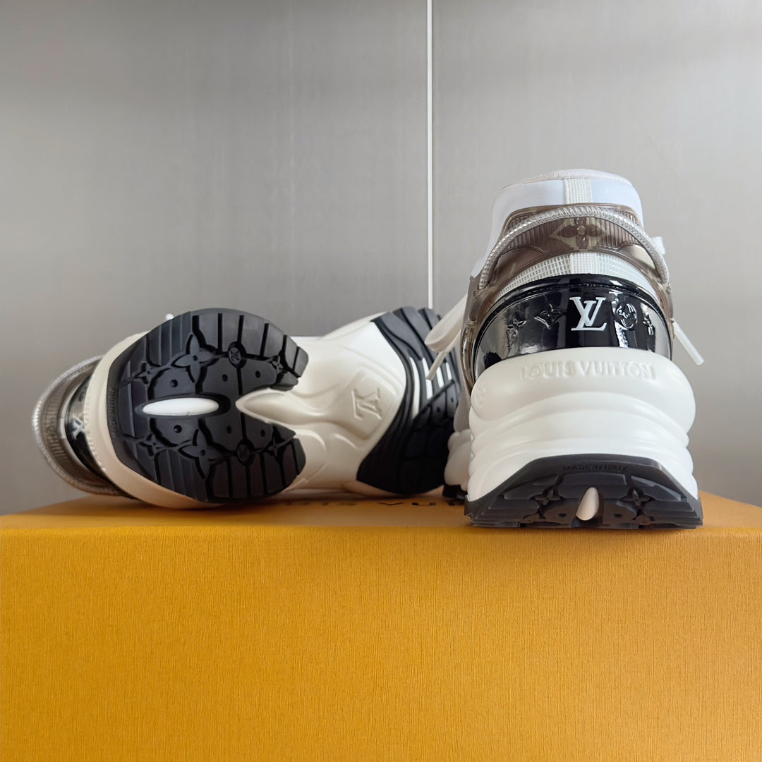 Sneaker LV Run 55 da 55 mm, tessuto a rete in poliestere monogrammato bianco misto marrone nero