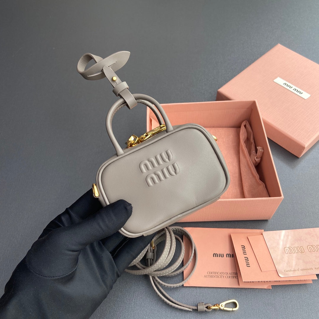 PORTACHIAVI MICRO BAG 11 IN PELLE DI VITELLO GRIGIO ARGILLA FERRAMENTA ORO LOGO IN RILIEVO