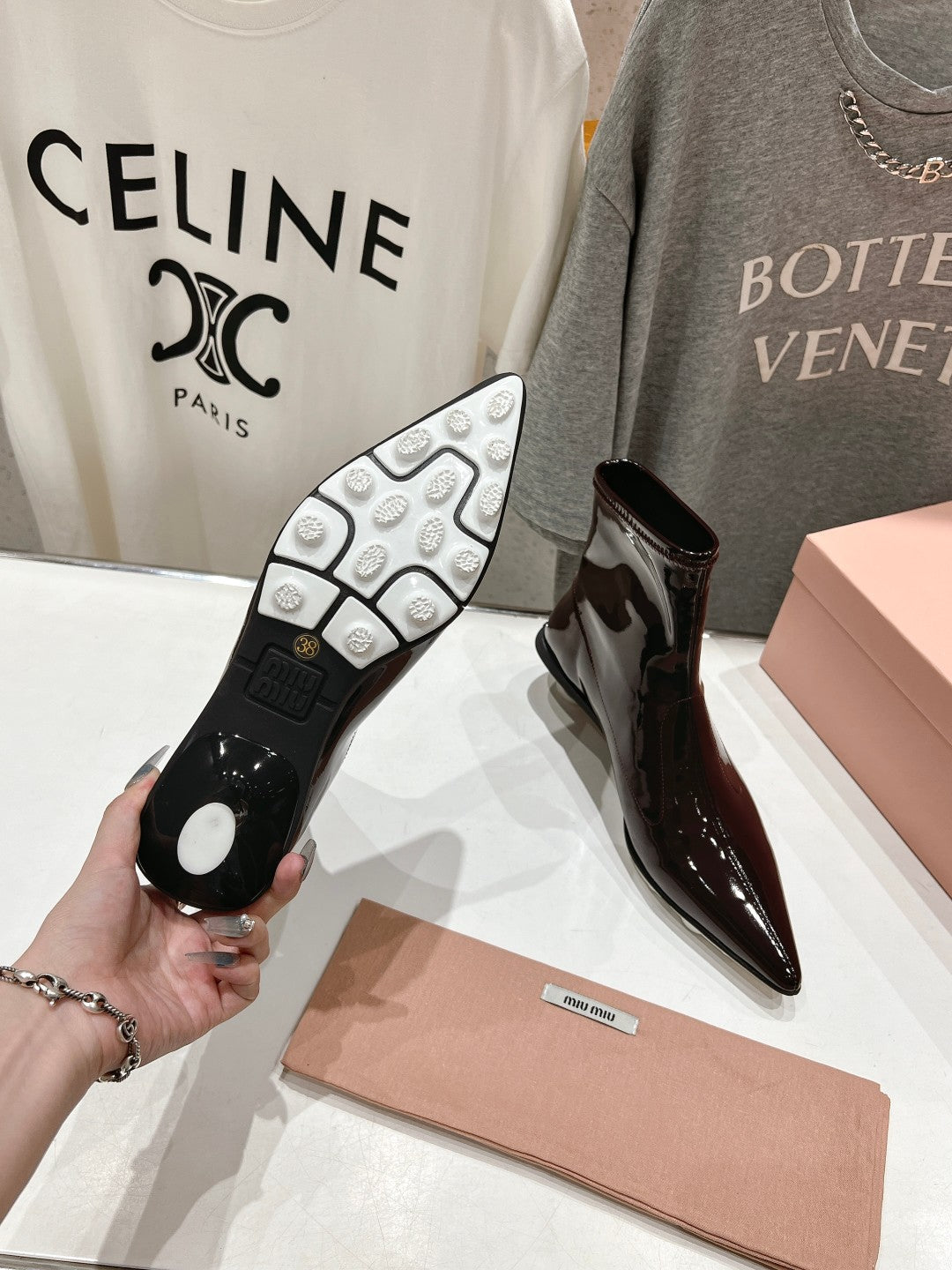 Stivaletti Miu a punta in pelle di agnello rosso marrone