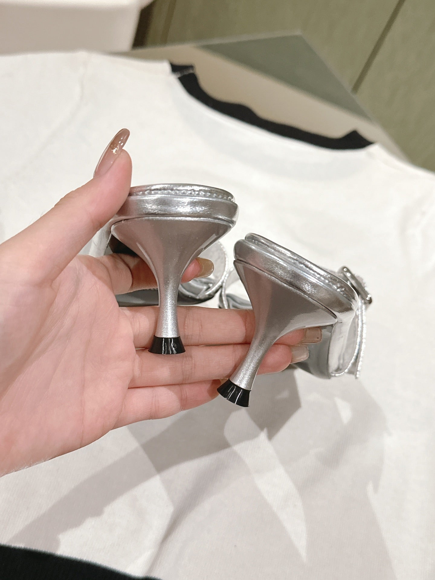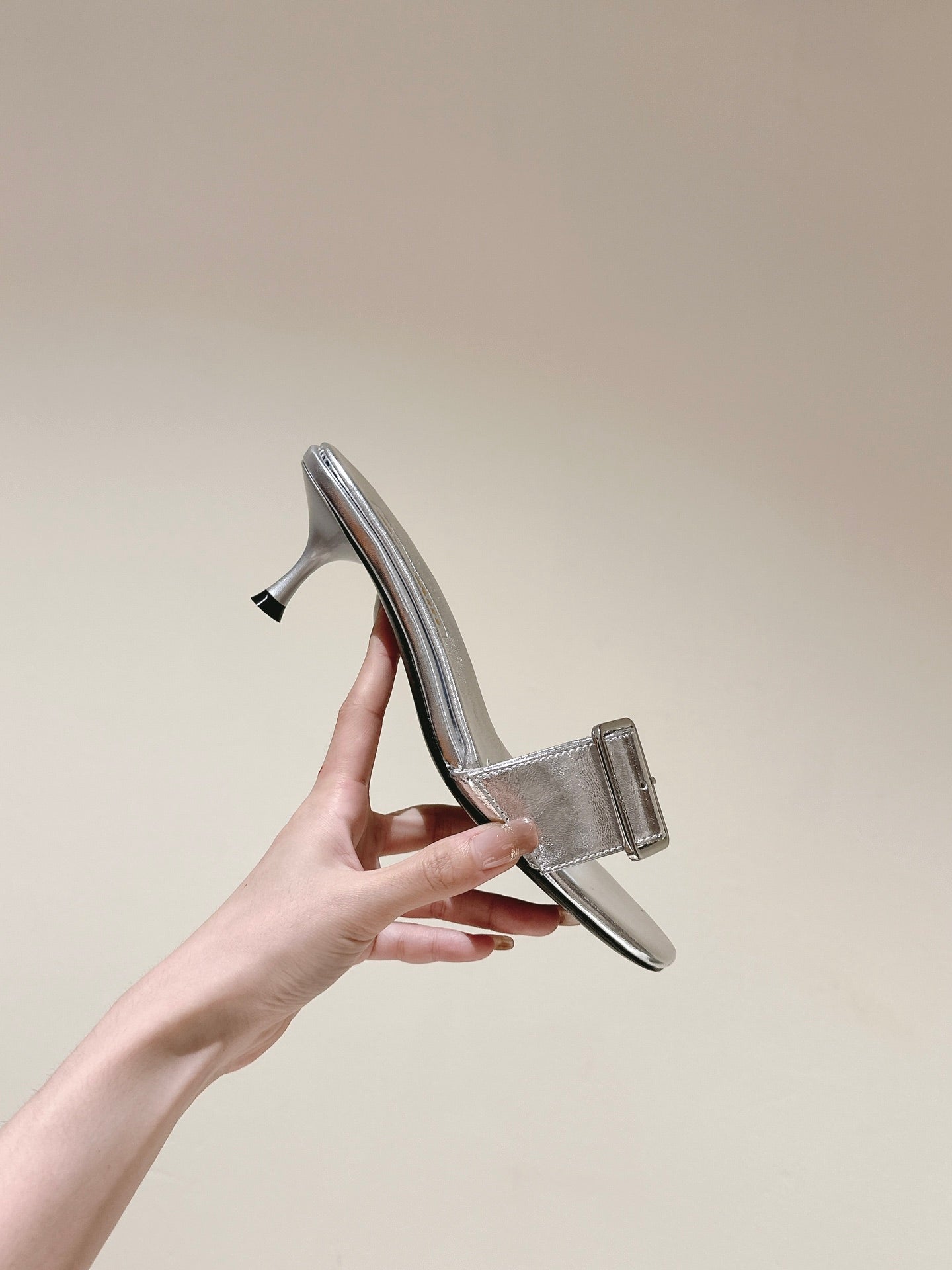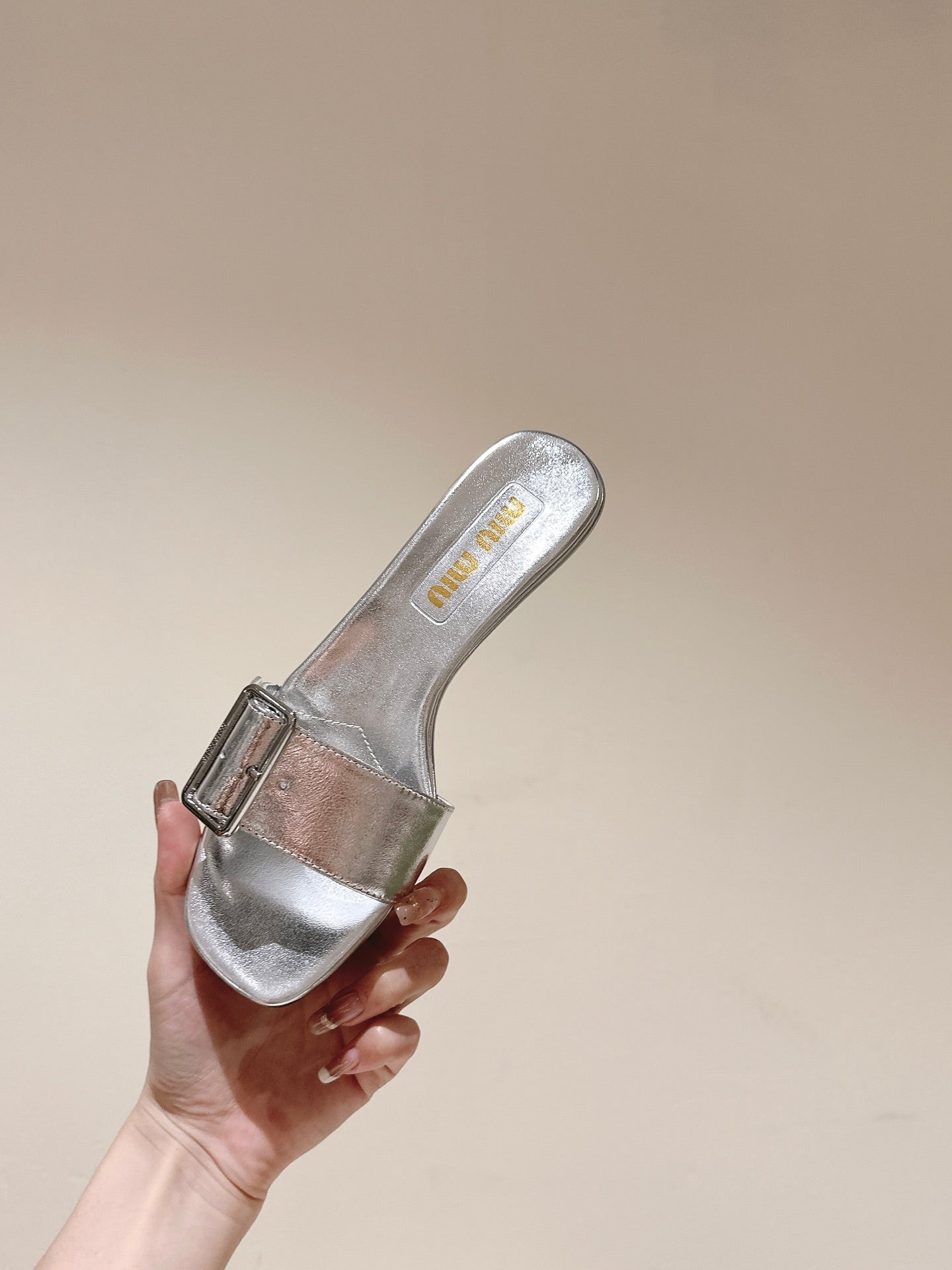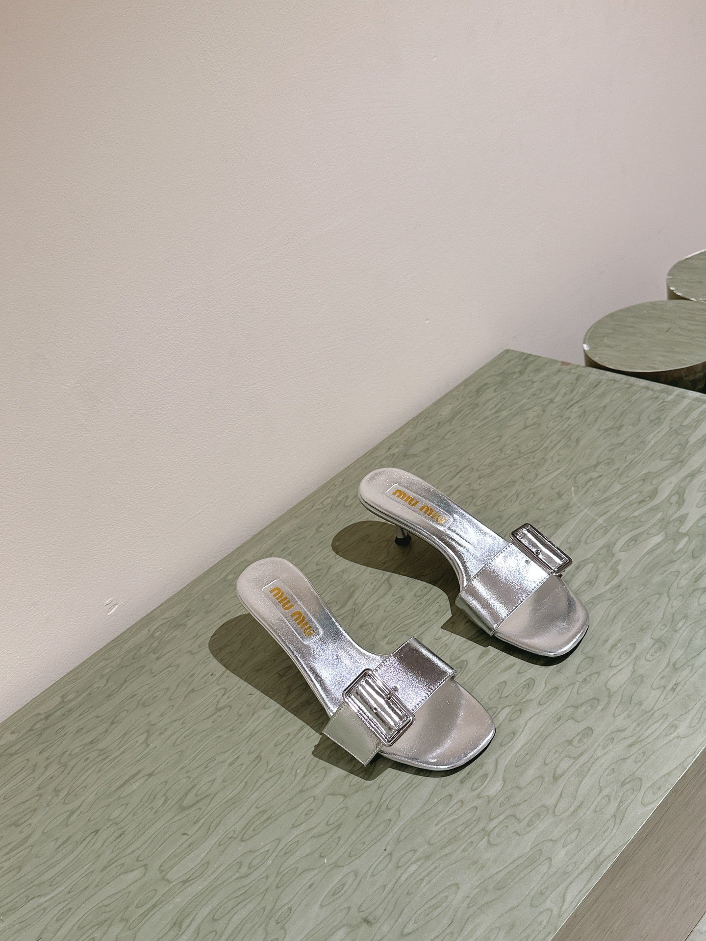 Miu x Balanc Studded Buckle Elegant Mules 45mm Sliver Patent Leather 445868