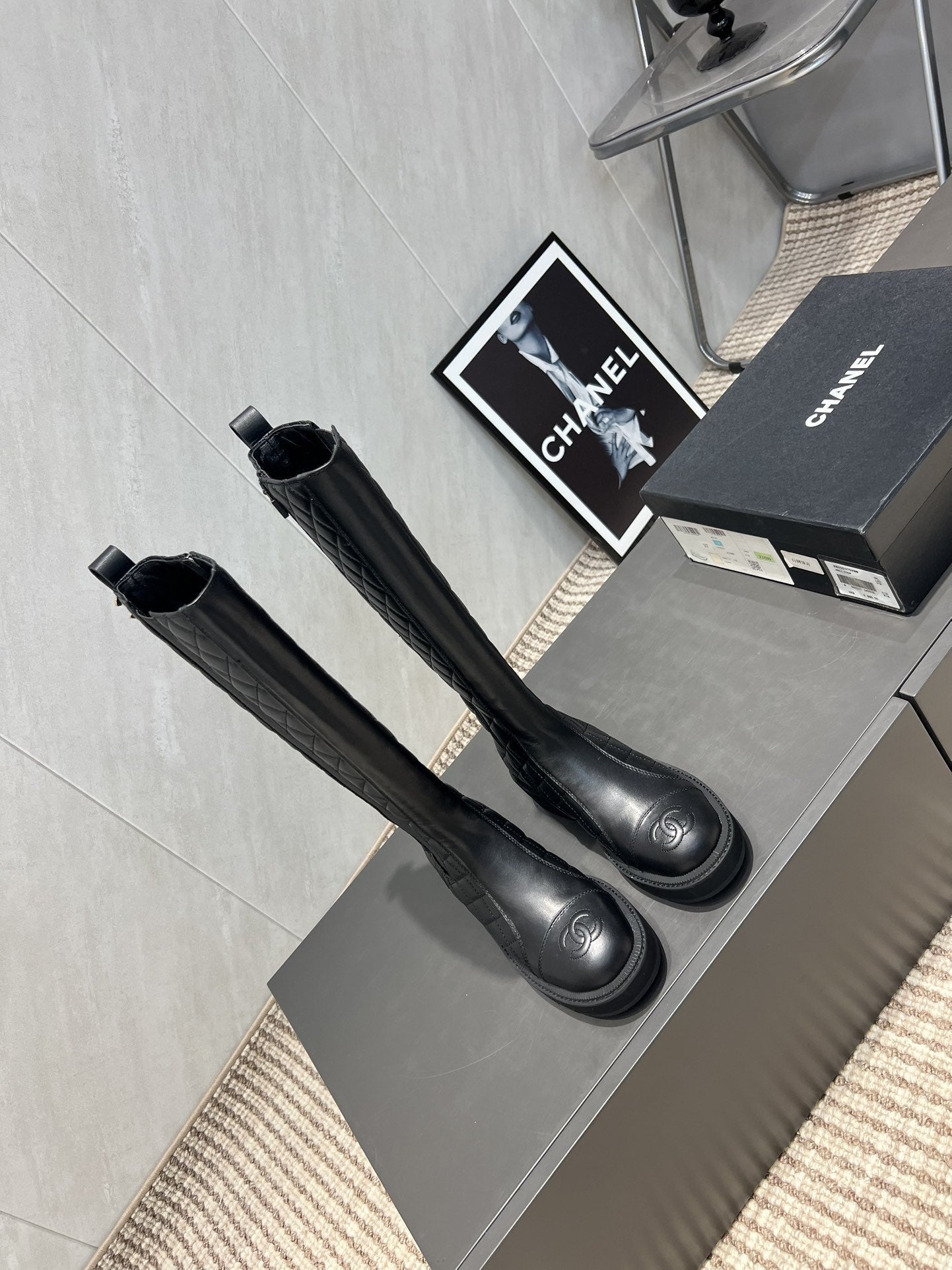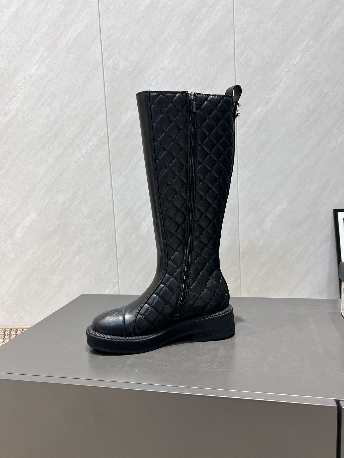 CC 25S Round Toe Mid-Heel Zippered High Boots in Black Cowhide and Embroidered Latticework 442493