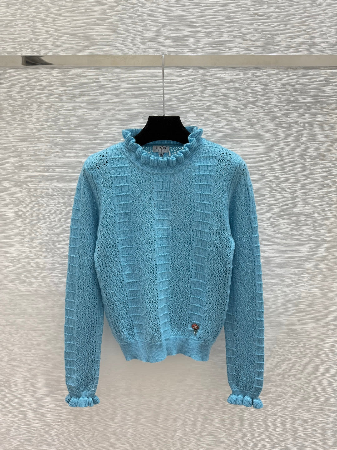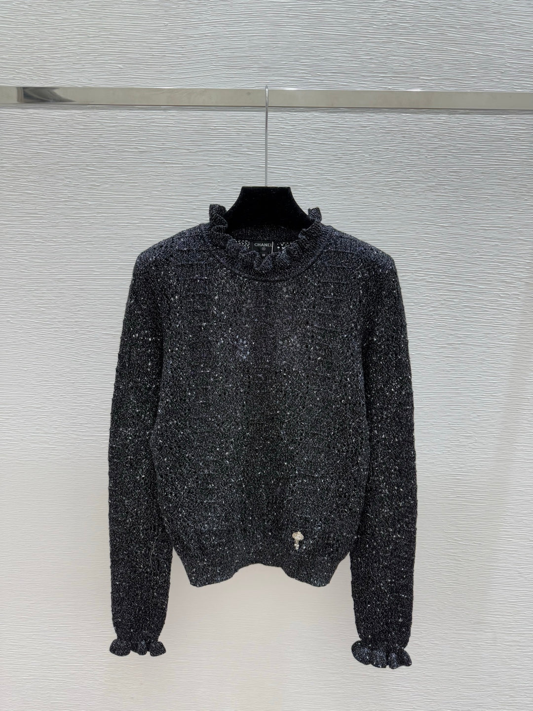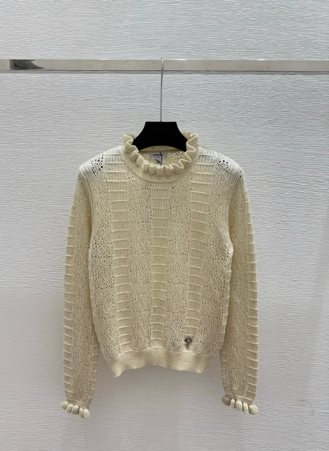 CC 25 Ruffled Gold and Silver Hollow-Out Crew Neck Knit Long Sleeve Cashmere