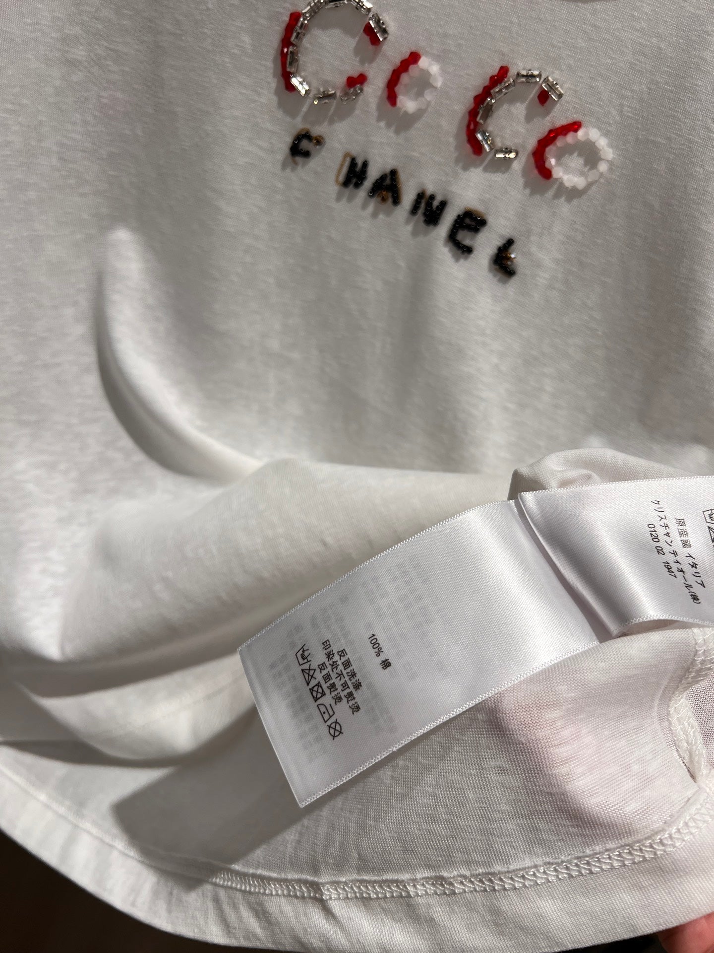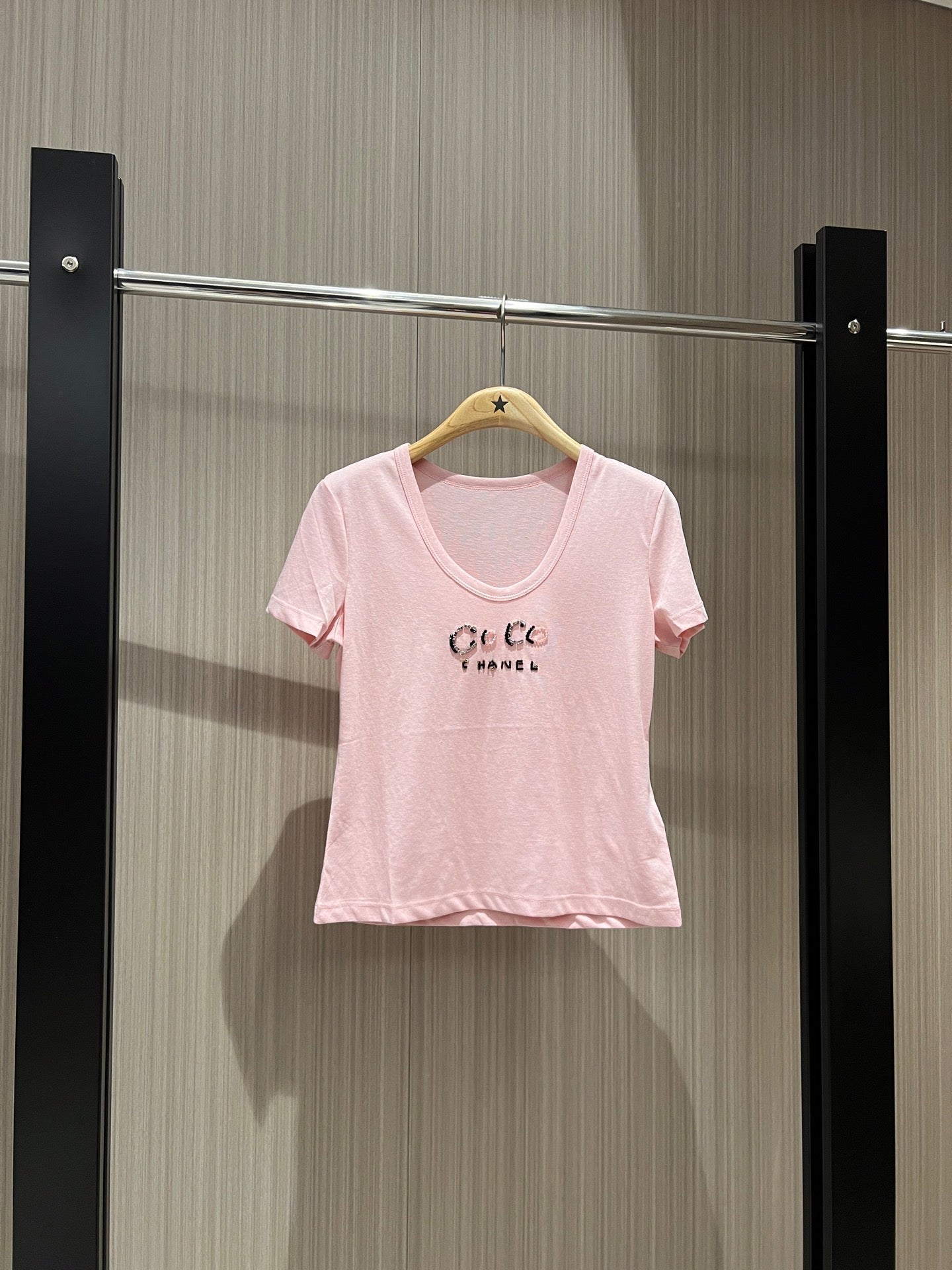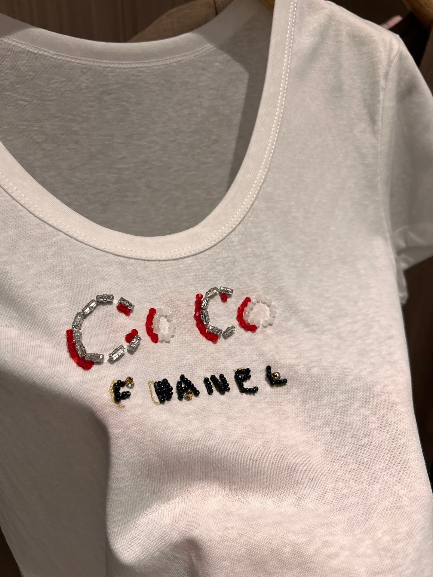 CC Hand-beaded Coco letter U-neck T-shirt Cotton
