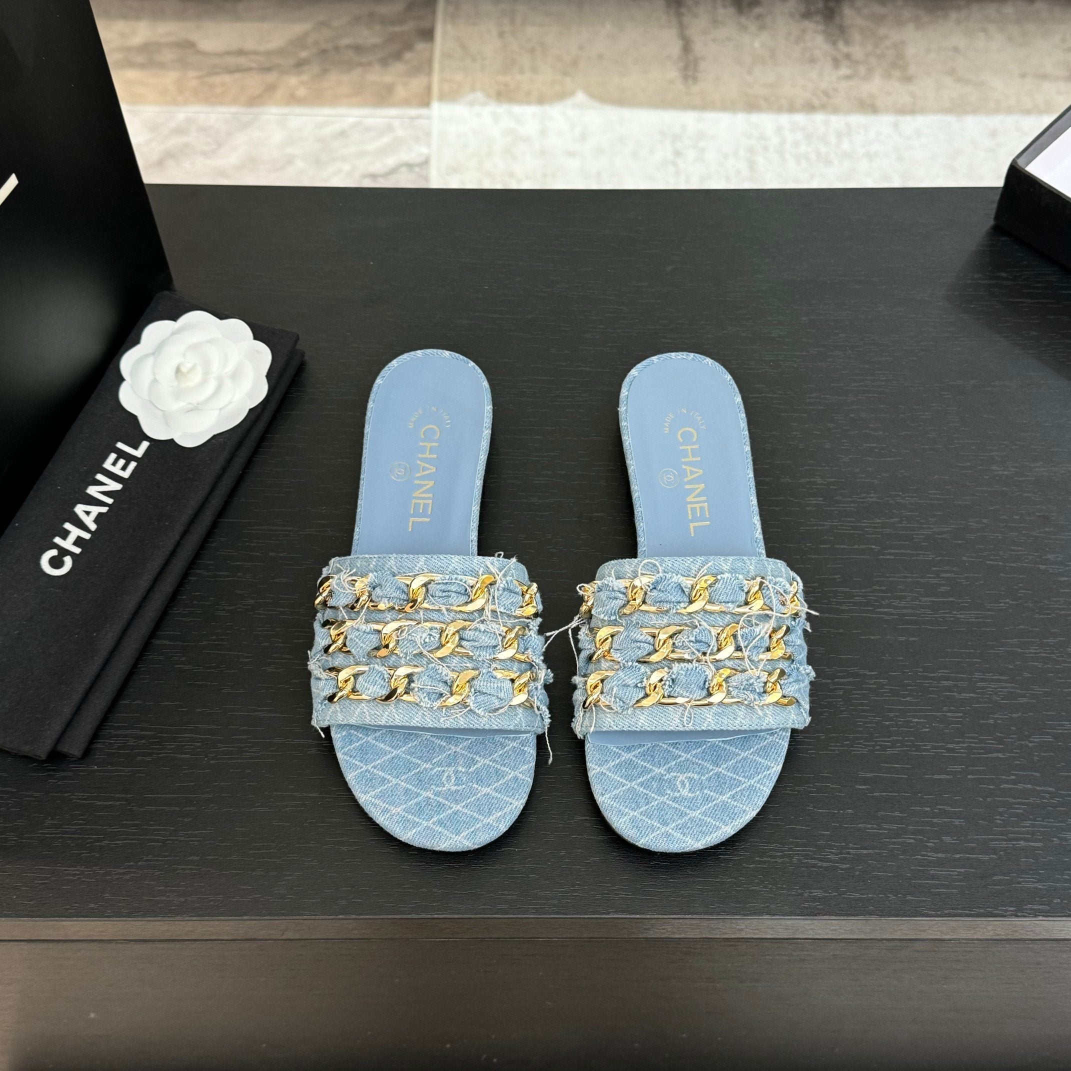 CC 25B Flat Mule Sandals Light Blue Denim With Chain 373813