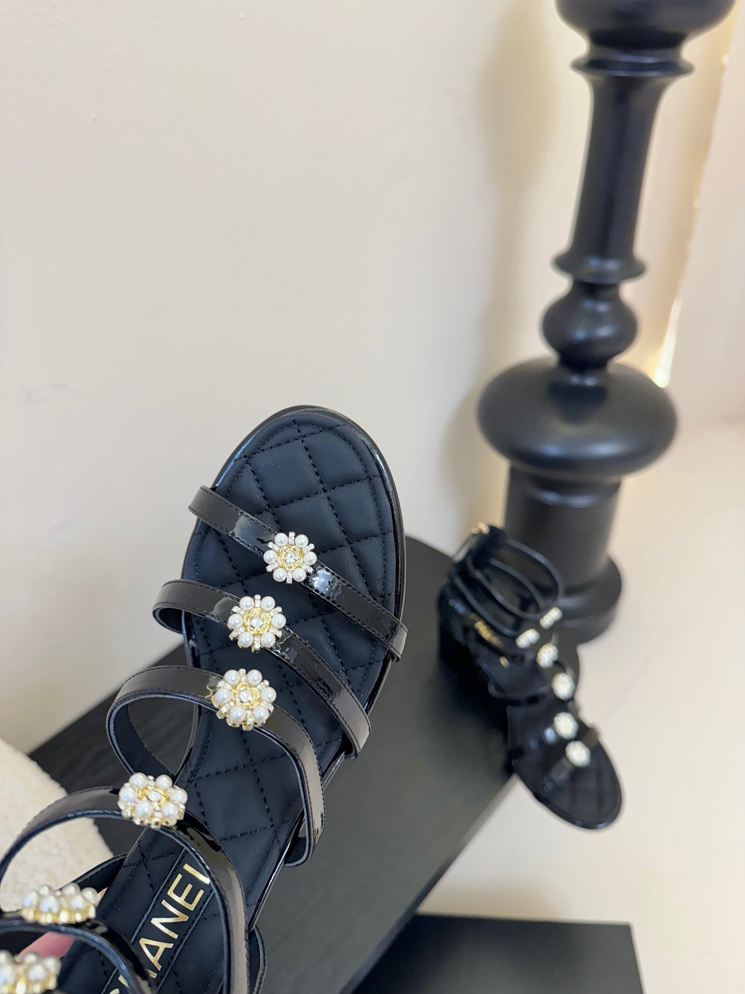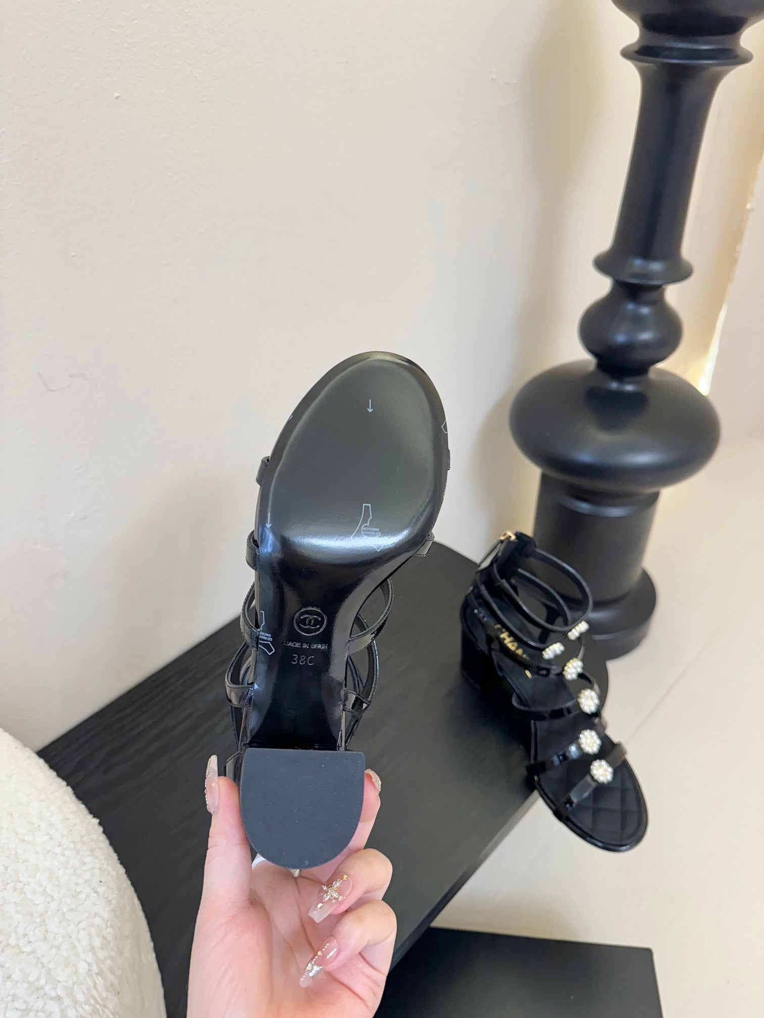 CC 25SS Camellia Multi Straps Heel Sandal 60mm Black Sheepskin 351434