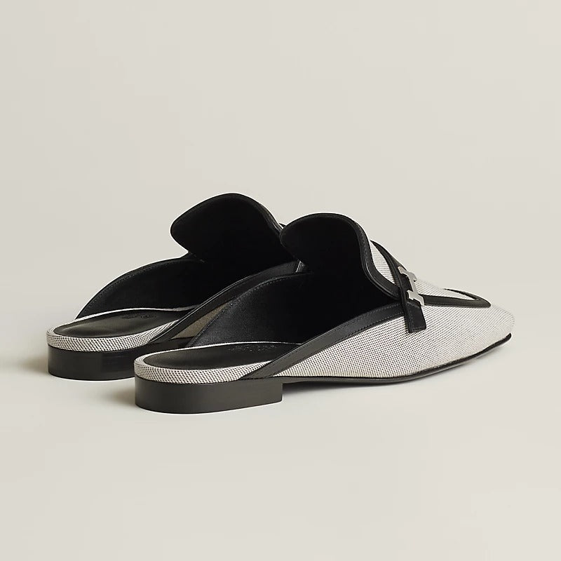 - Material: Mule in H canvas and calfskin with miniature permabrass-plated Paris buckle and contrasting piping.